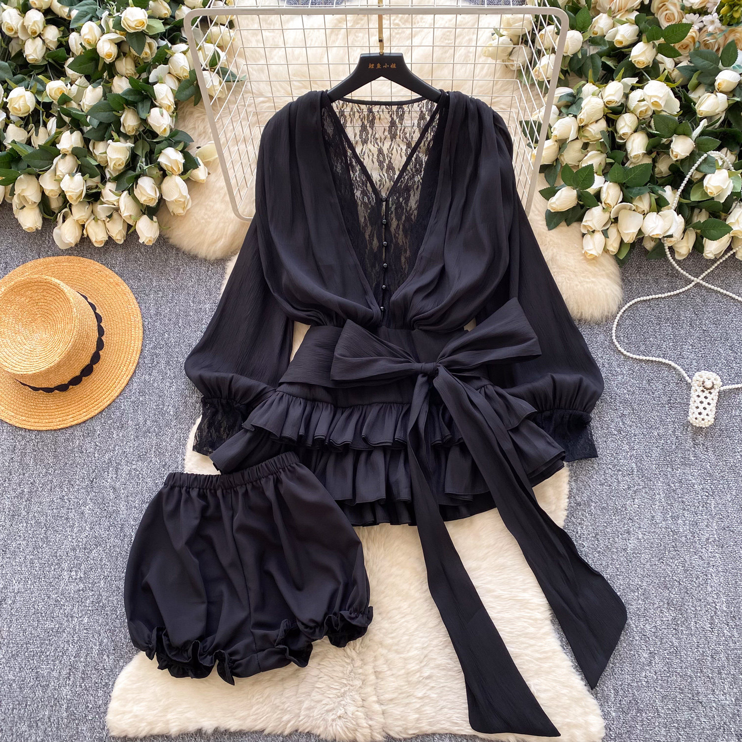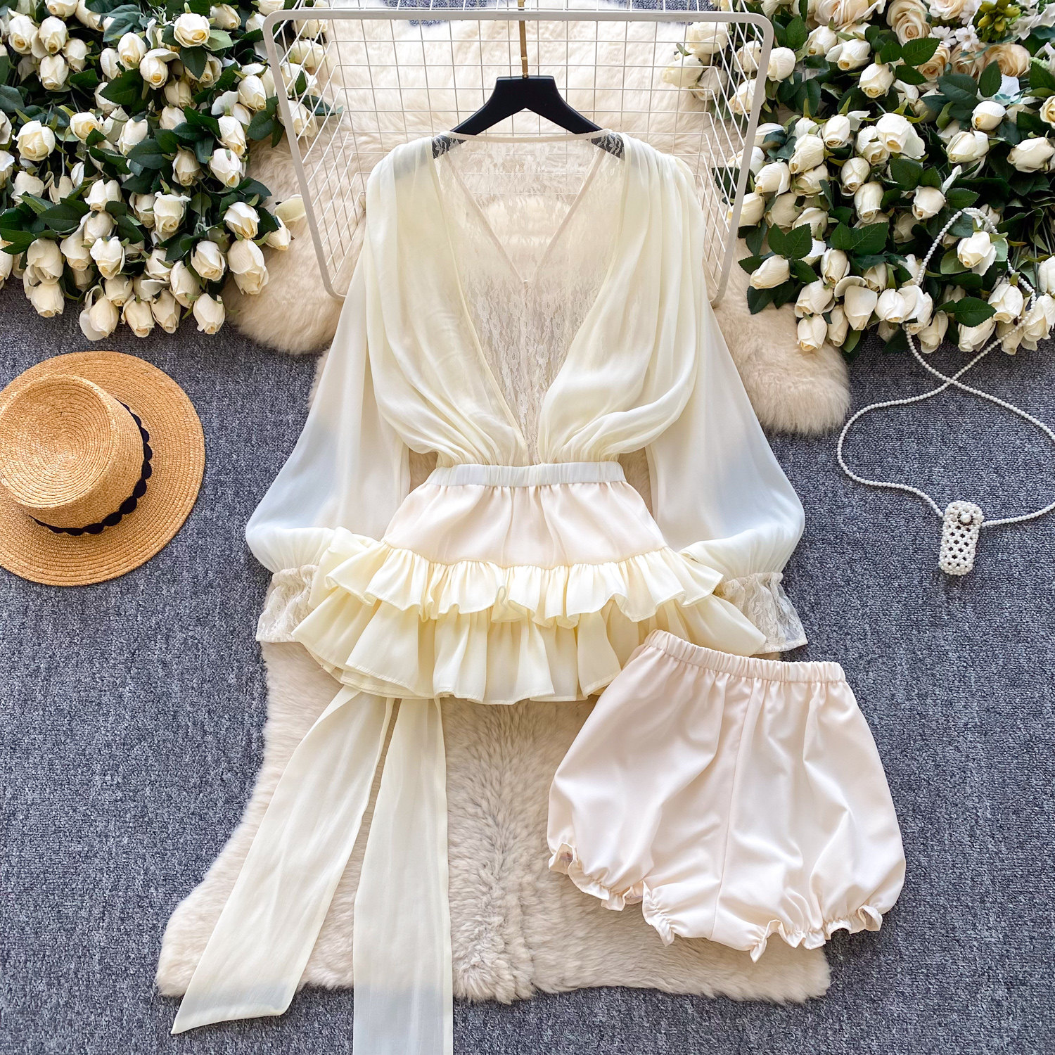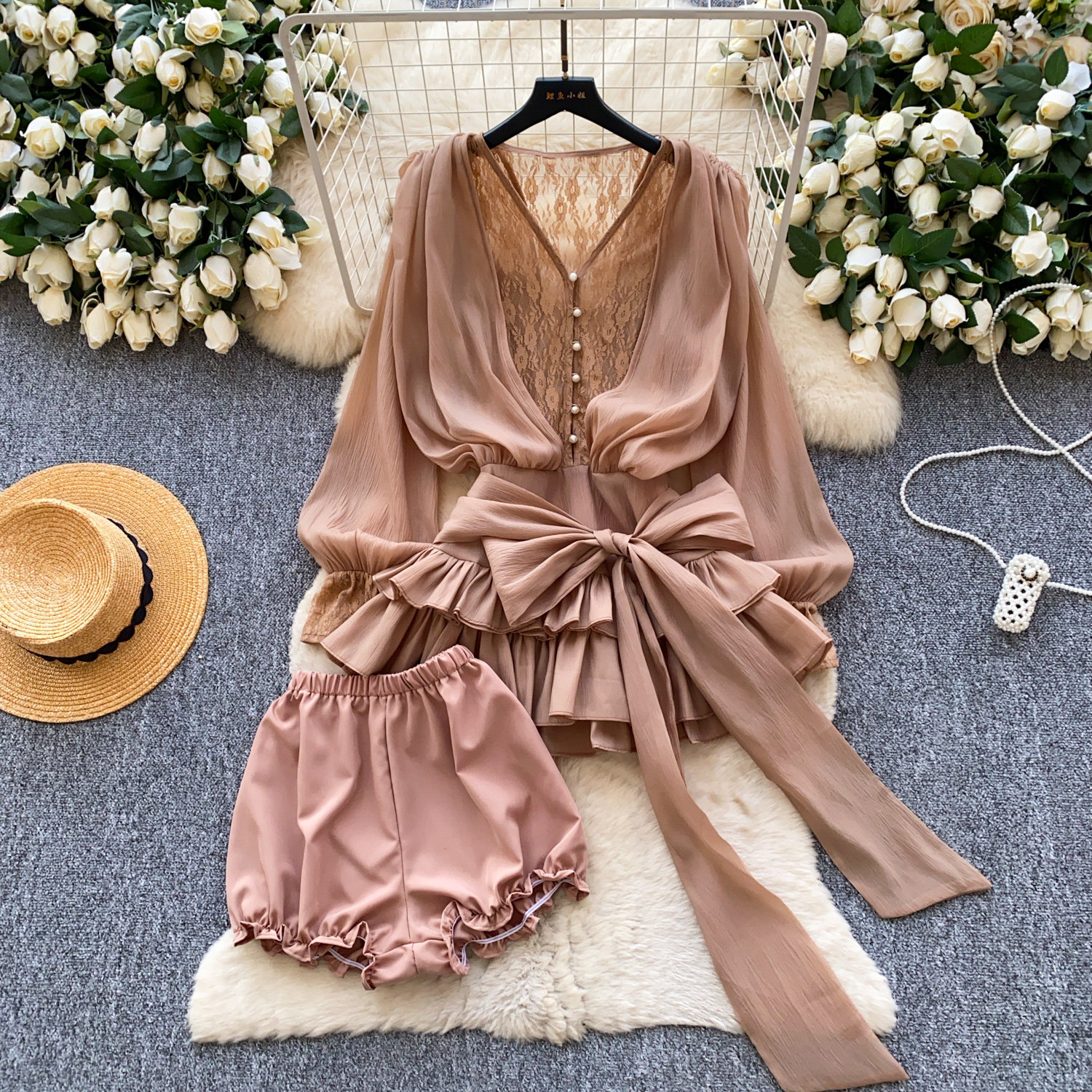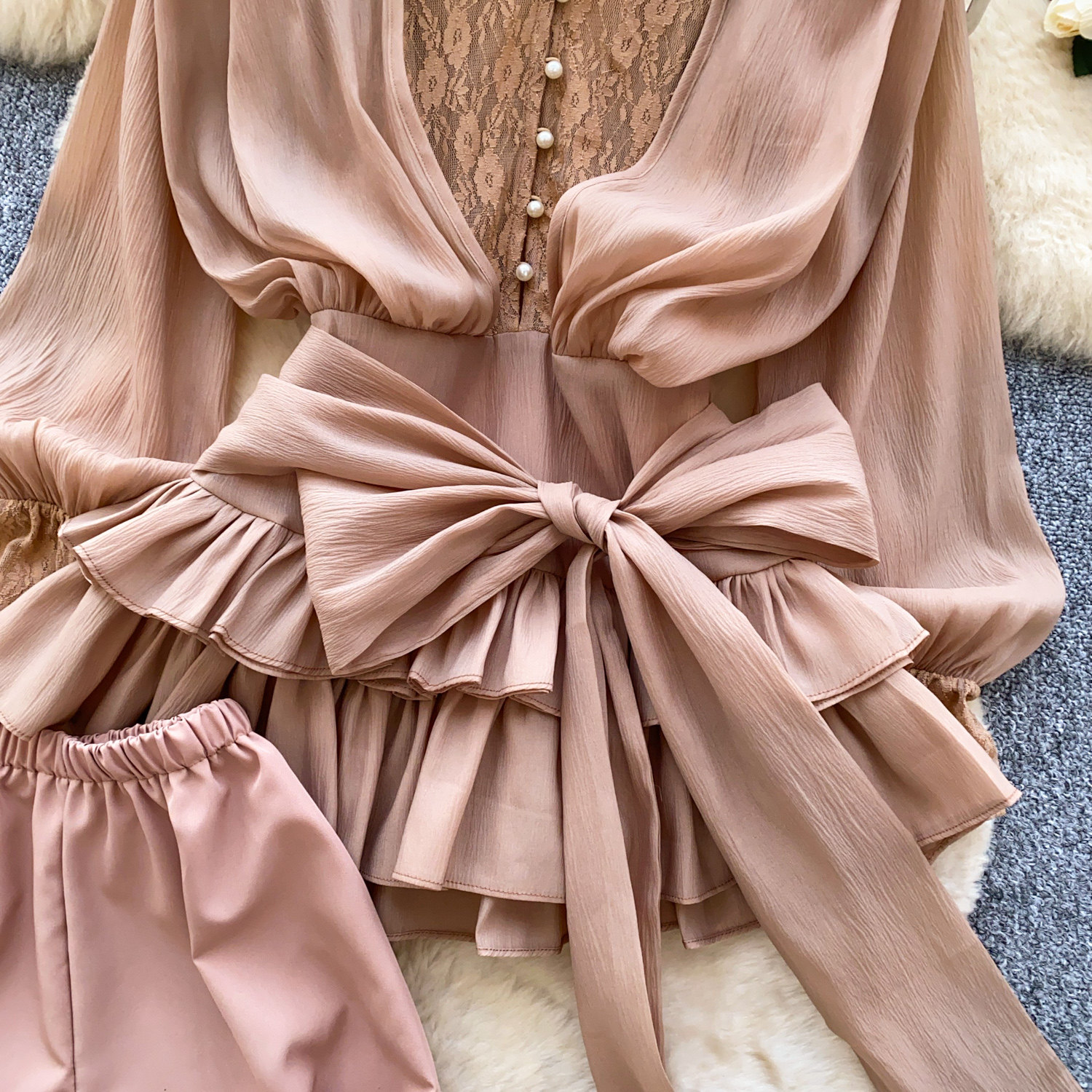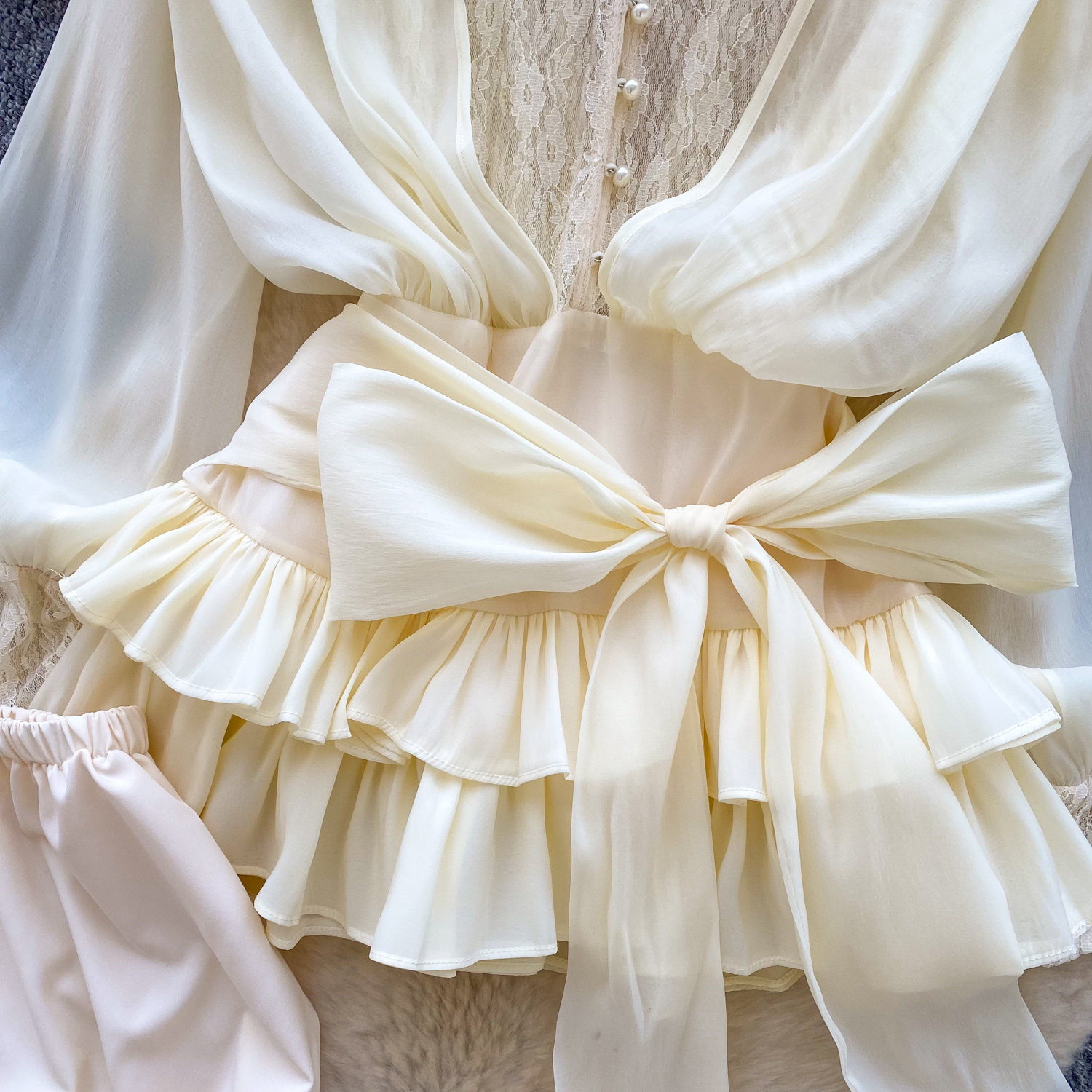 仙女氛圍感小衆蝴蝶結綁帶收腰蕾絲拼接長袖荷葉邊網紗連衣裙短褲