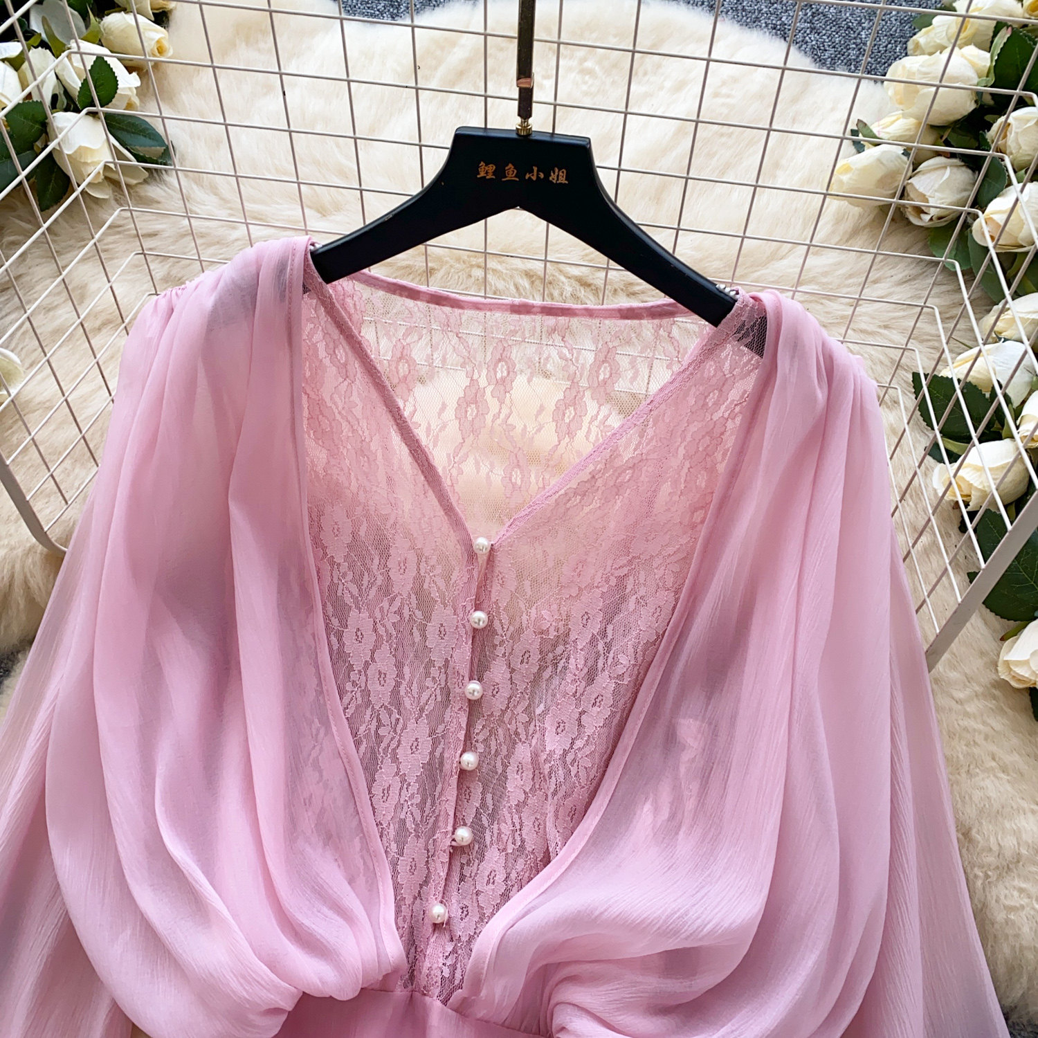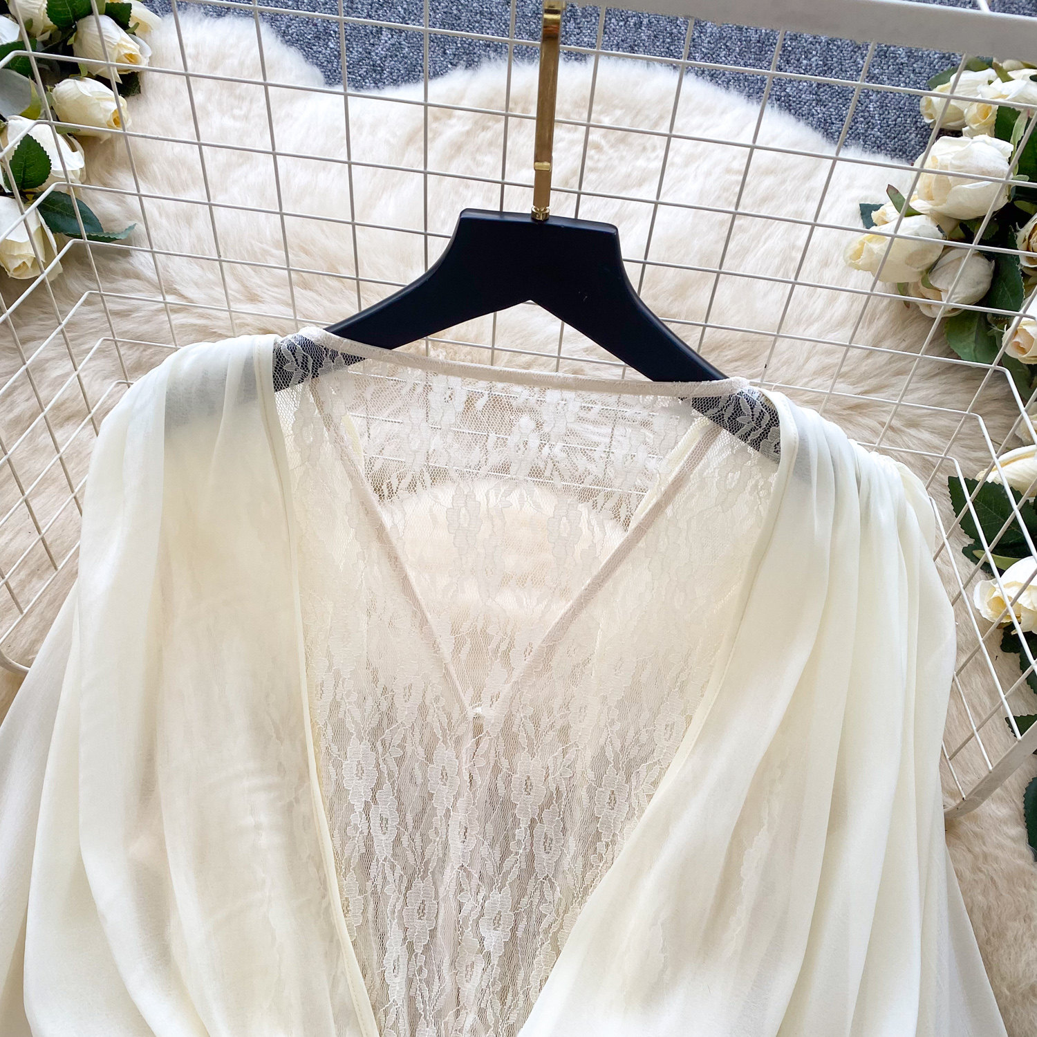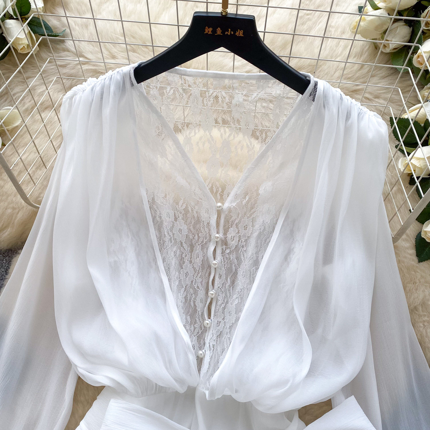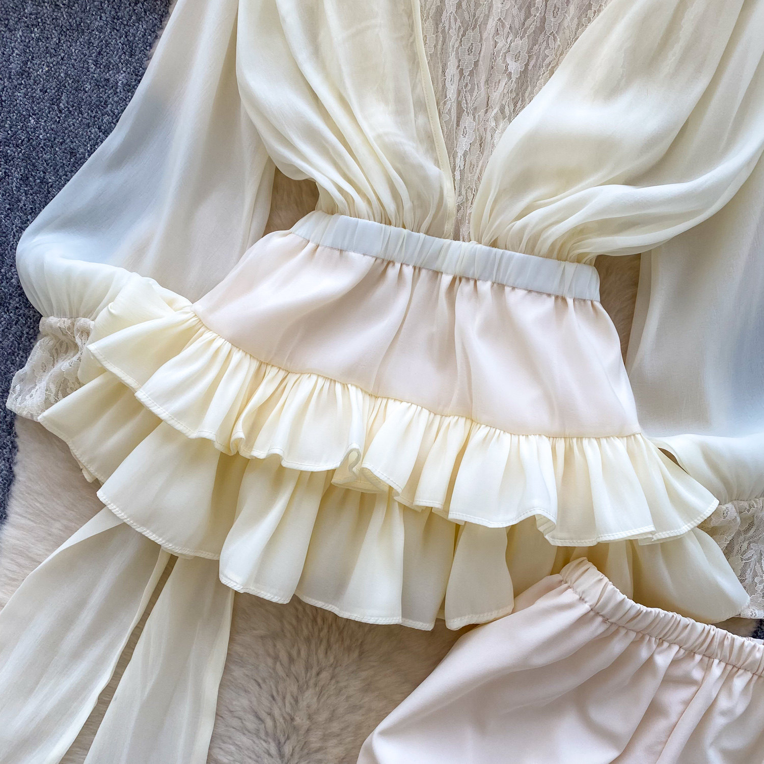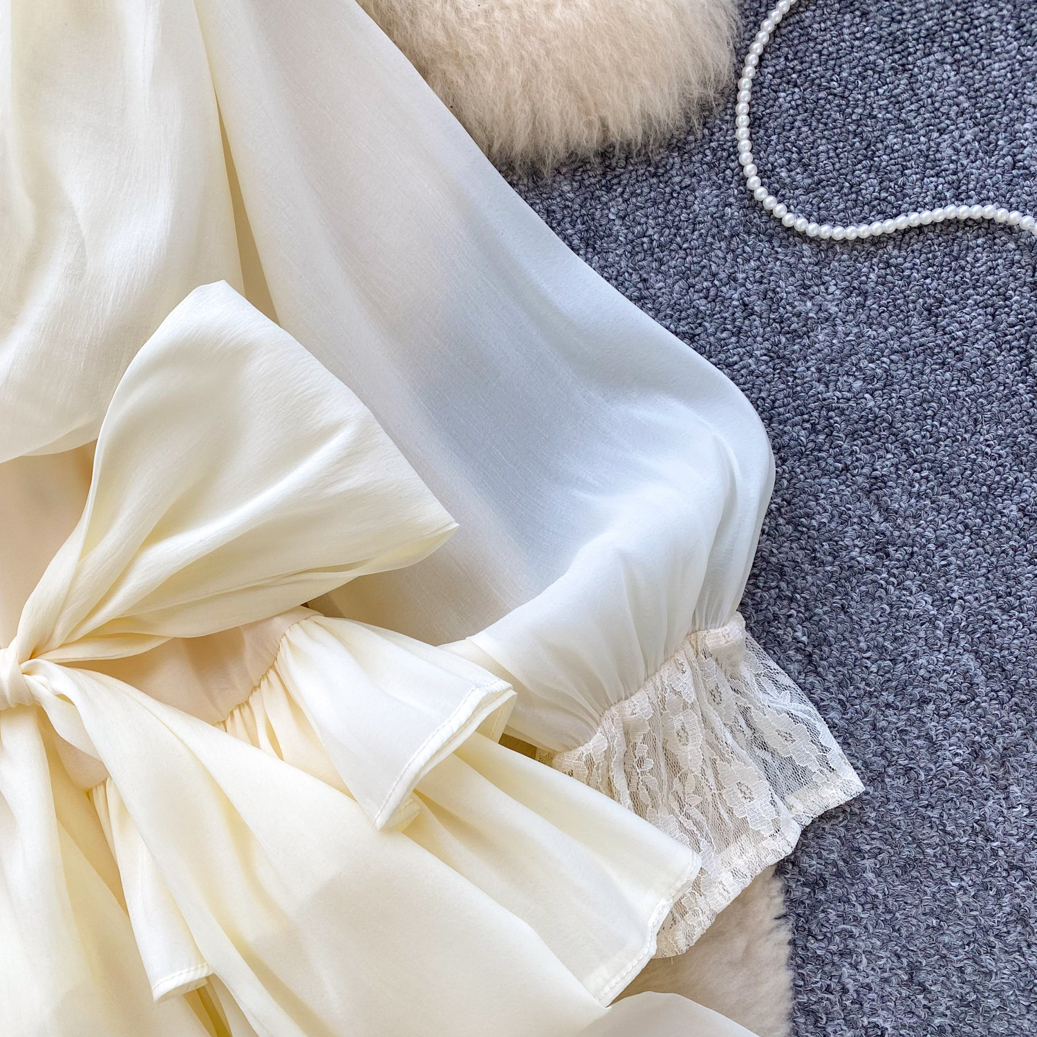 仙女氛圍感小衆蝴蝶結綁帶收腰蕾絲拼接長袖荷葉邊網紗連衣裙短褲