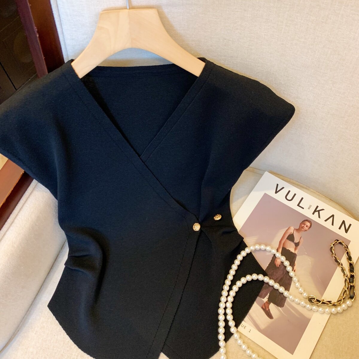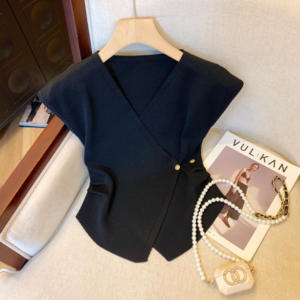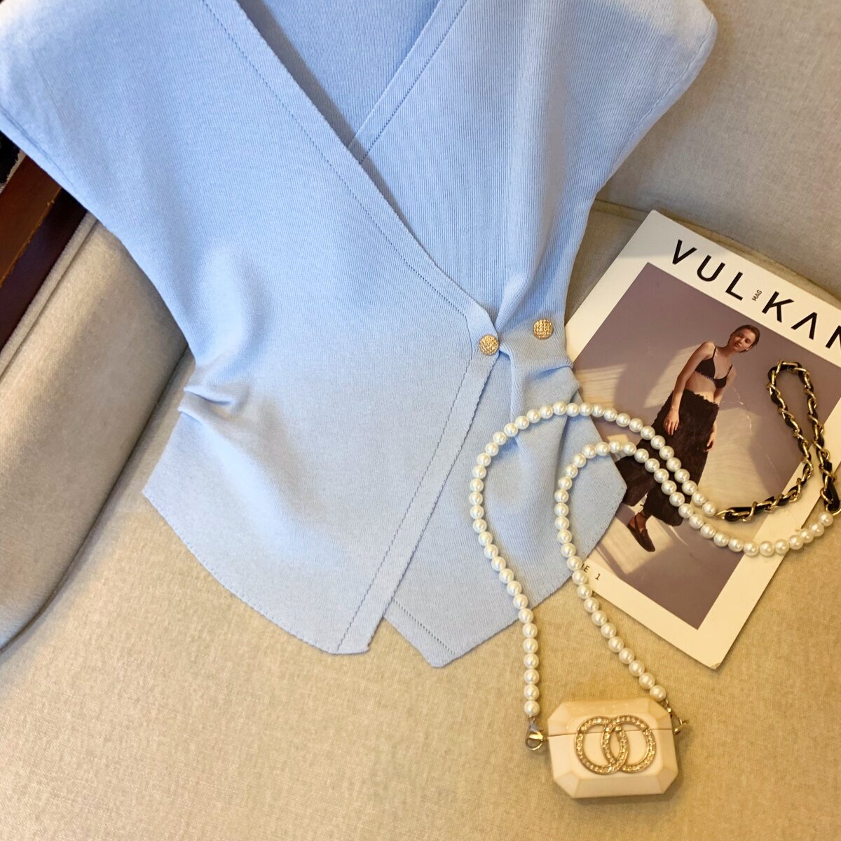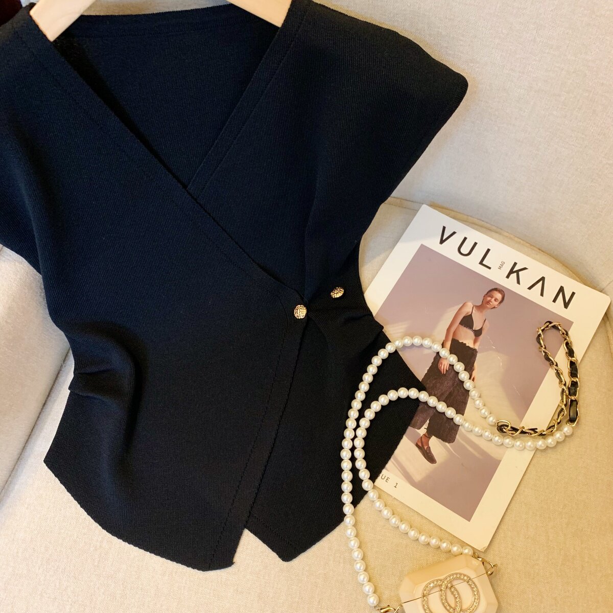 專櫃撤廻剪標法式不規則交叉V領針織衫女夏季新款時尚氣質短上衣