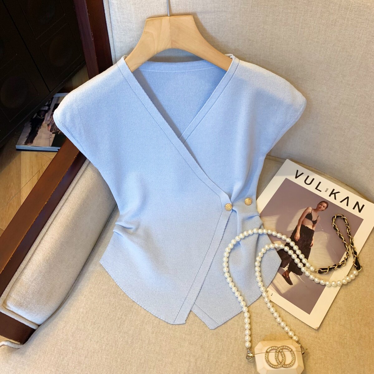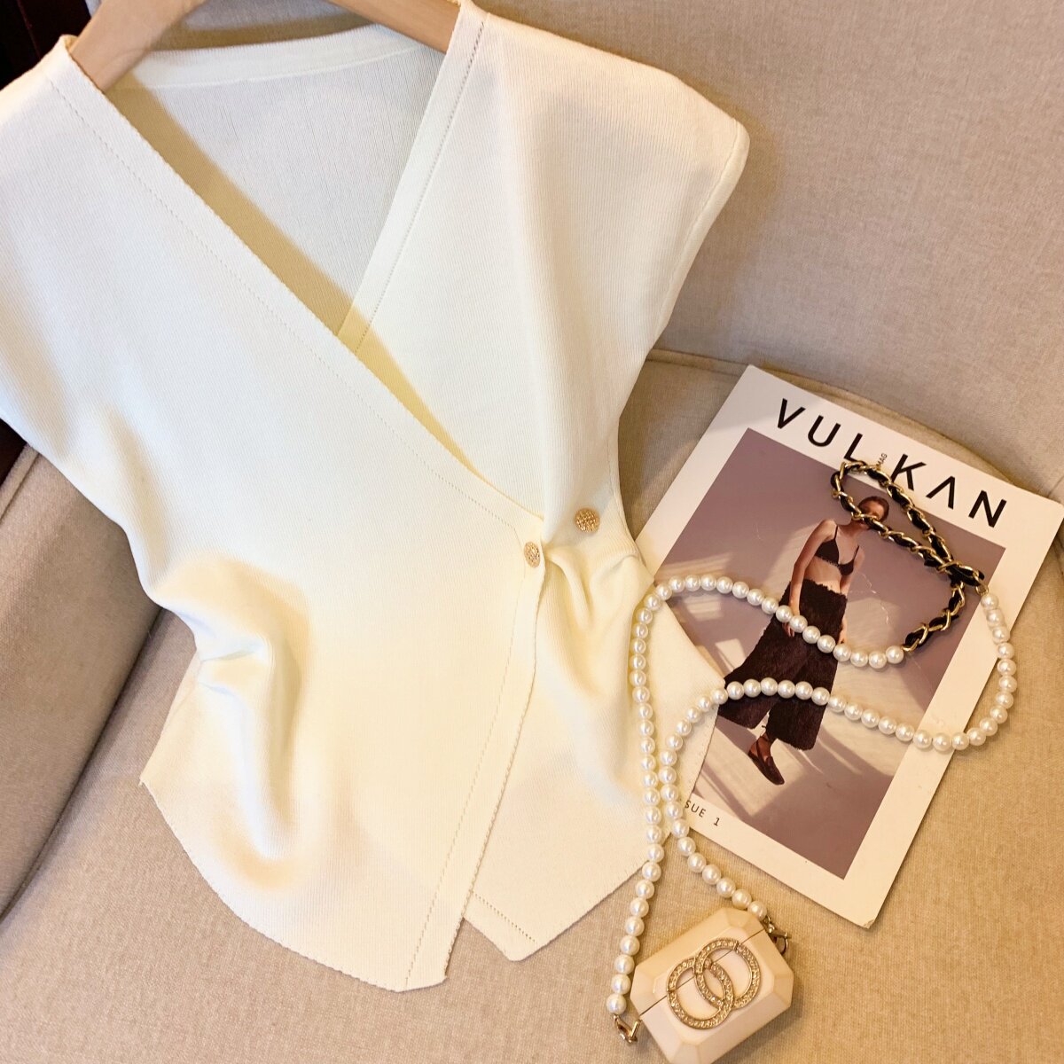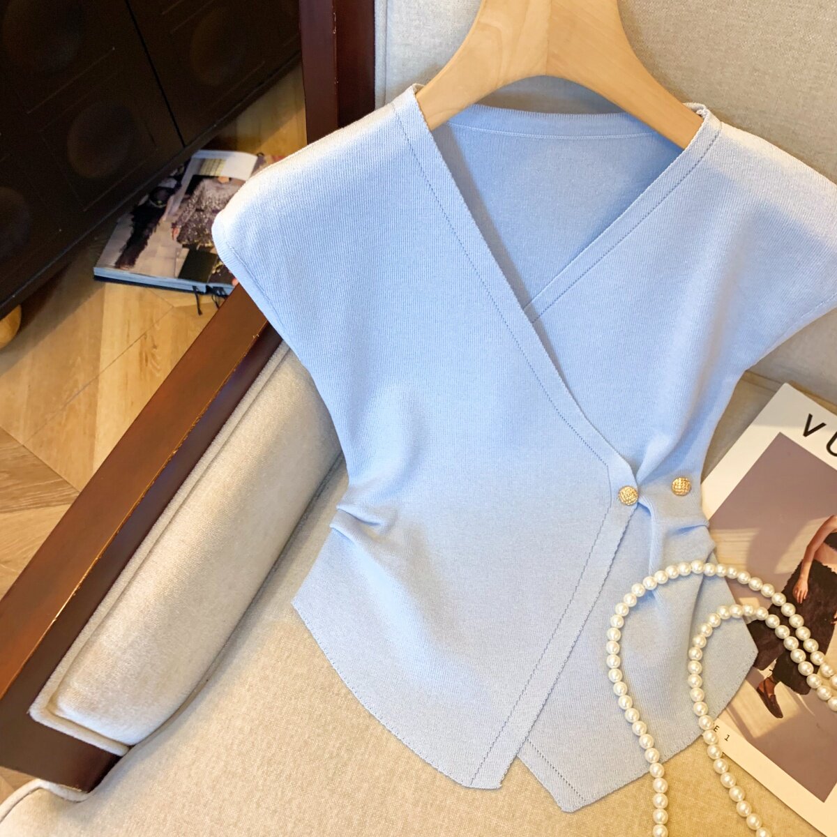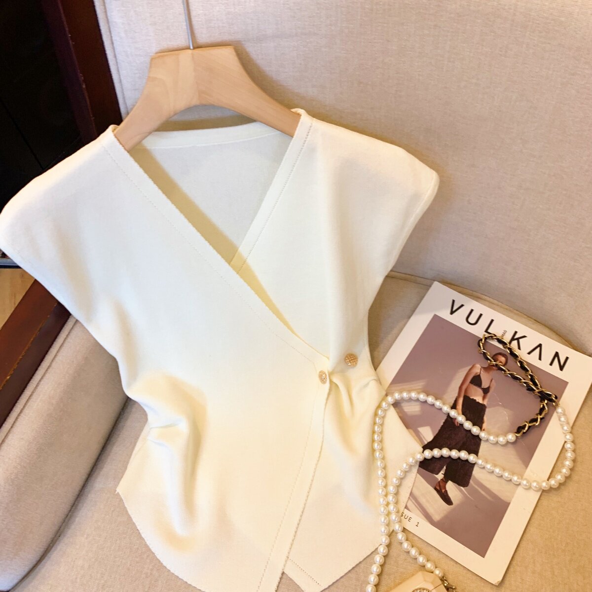 專櫃撤廻剪標法式不規則交叉V領針織衫女夏季新款時尚氣質短上衣