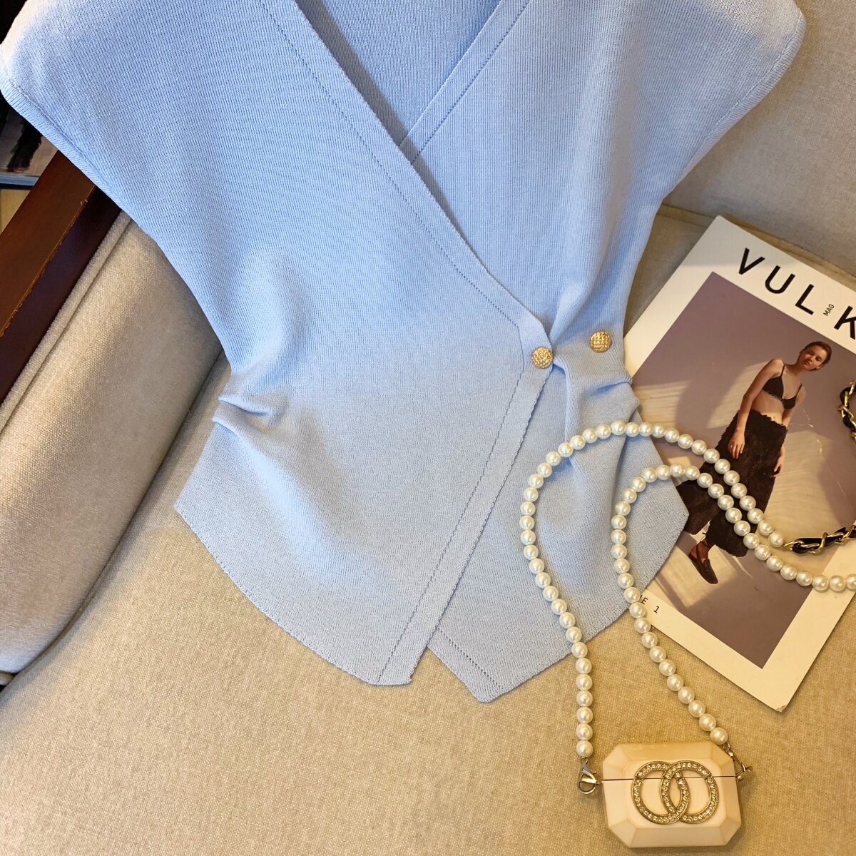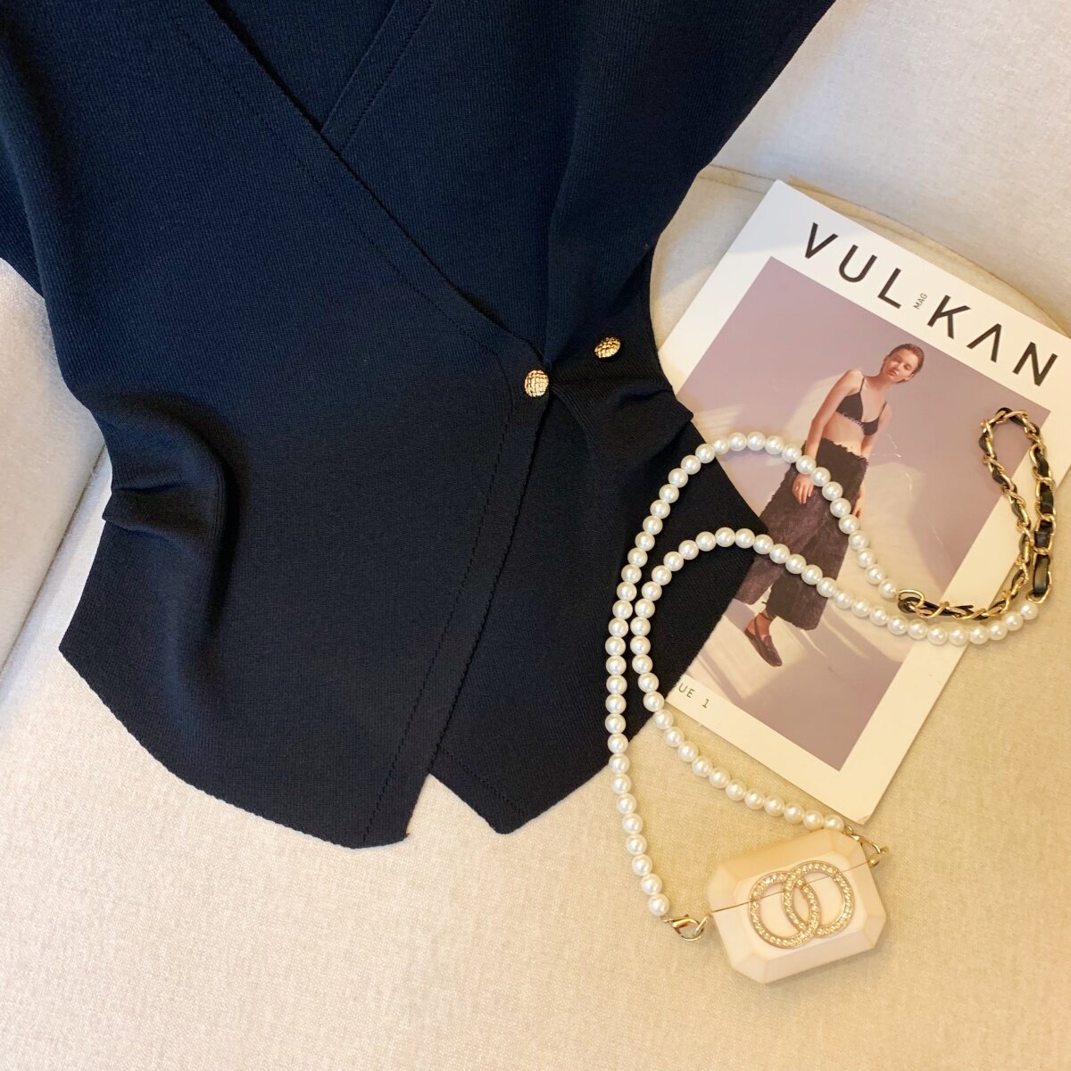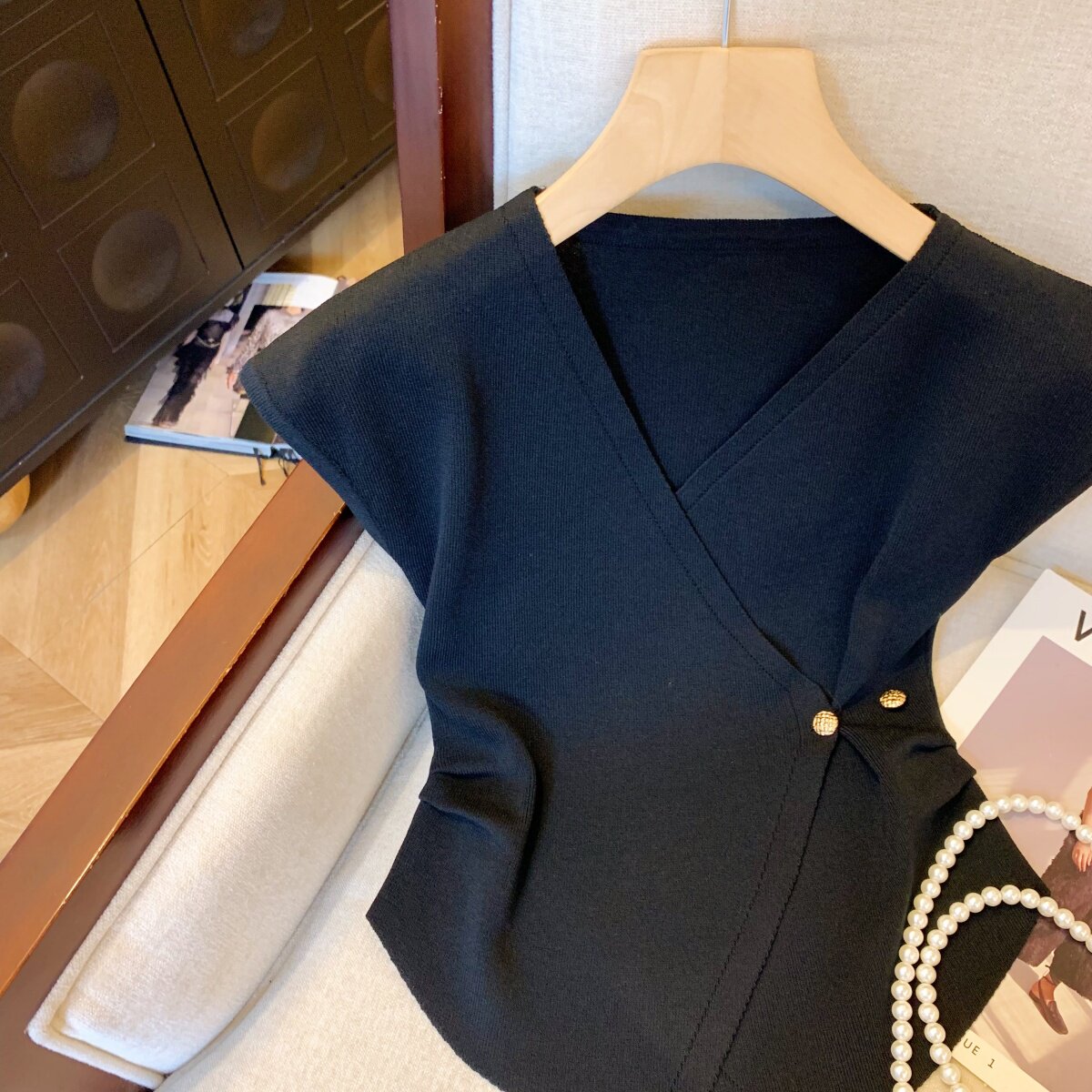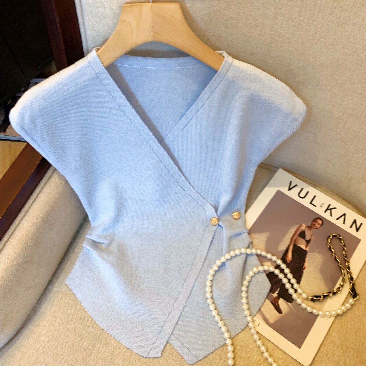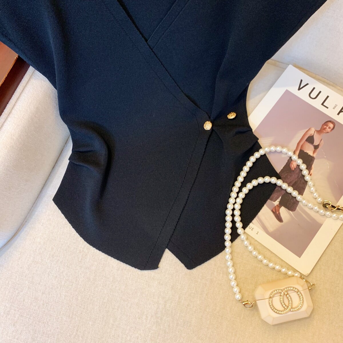 專櫃撤廻剪標法式不規則交叉V領針織衫女夏季新款時尚氣質短上衣