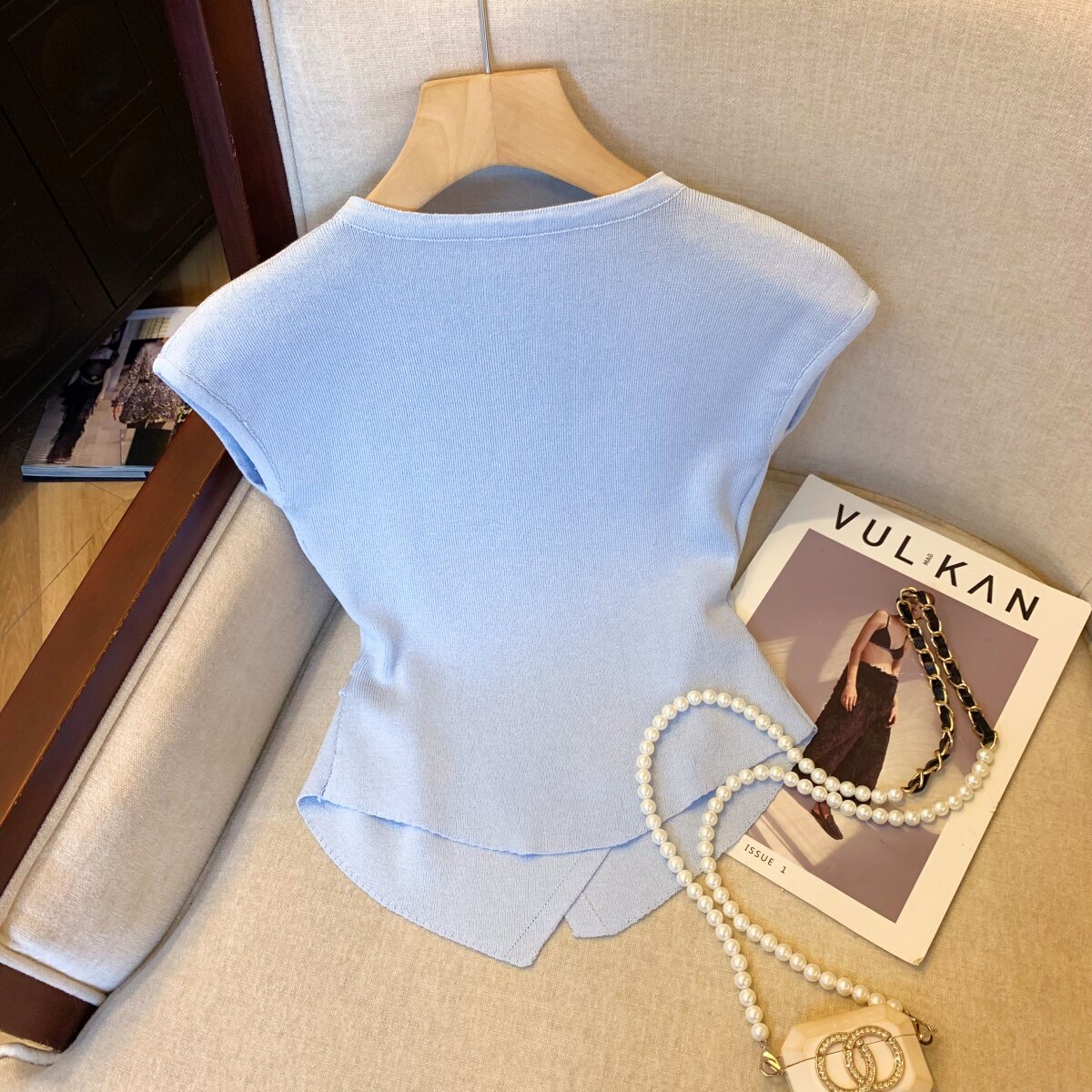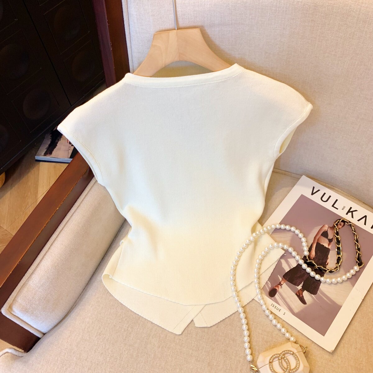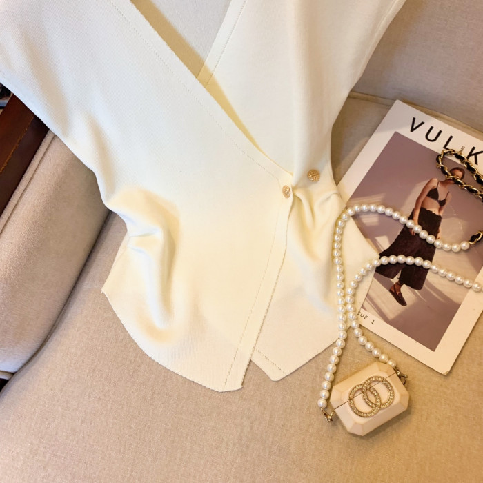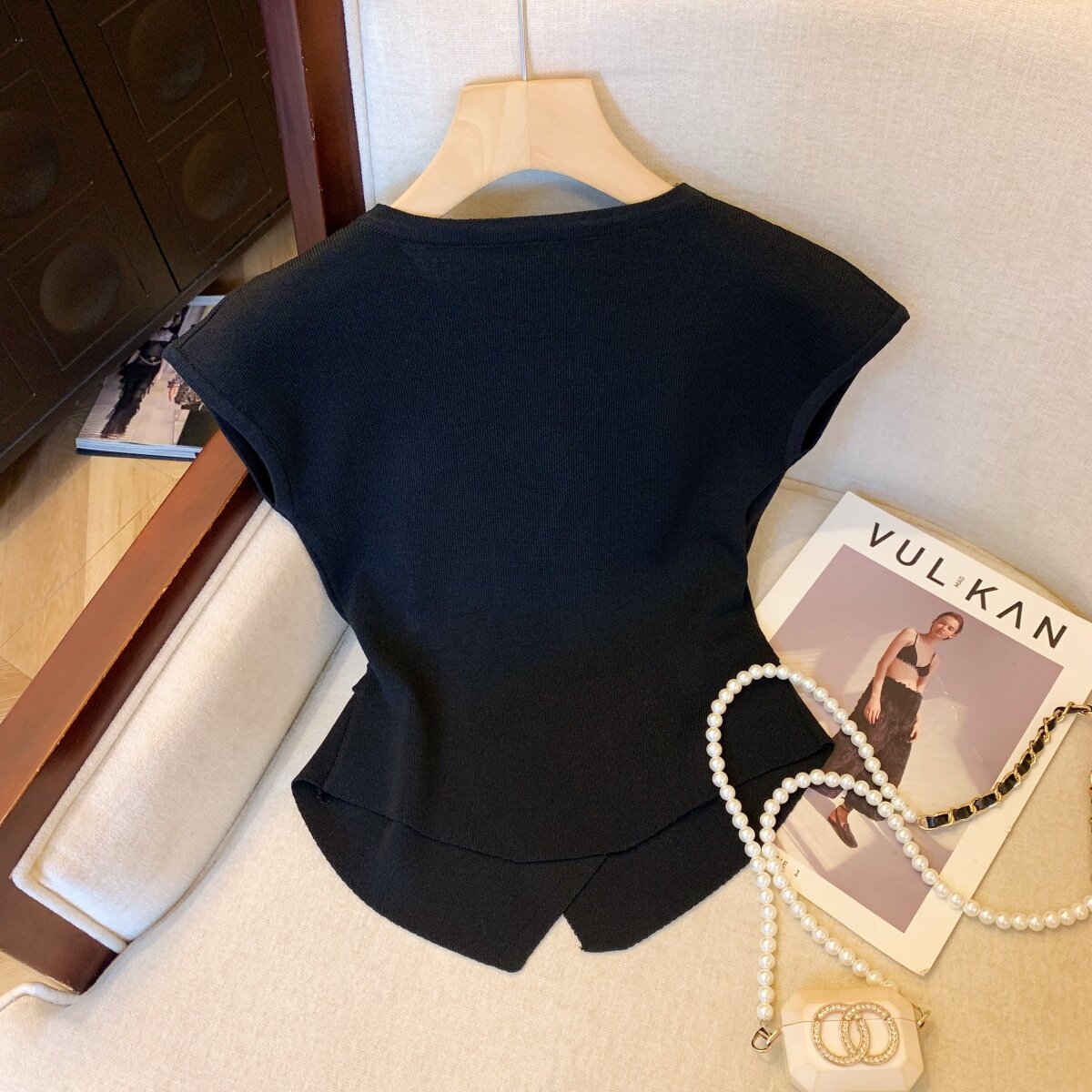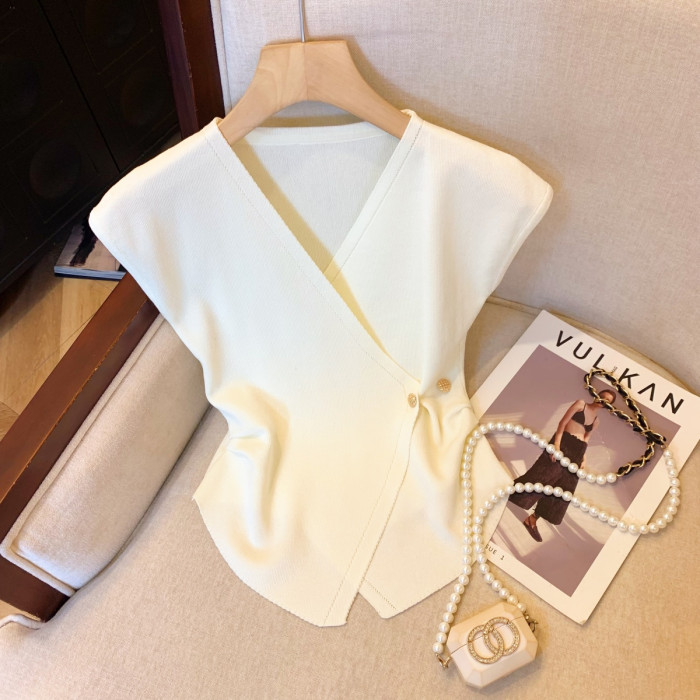 專櫃撤廻剪標法式不規則交叉V領針織衫女夏季新款時尚氣質短上衣