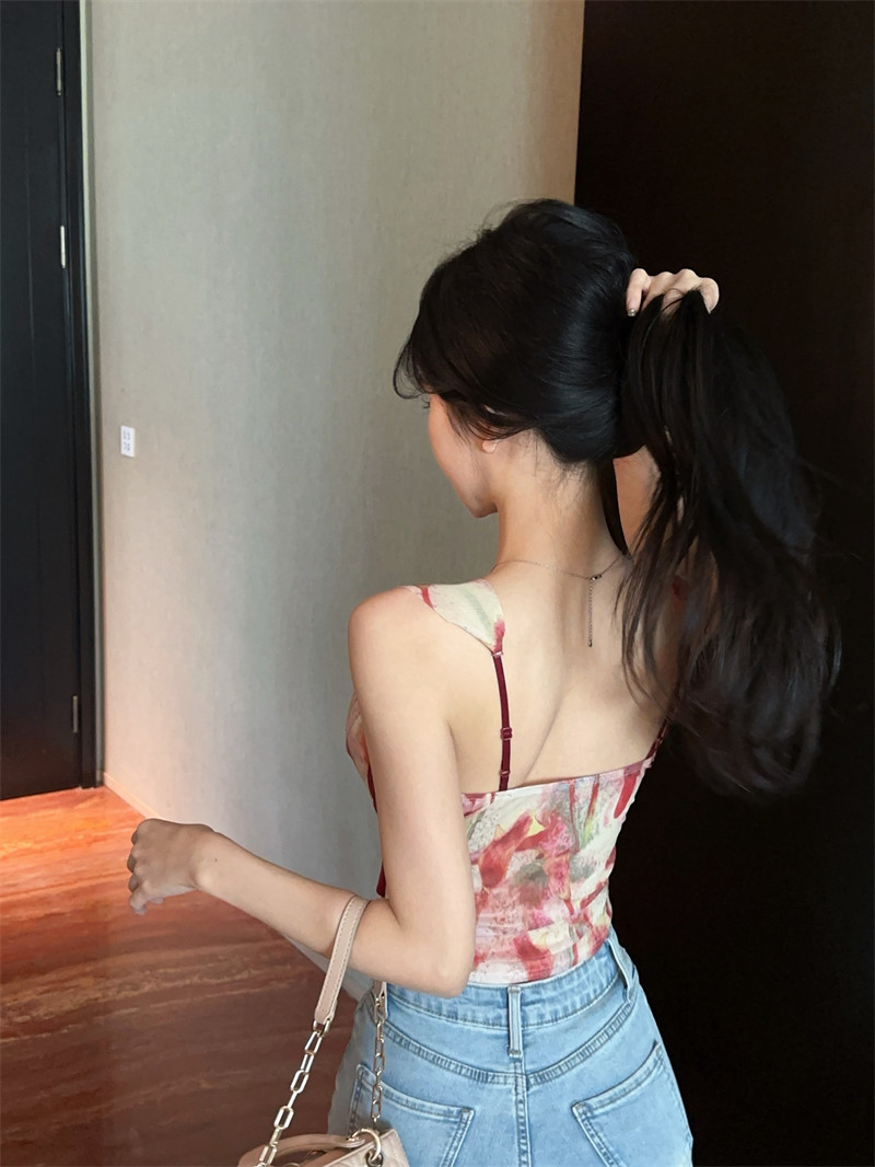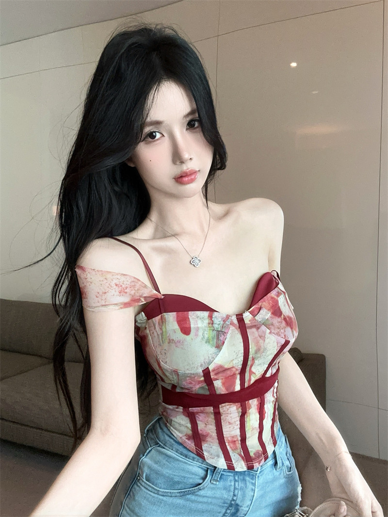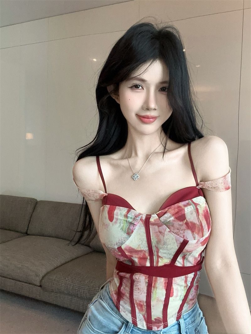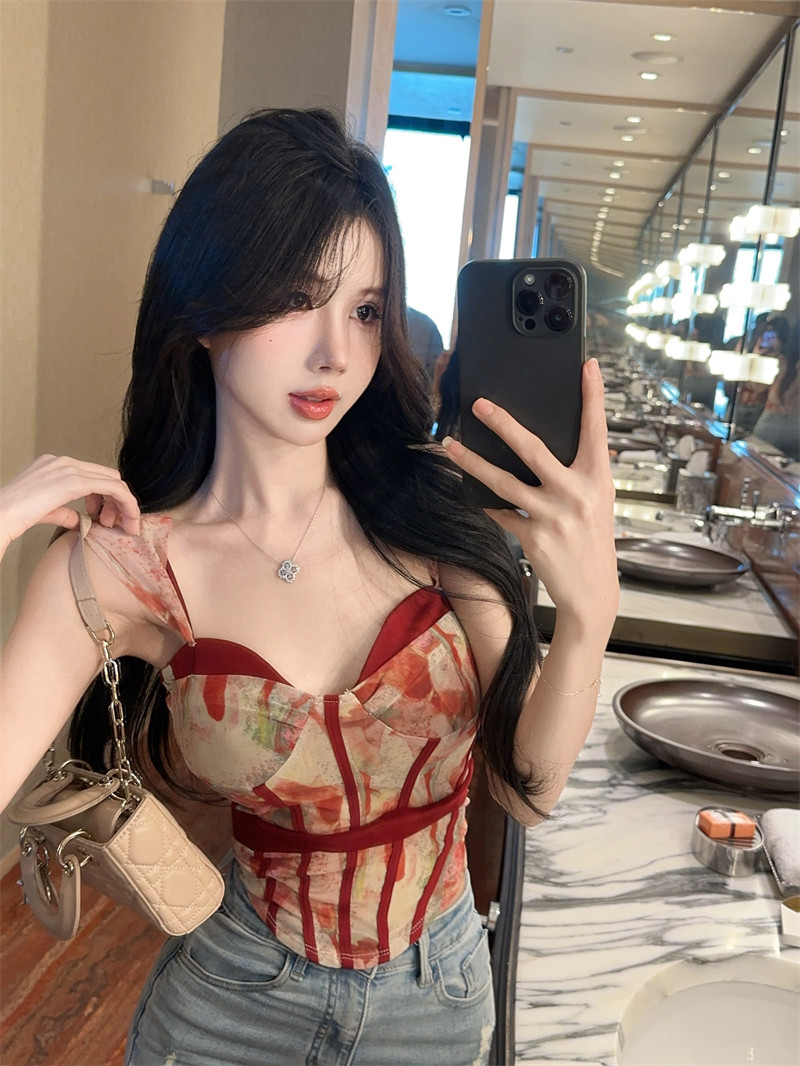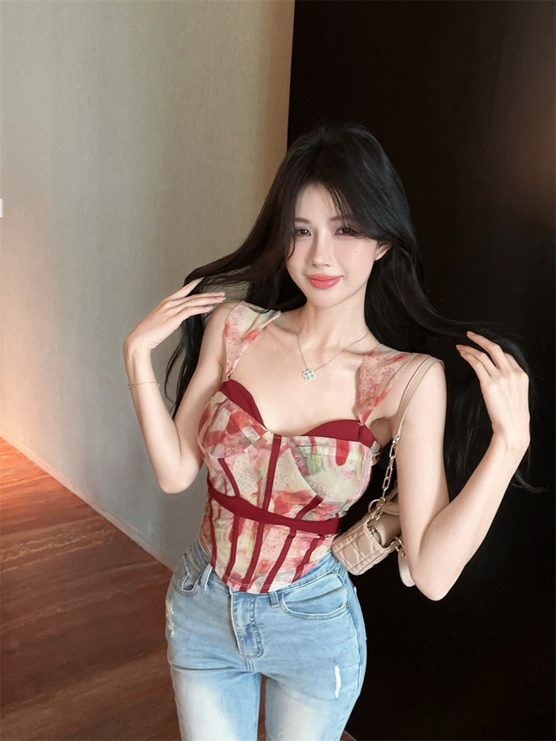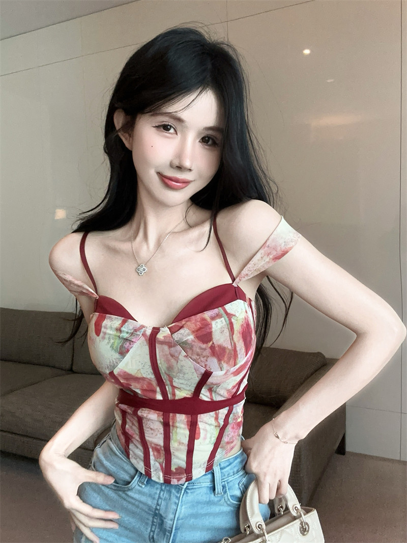 泰式印花辣妹吊帶魚骨抹胸背心女夏裝不規則顯瘦獨特絕美無袖上衣
