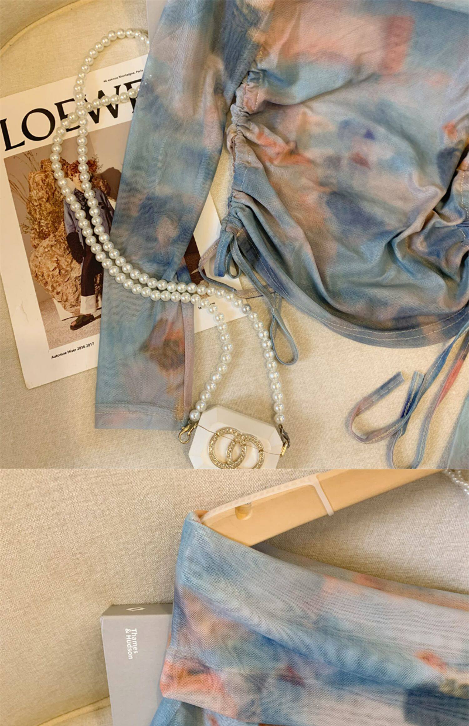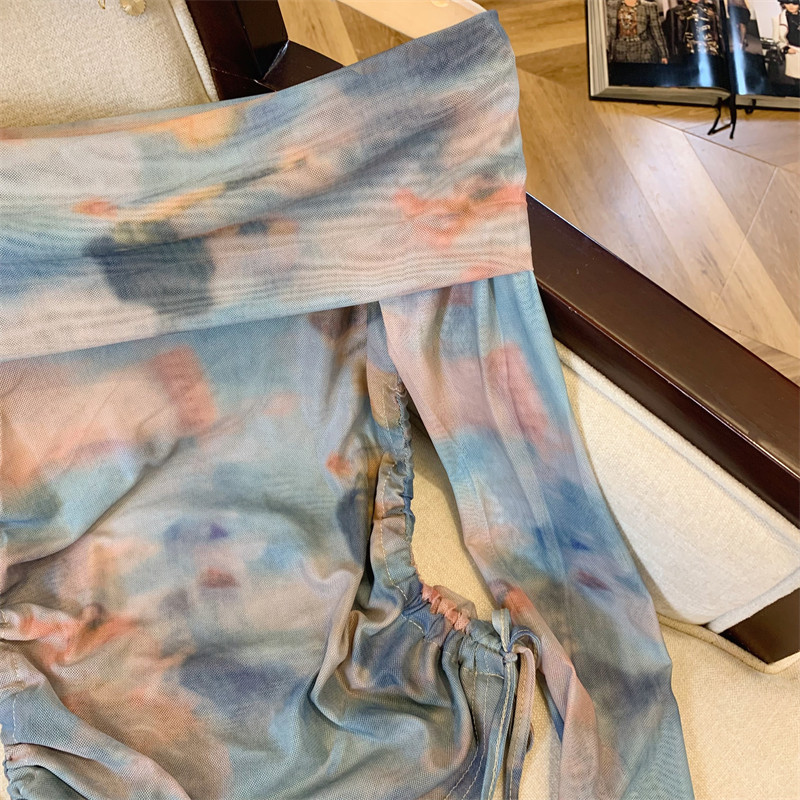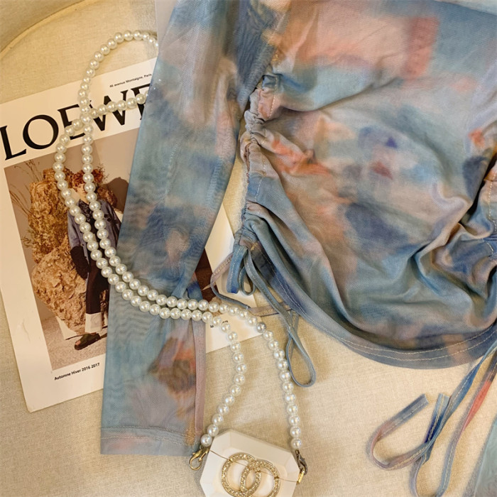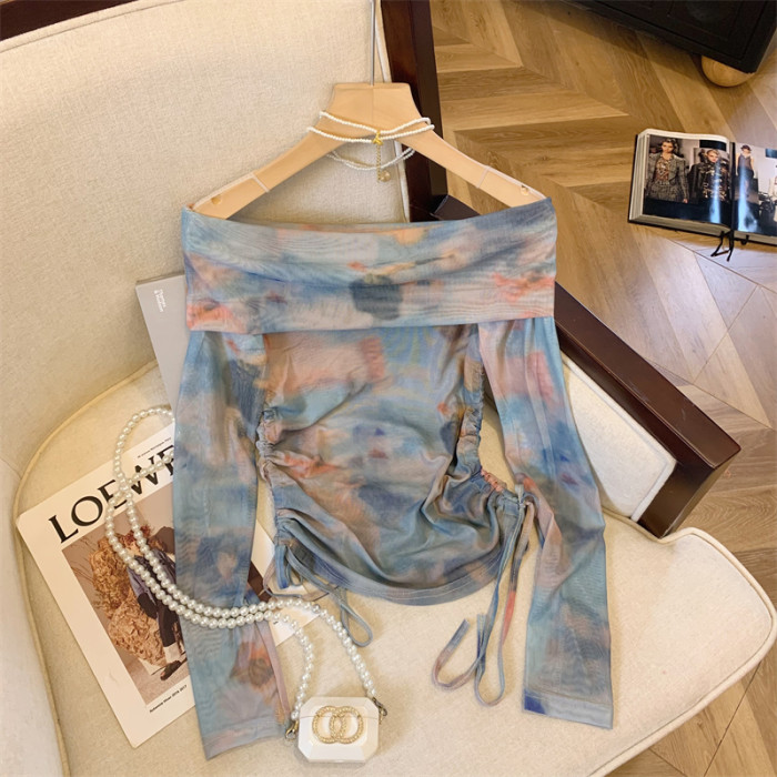 專櫃撤廻剪標美式辣妹暈染露肩長袖T恤女夏季新款時髦抽繩短上衣