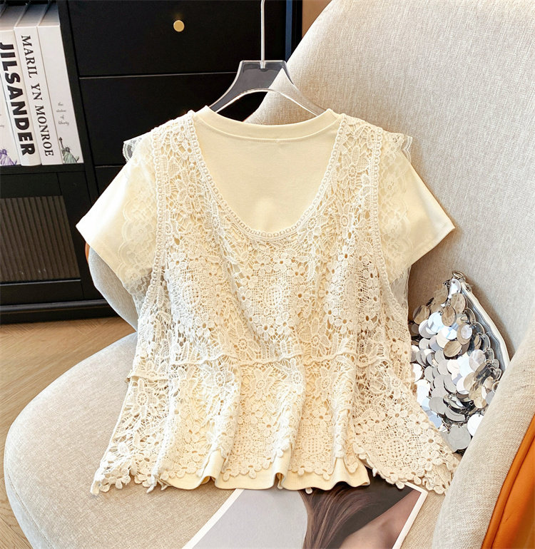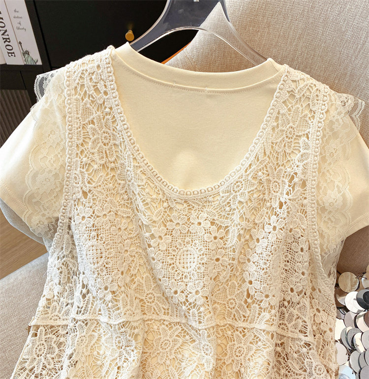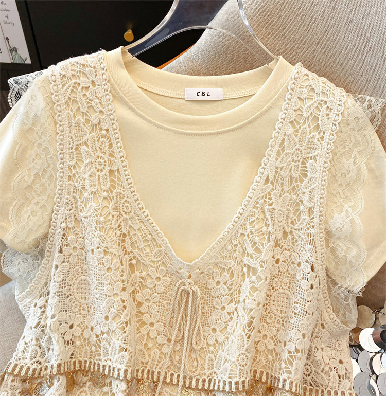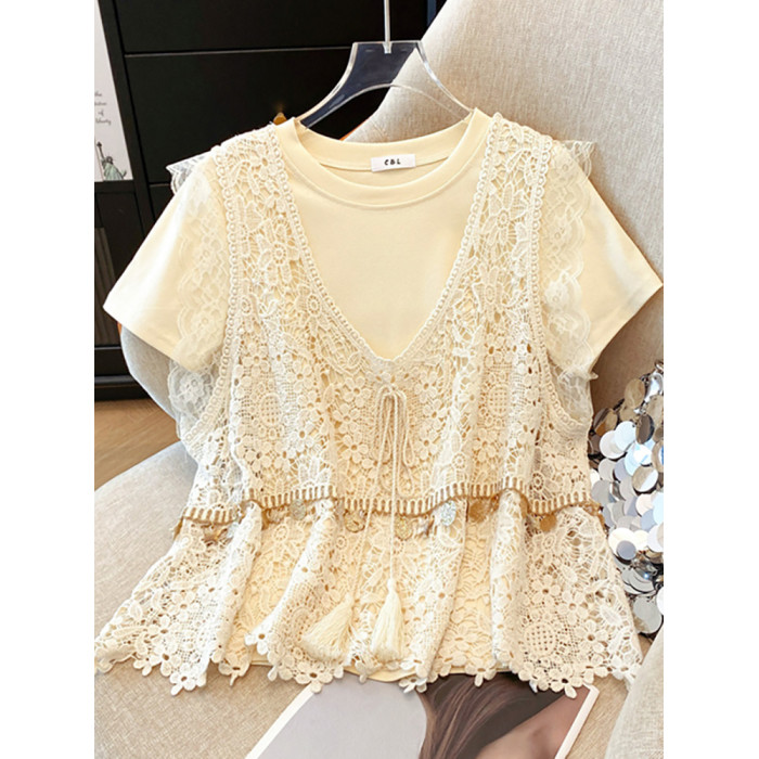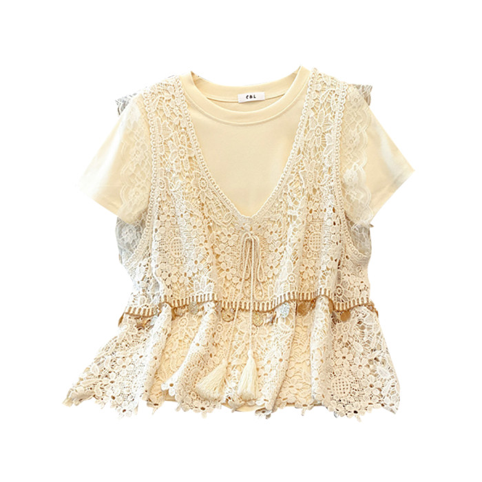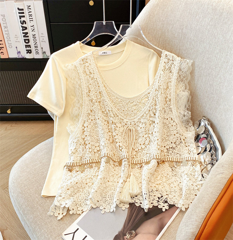 自畱款推薦~2025春夏新款蕾絲吊帶兩件套寬鬆短袖T恤女夏ins上衣