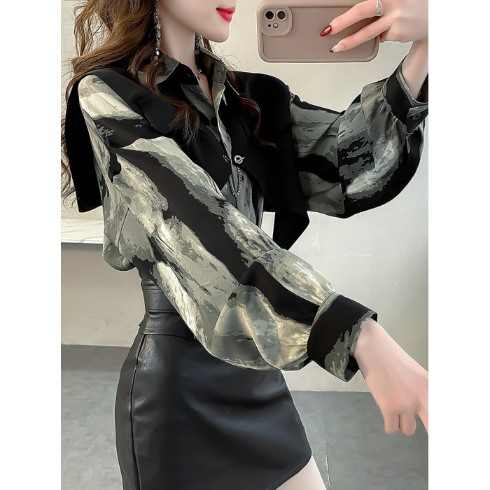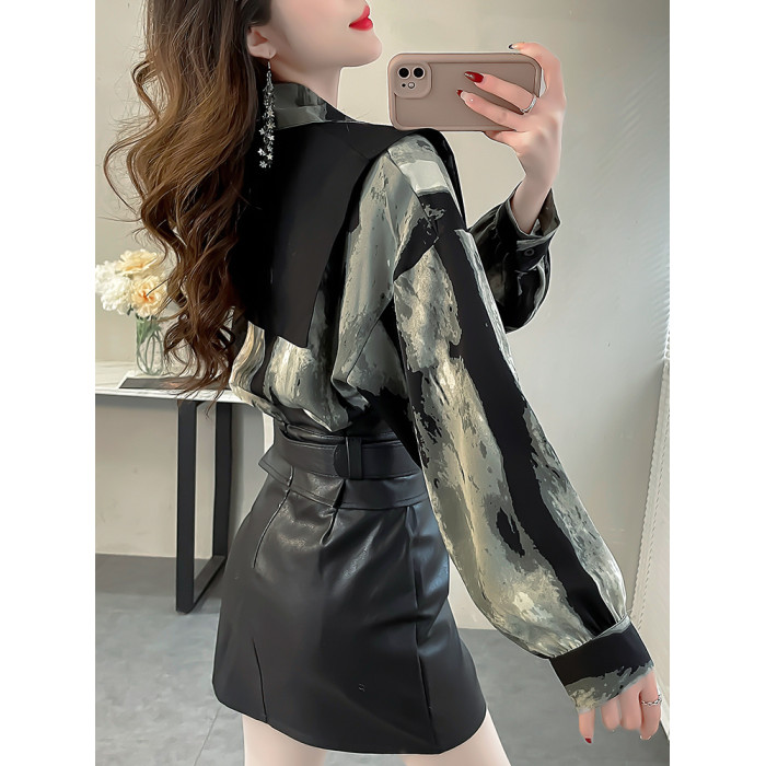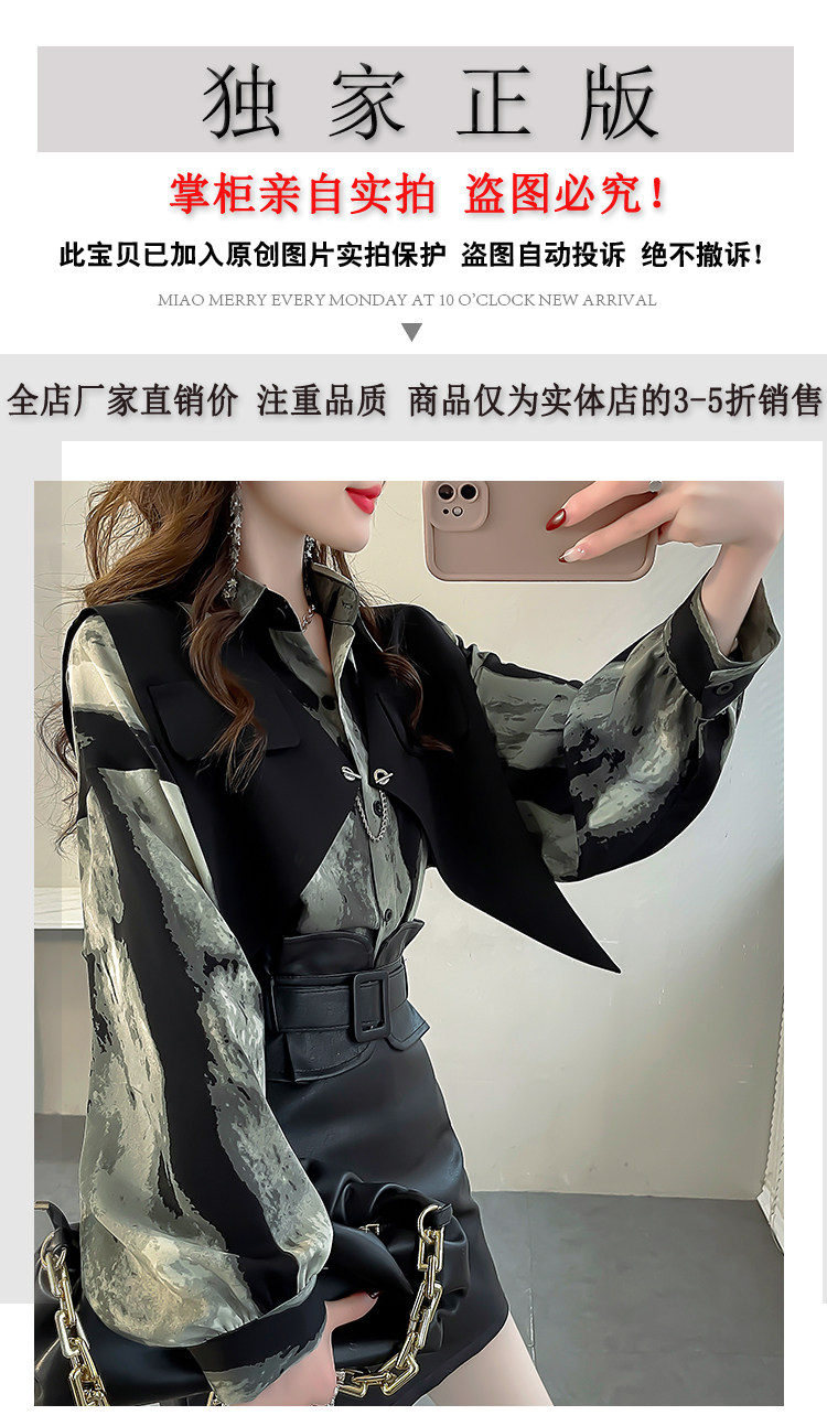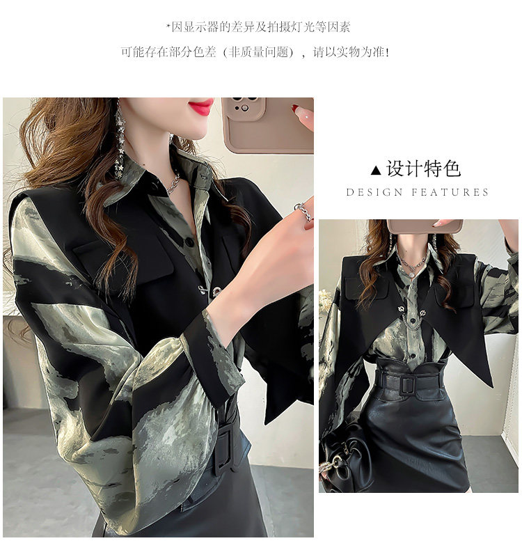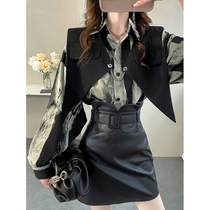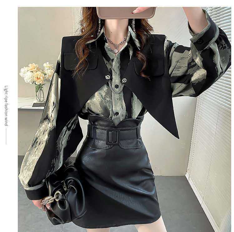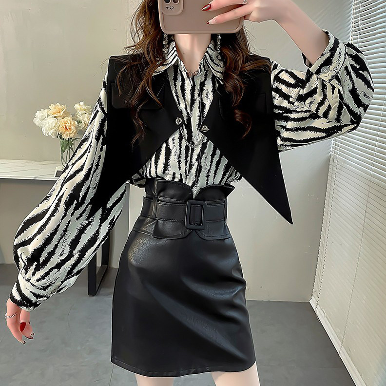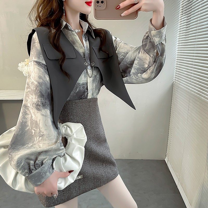 黑色馬甲配墨染條紋襯衣套裝2024春款女裝燈籠袖襯衫氣質雪紡上衣