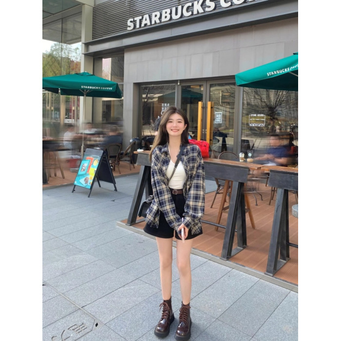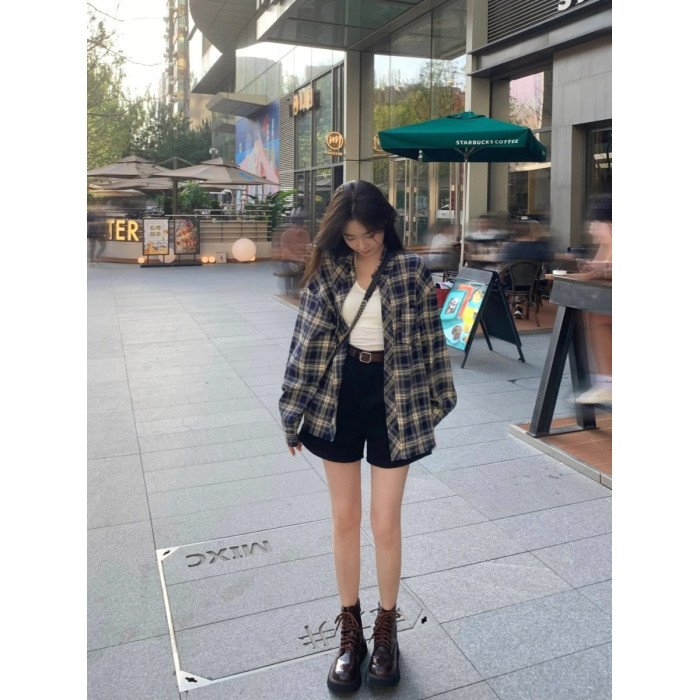 冪式穿搭藍色格子襯衫女慵懶風復古寬鬆襯衣開衫外套防曬上衣春夏