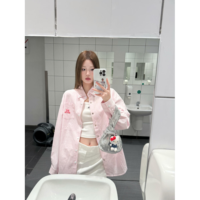 美式復古粉色條紋Polo領襯衫外套女春秋寬鬆休閒長袖襯衣外搭上衣