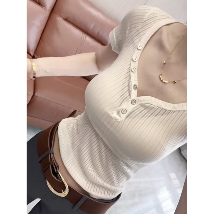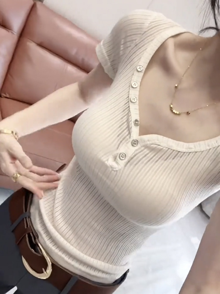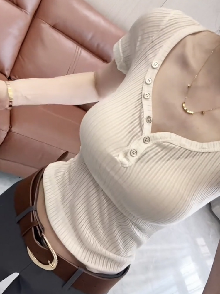 韓系設計感V半領紐釦短袖T恤女2025夏季新款辣妹設計修身百搭上衣