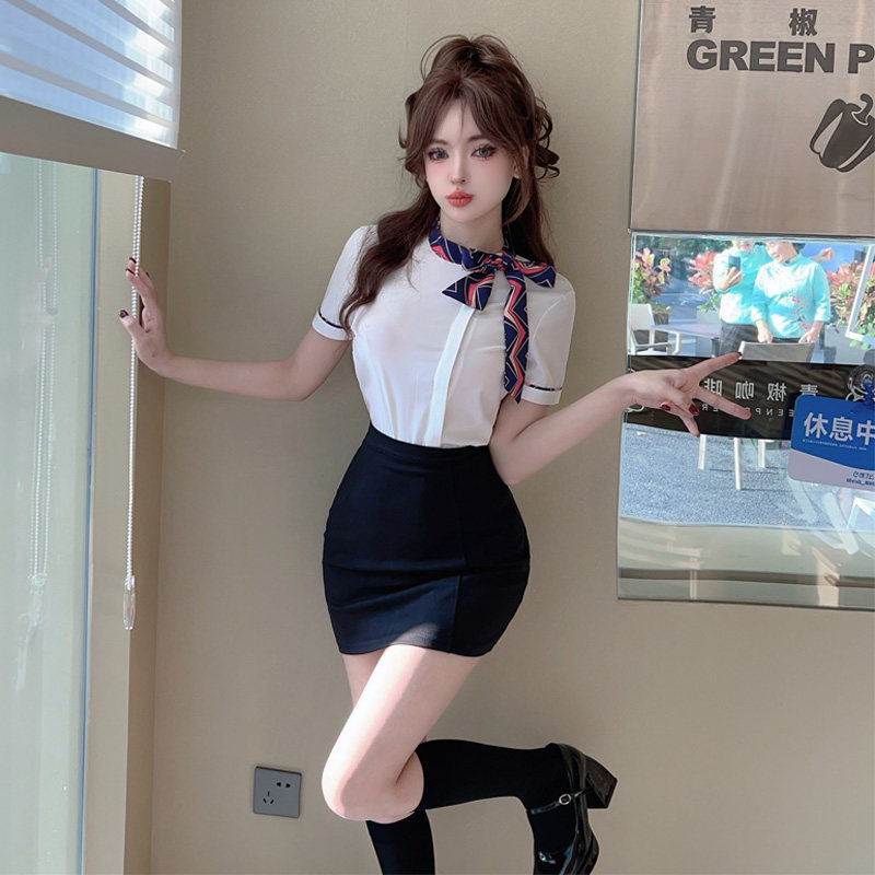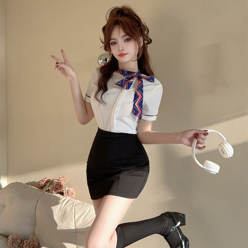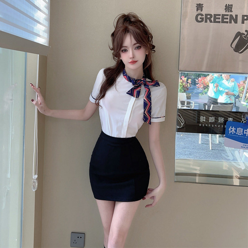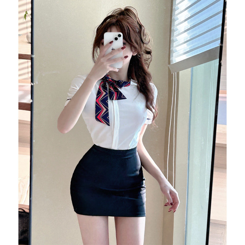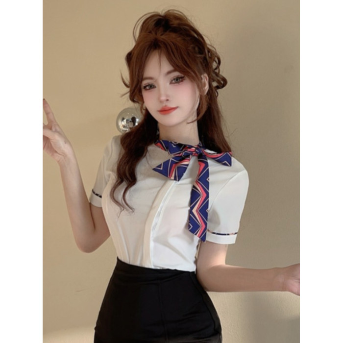 夏白色襯衫女上衣短袖工作服前台空姐製服氣質修身蝴蝶結職業襯衣