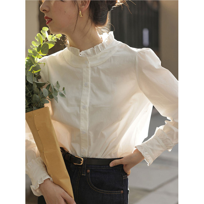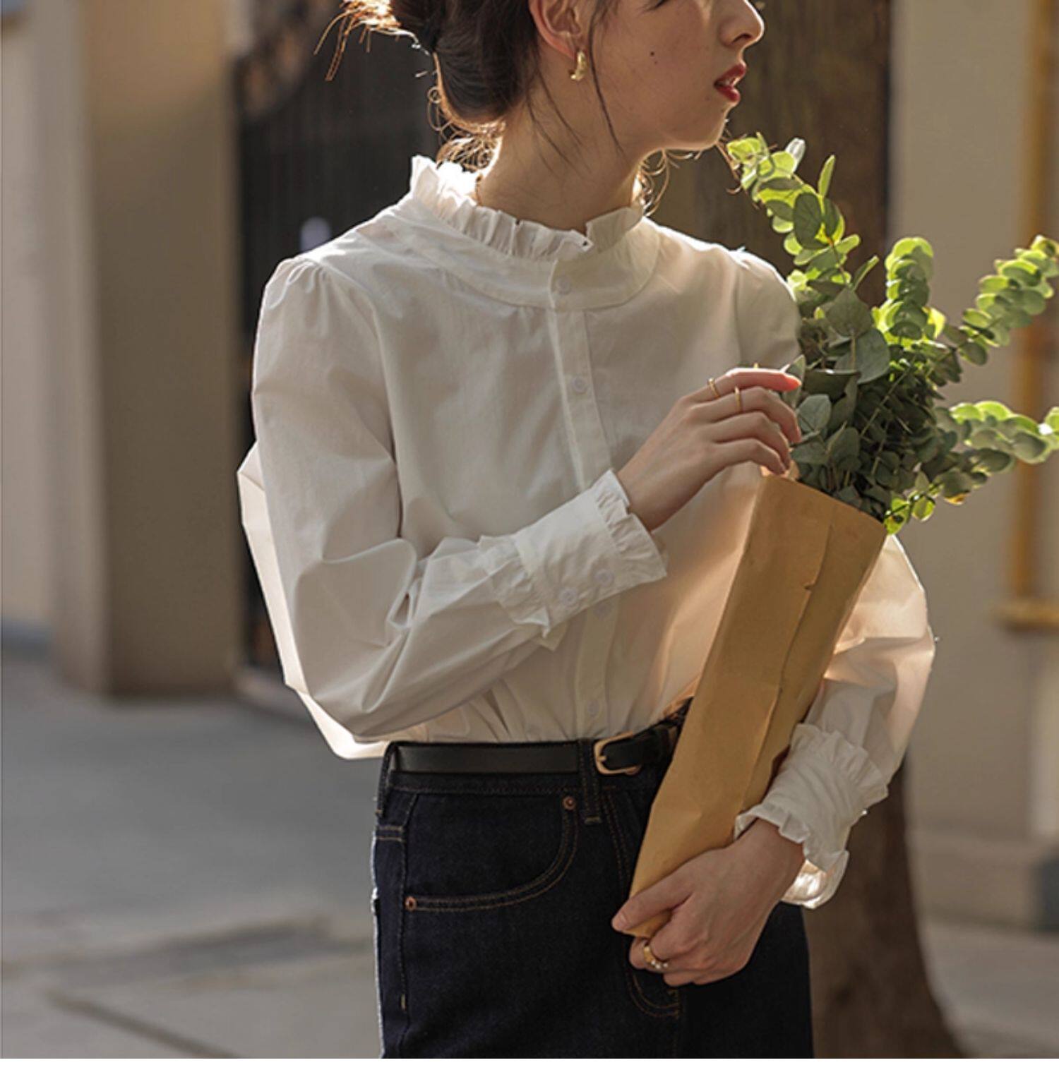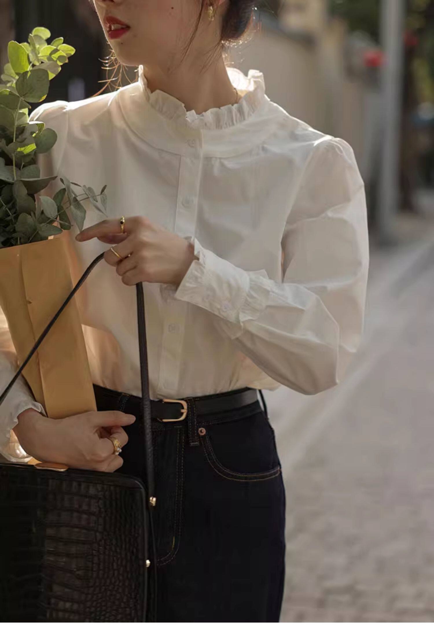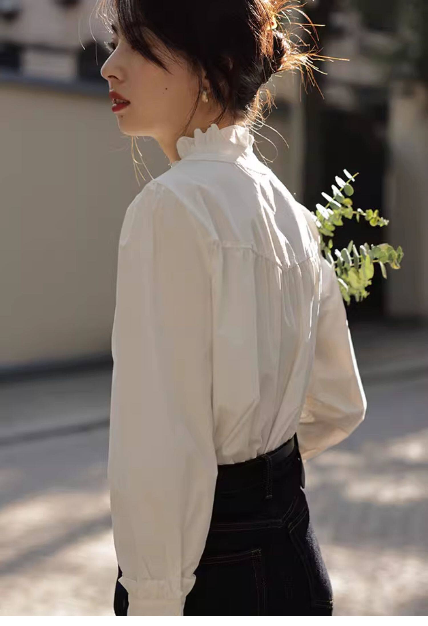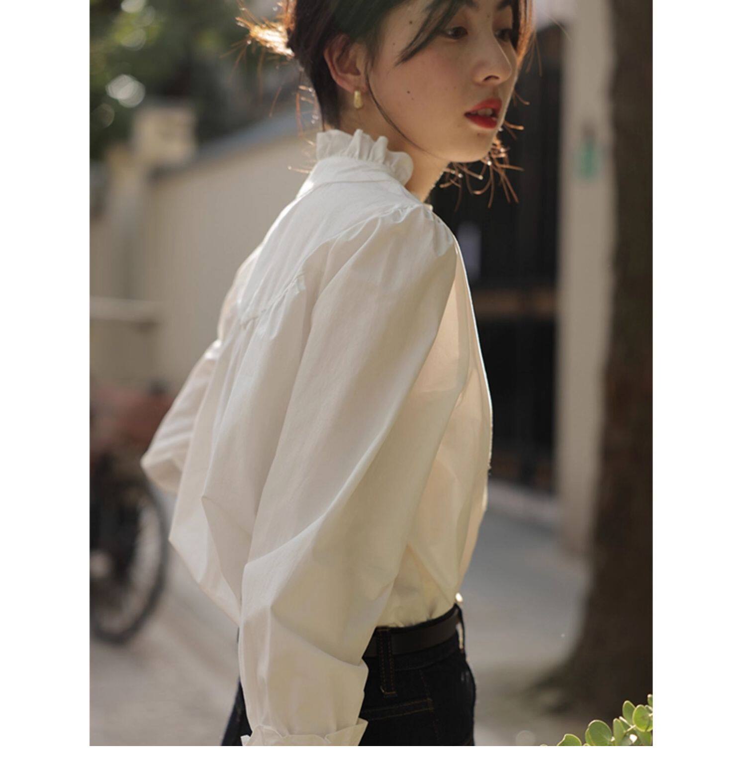 法式白色襯衫上衣女秋季設計感小衆木耳花邊立領高級打底內搭襯衣