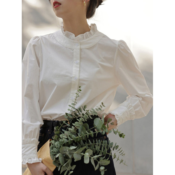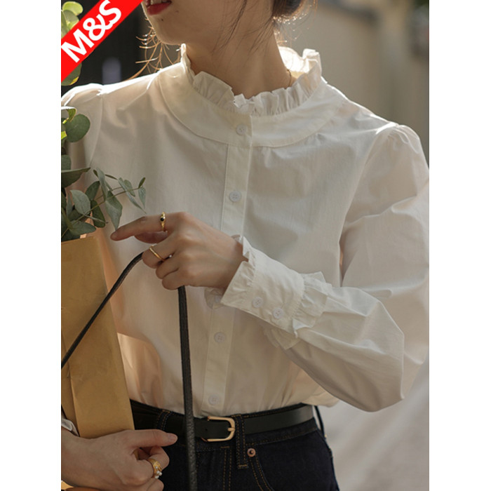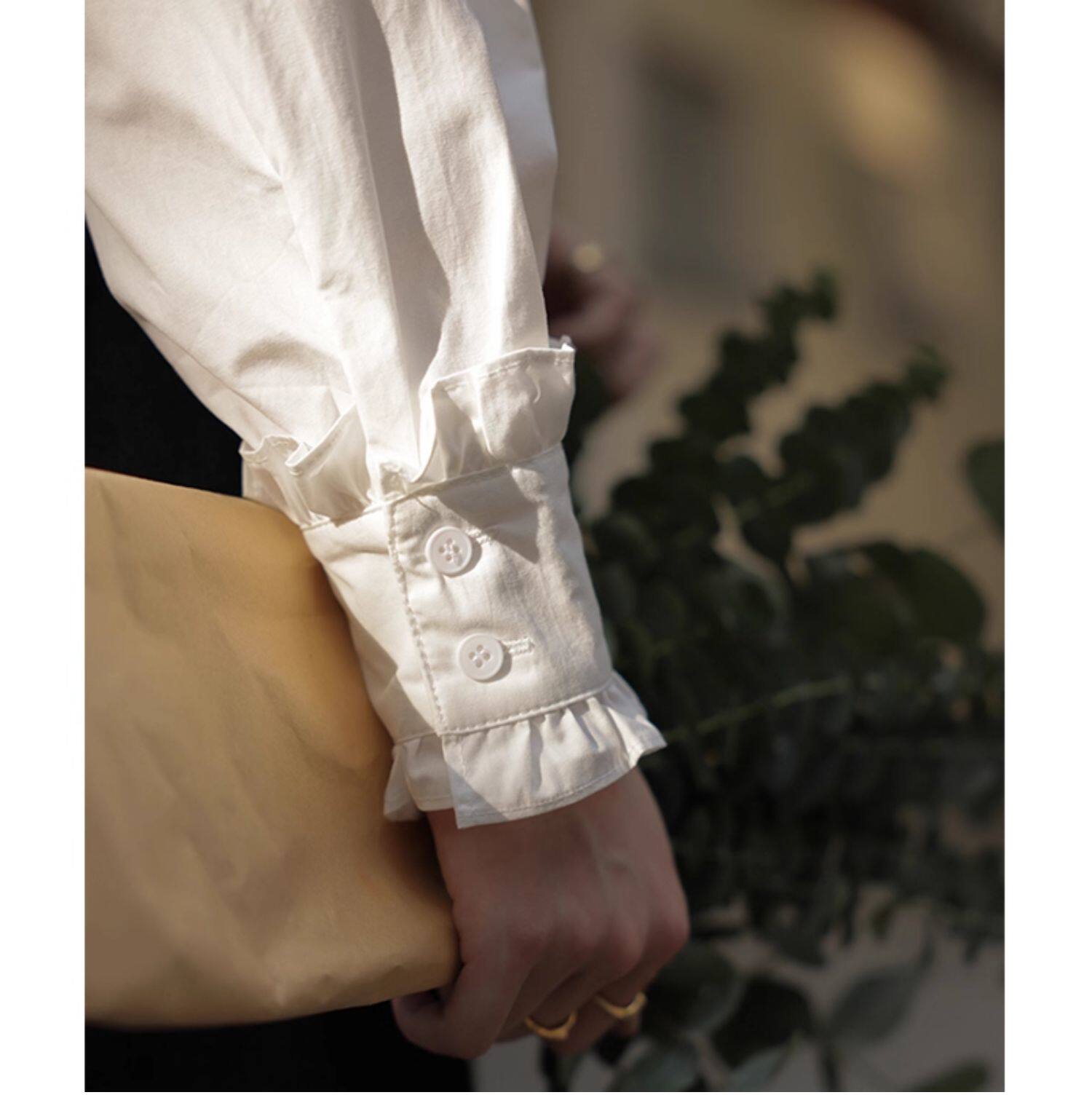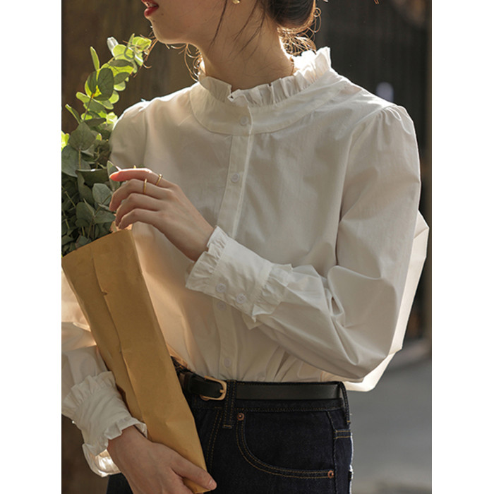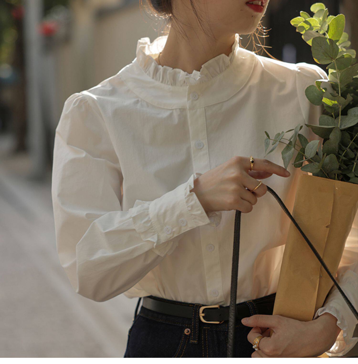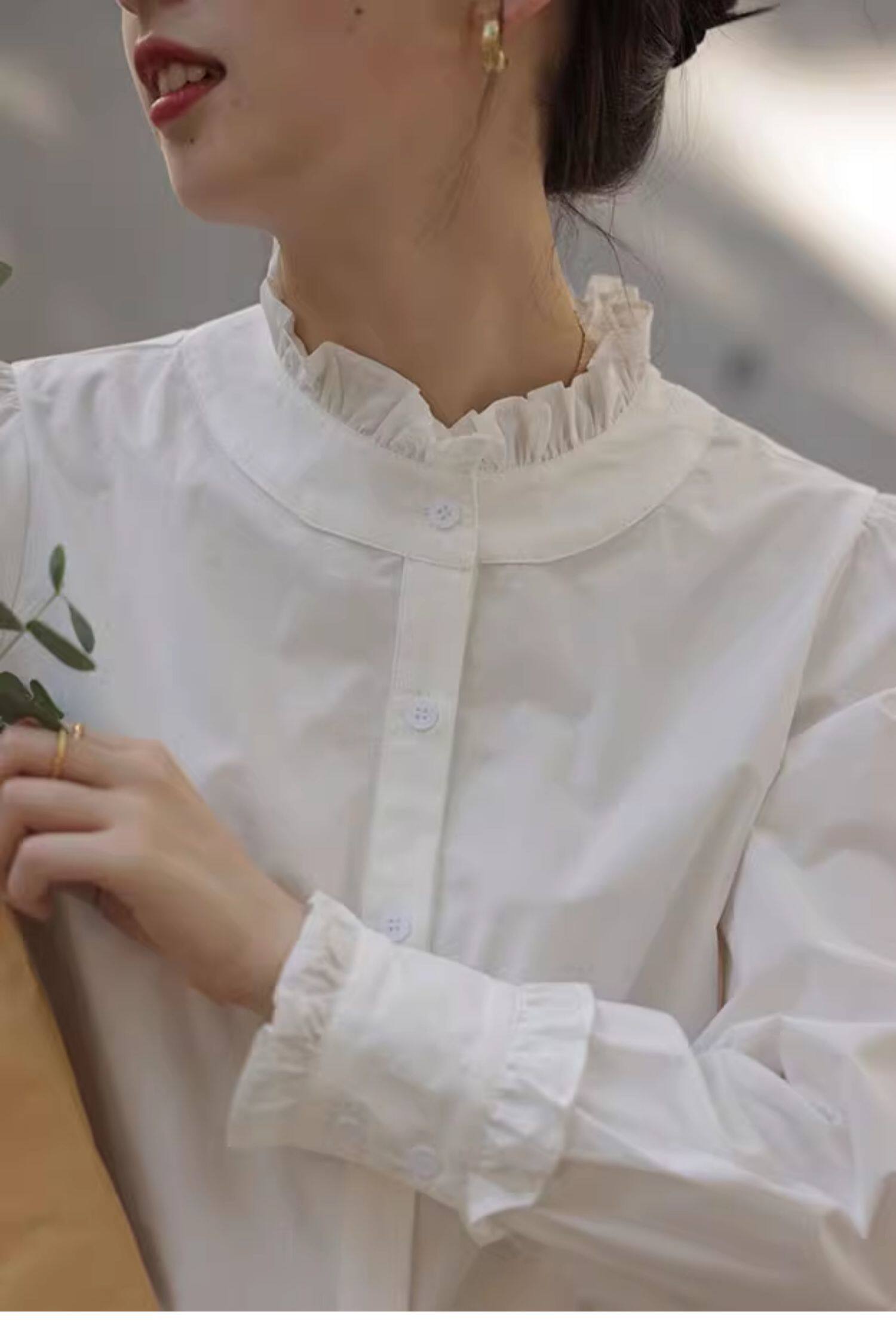 法式白色襯衫上衣女秋季設計感小衆木耳花邊立領高級打底內搭襯衣