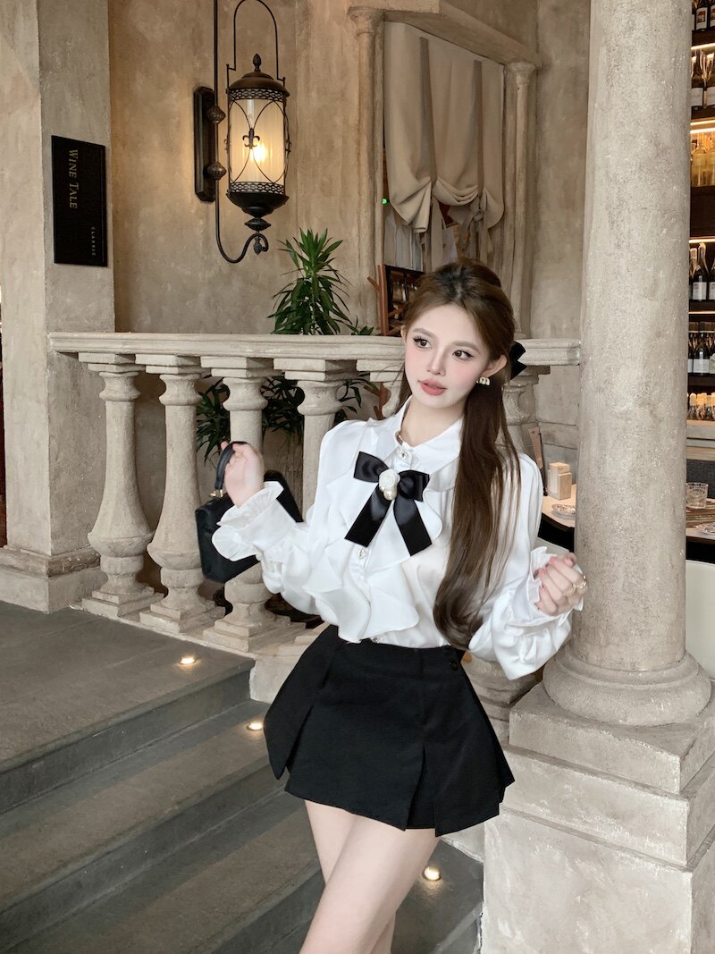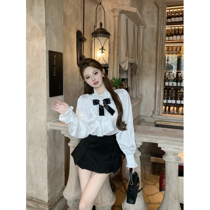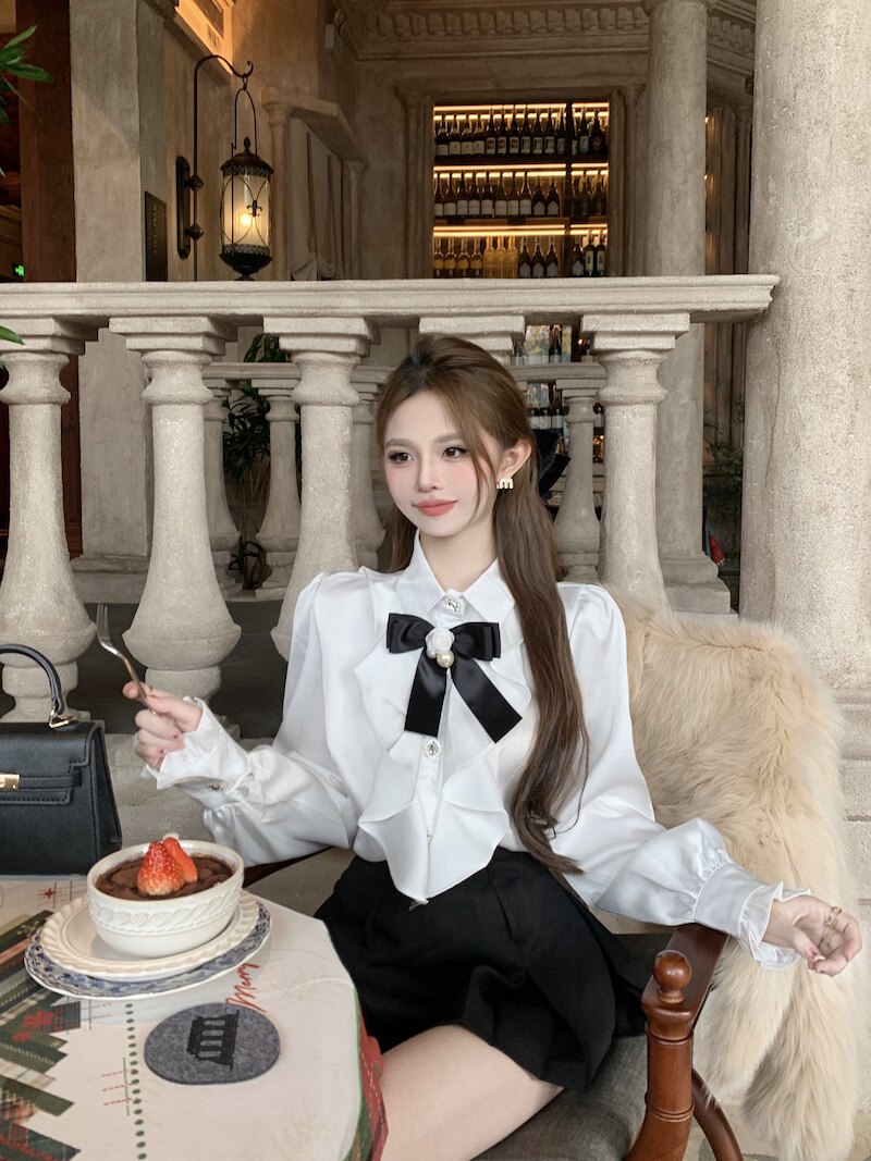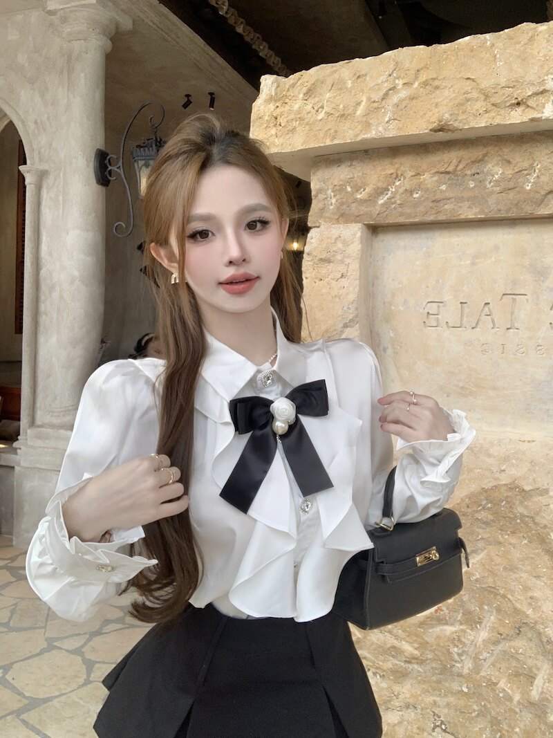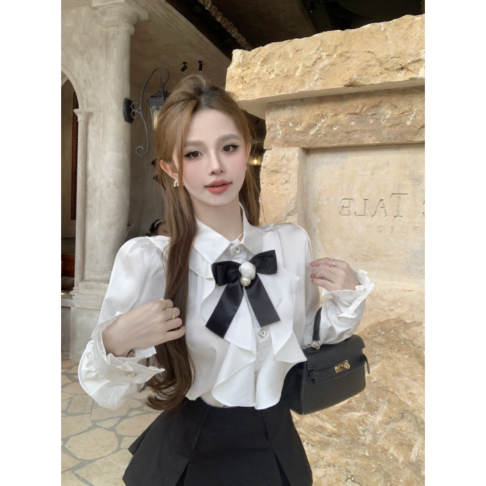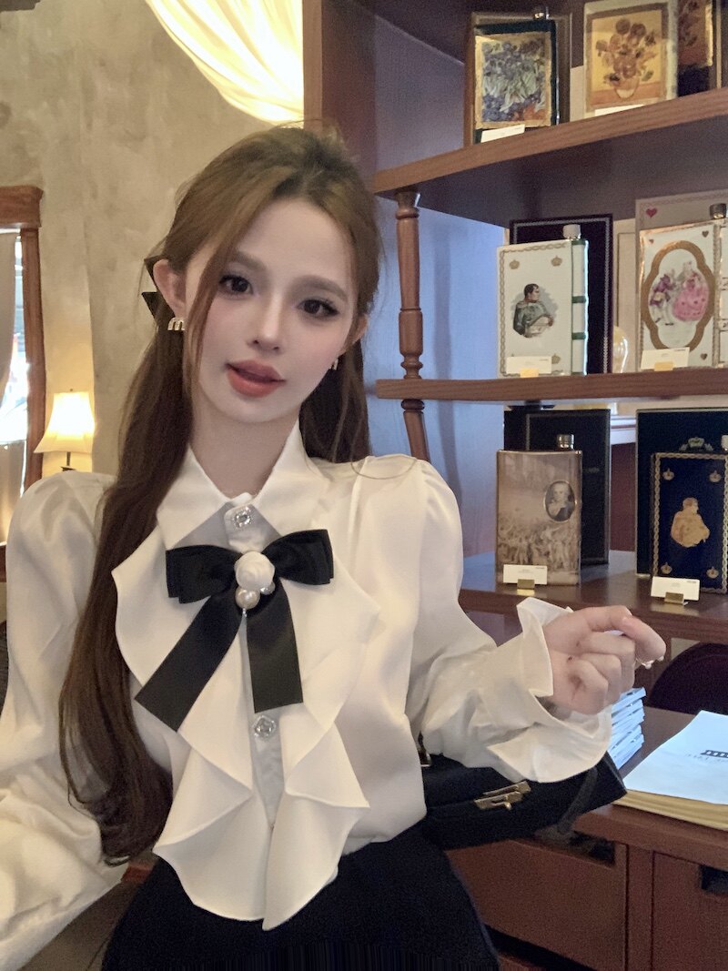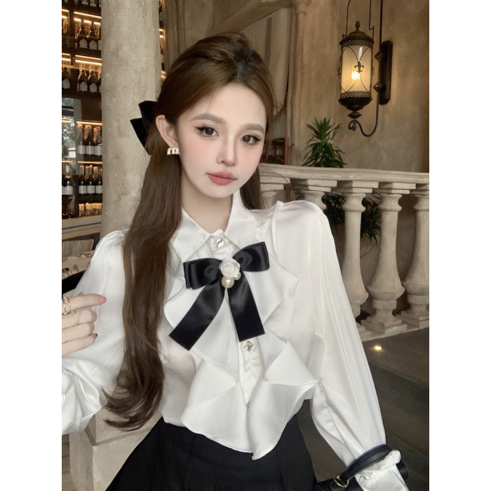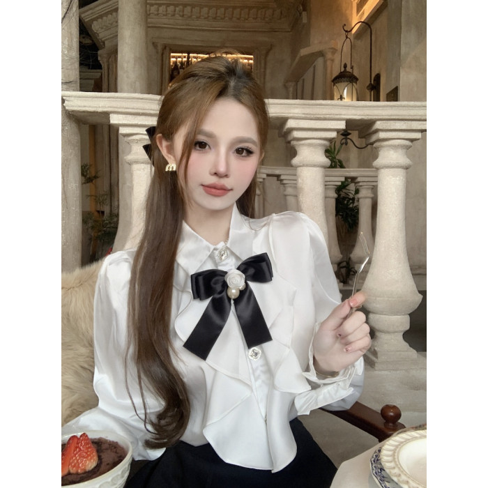 秋季法式輕奢宮廷風氣質甜美荷葉邊拼接蝴蝶結單排釦純色襯衫女
