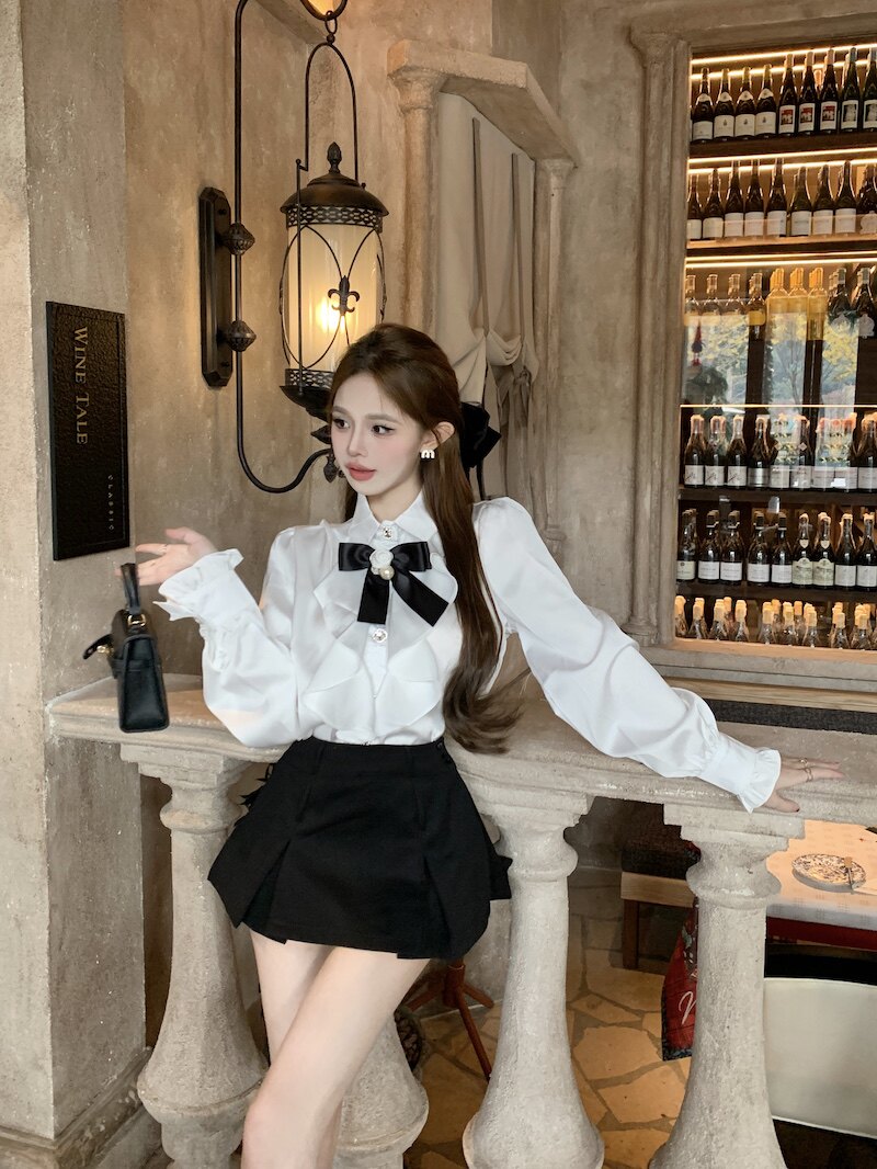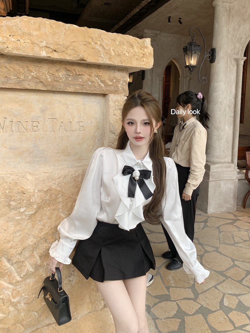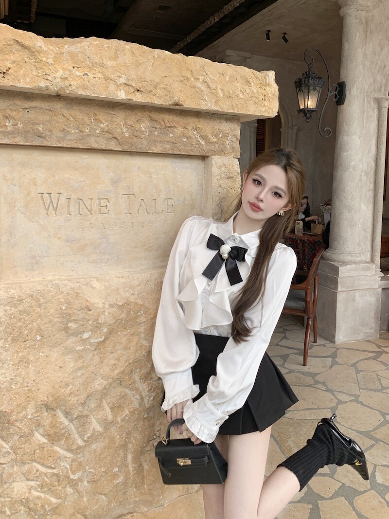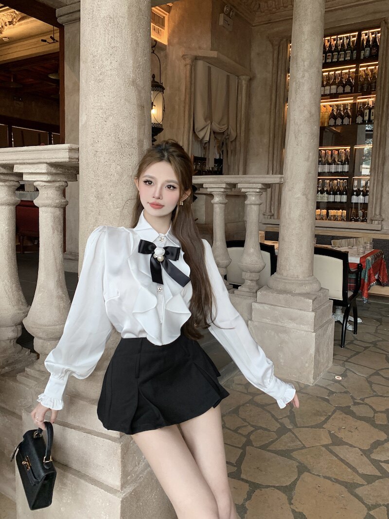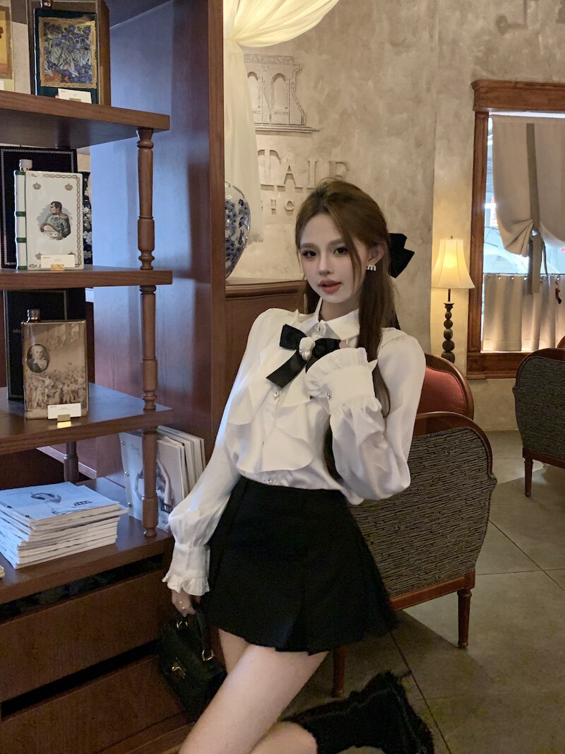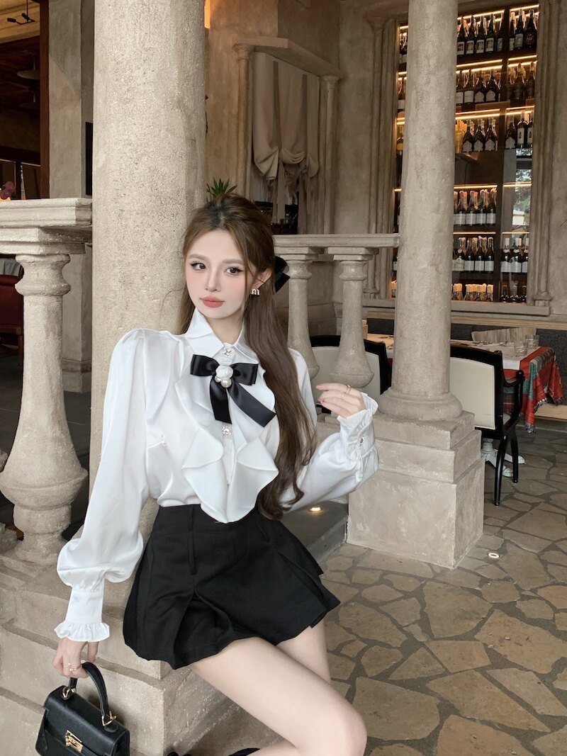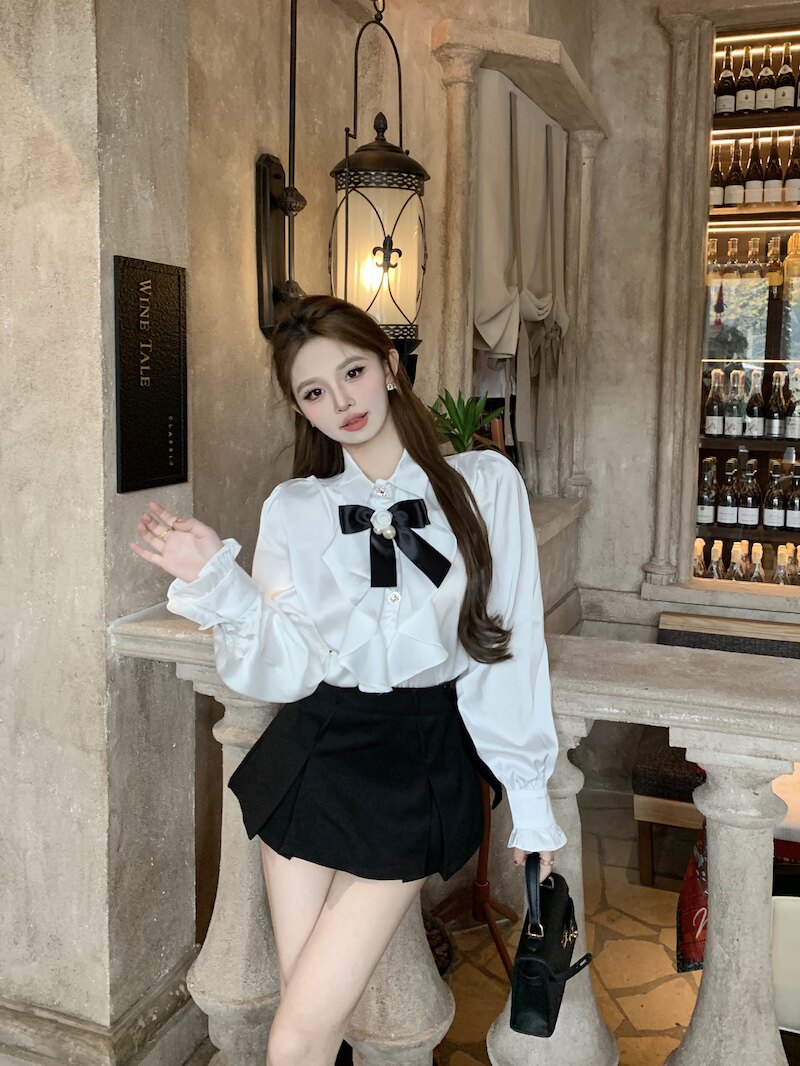 秋季法式輕奢宮廷風氣質甜美荷葉邊拼接蝴蝶結單排釦純色襯衫女