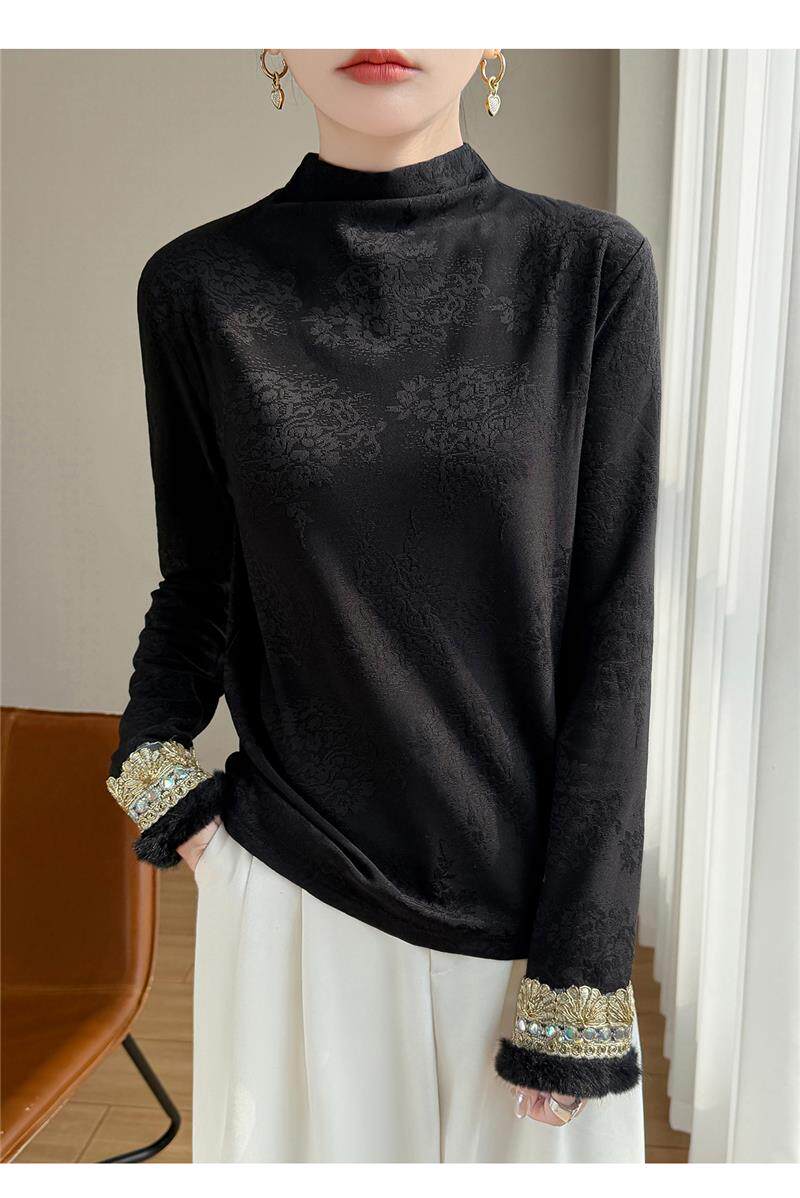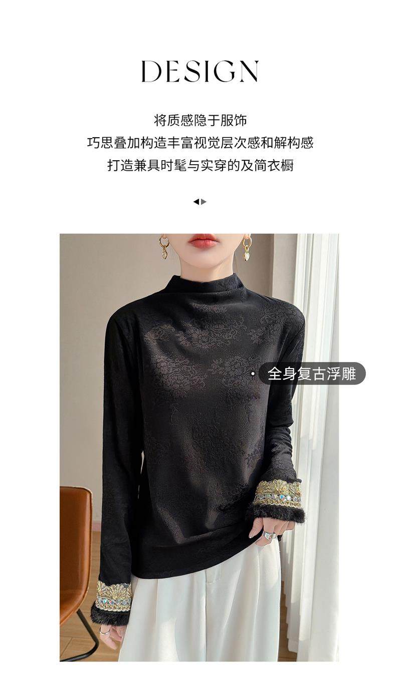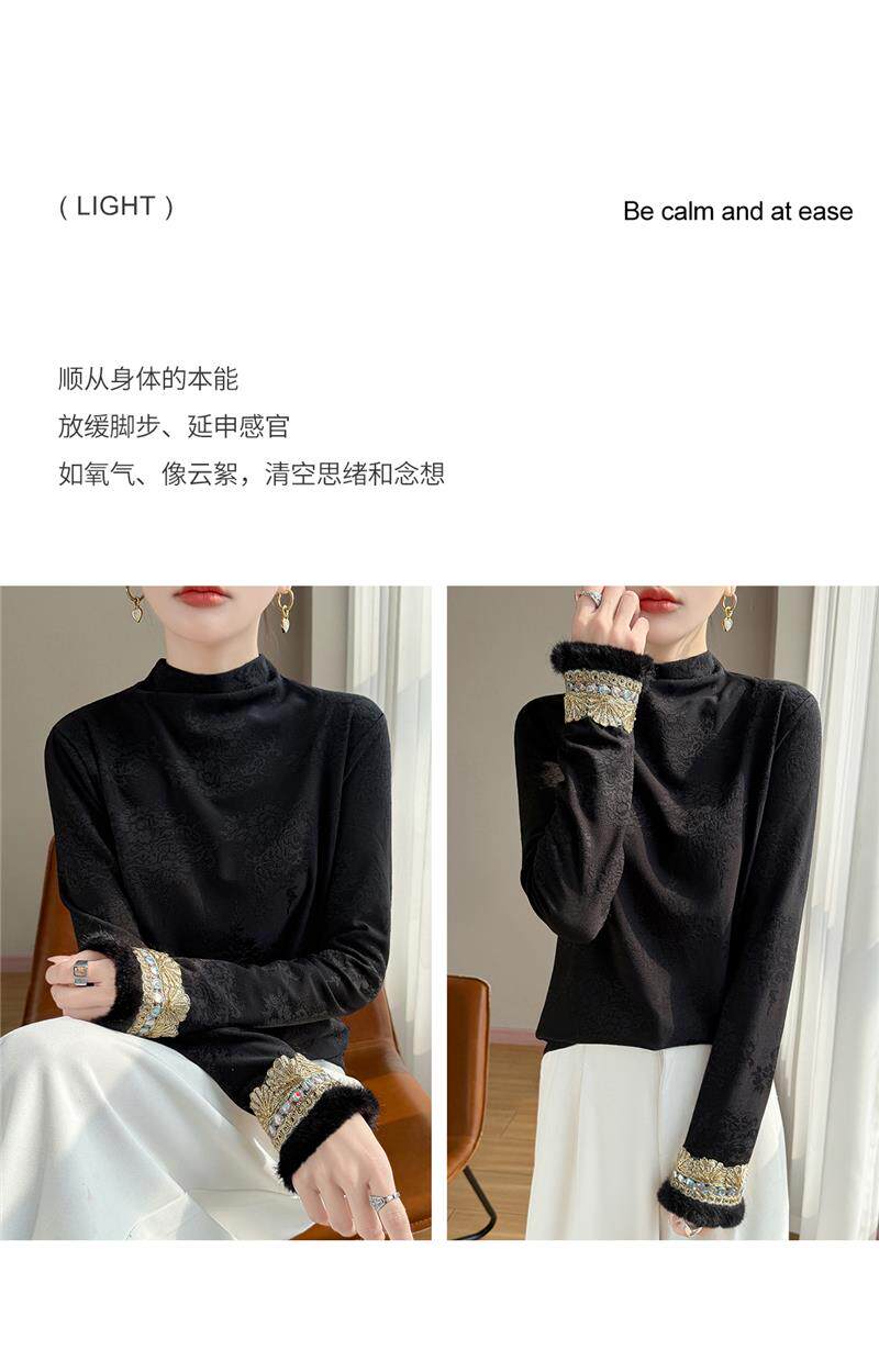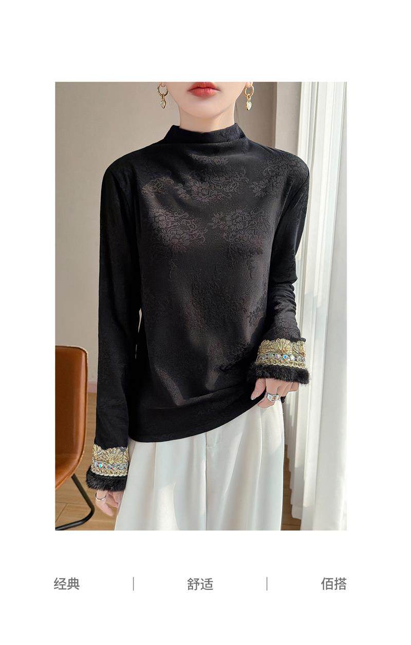 新中式刺綉長袖半高領襯衫加絨加厚提花長袖黑色國風內搭洋氣上衣
