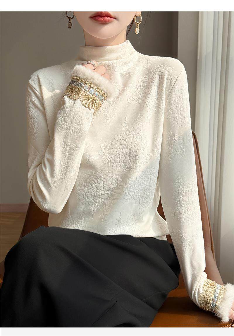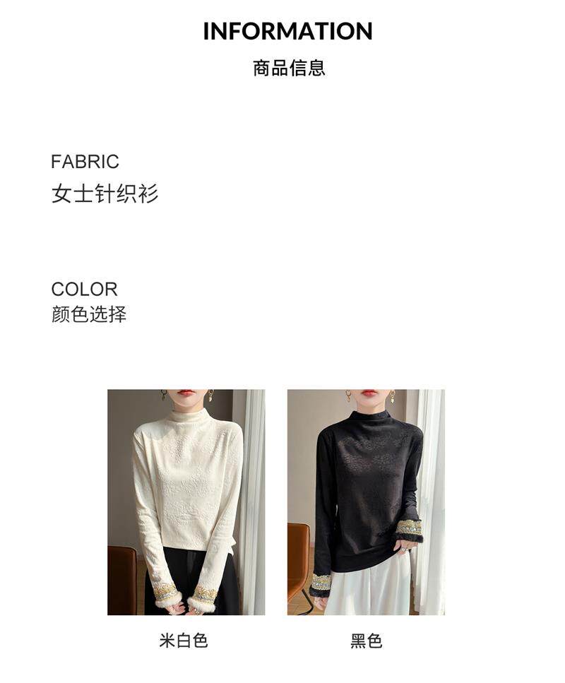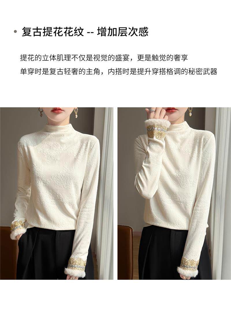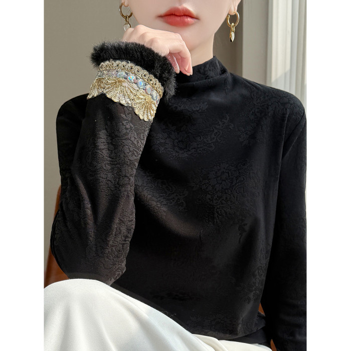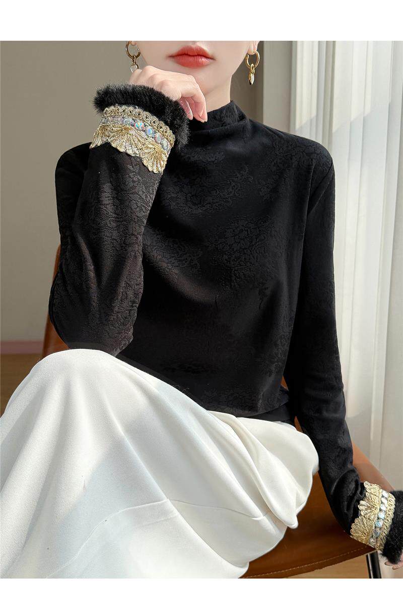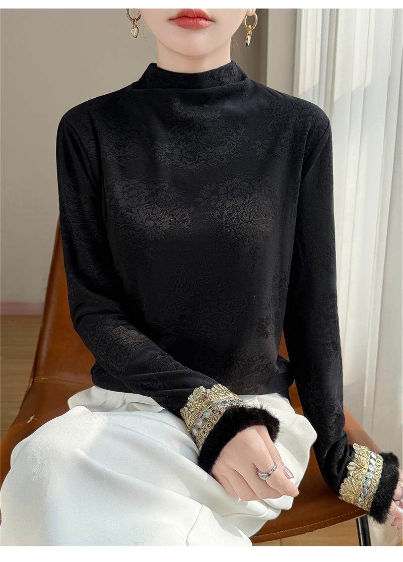 新中式刺綉長袖半高領襯衫加絨加厚提花長袖黑色國風內搭洋氣上衣