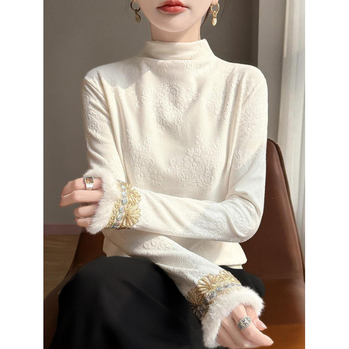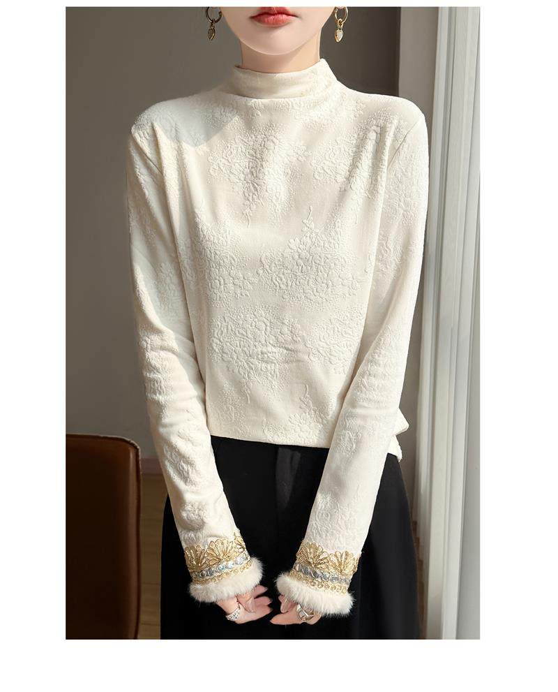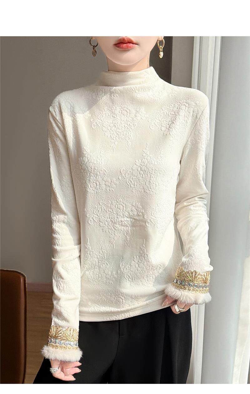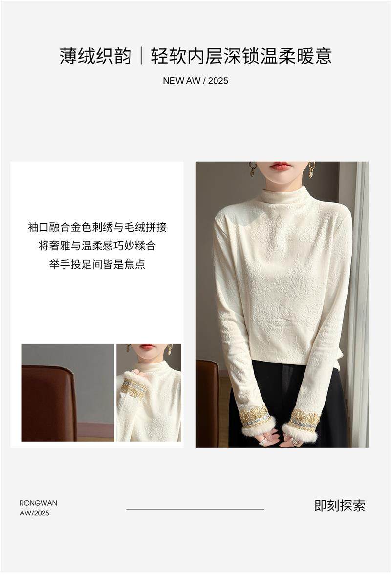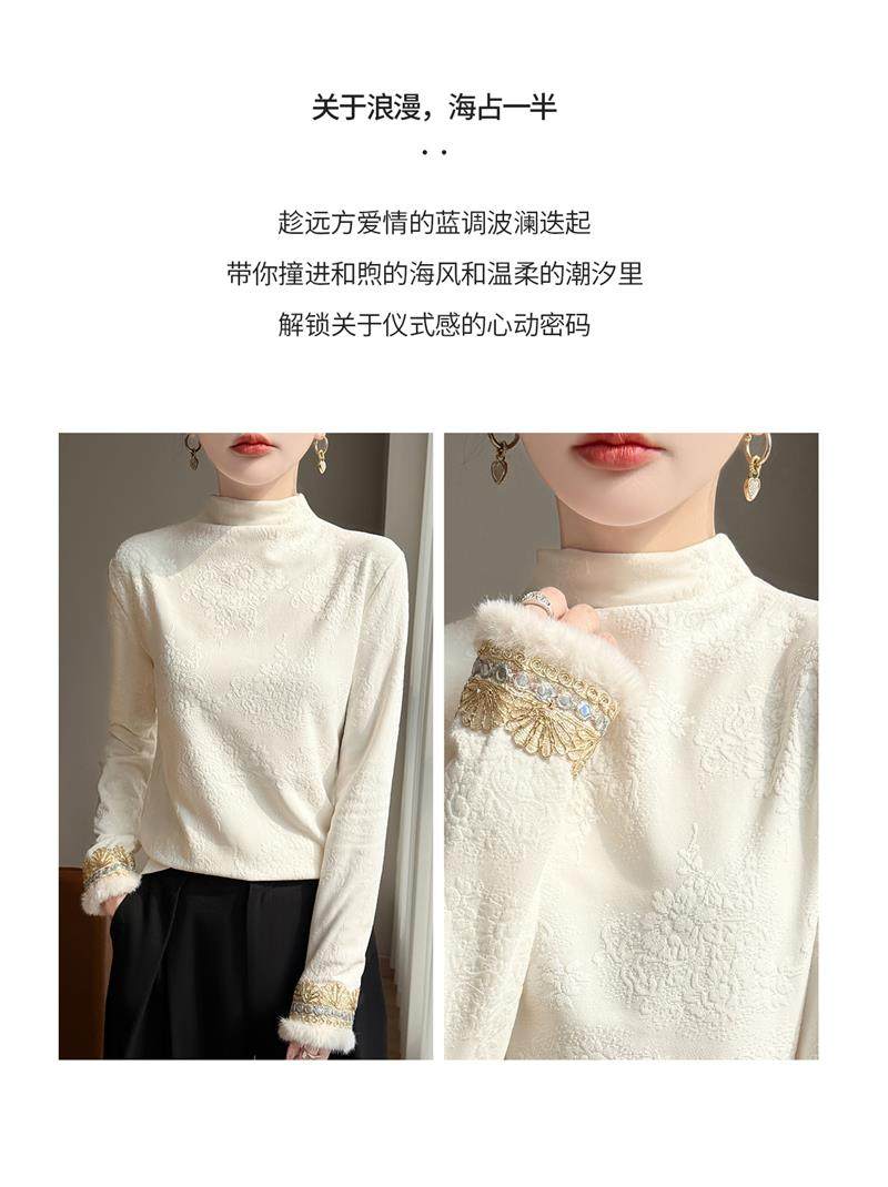 新中式刺綉長袖半高領襯衫加絨加厚提花長袖黑色國風內搭洋氣上衣
