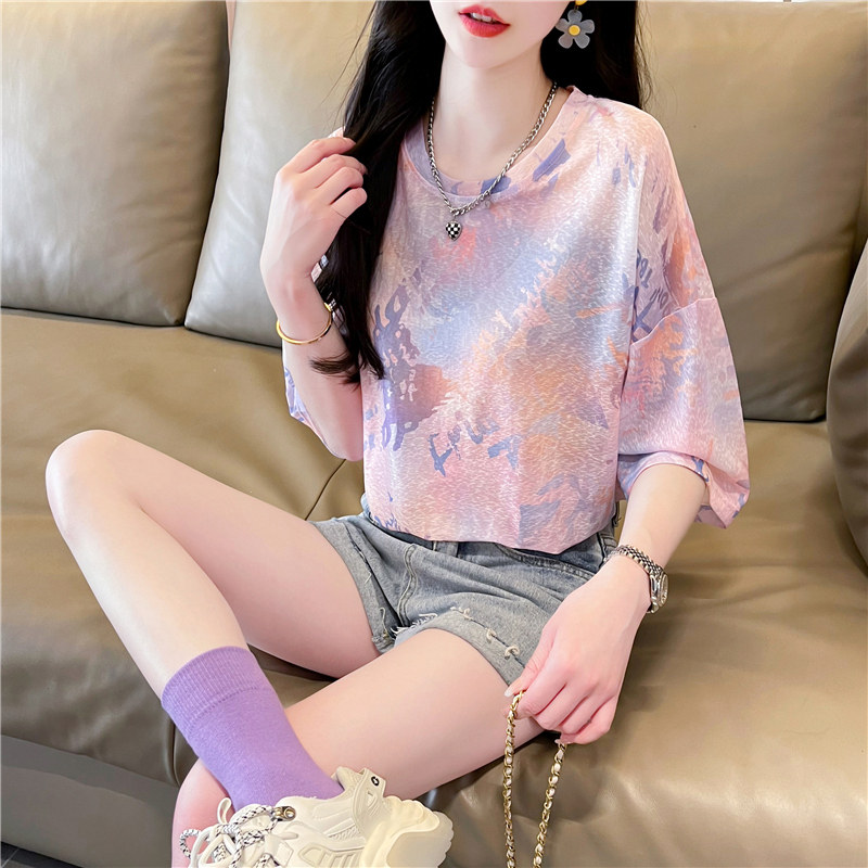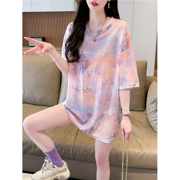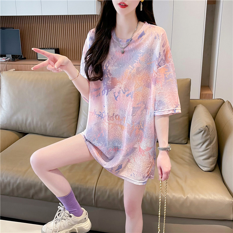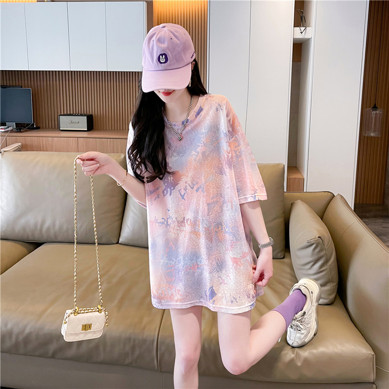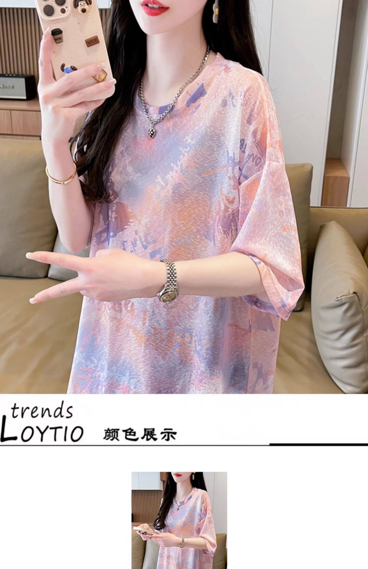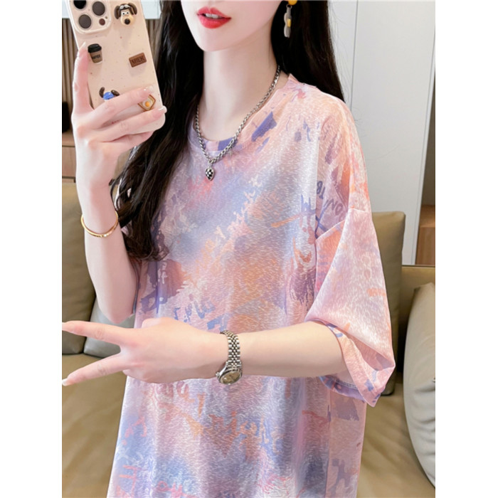 速乾冰絲中長薄款短袖t恤女夏季寬鬆復古紥染設計感減齡洋氣上衣