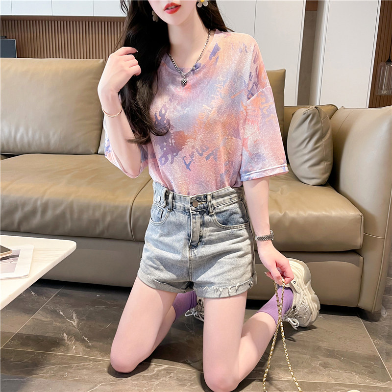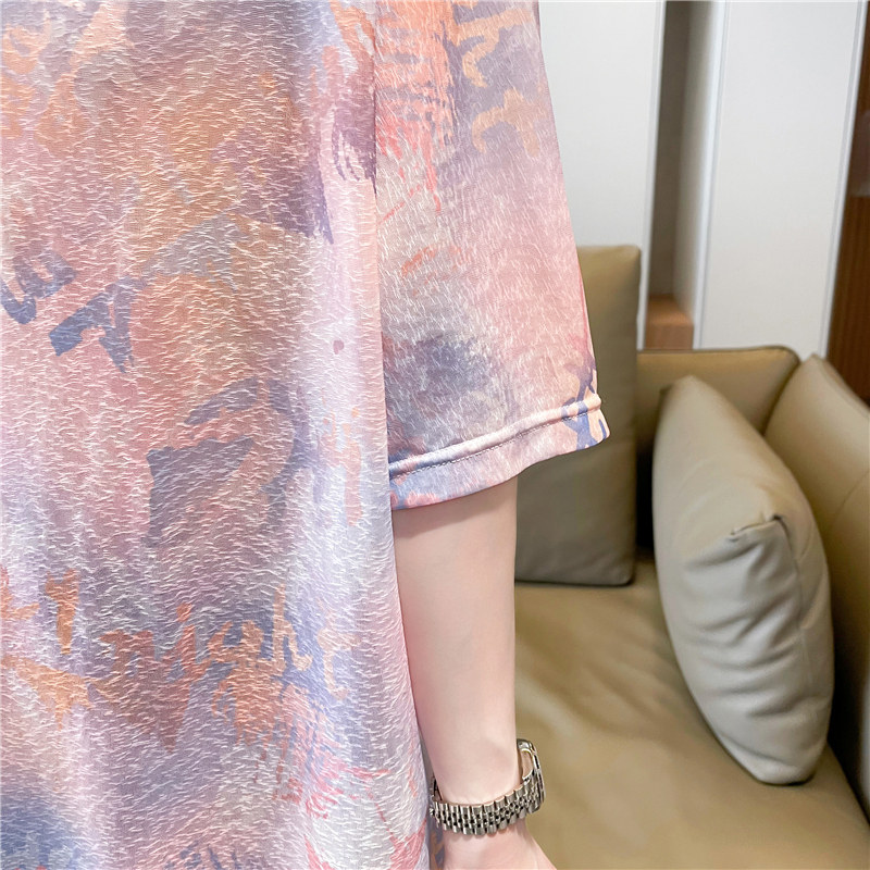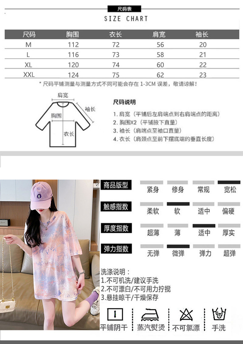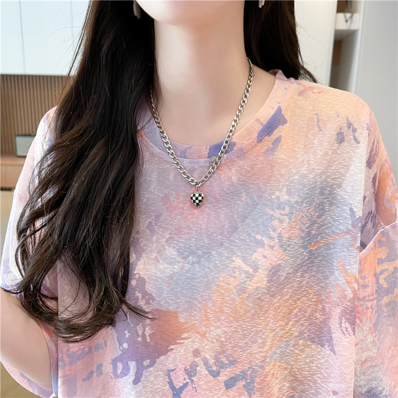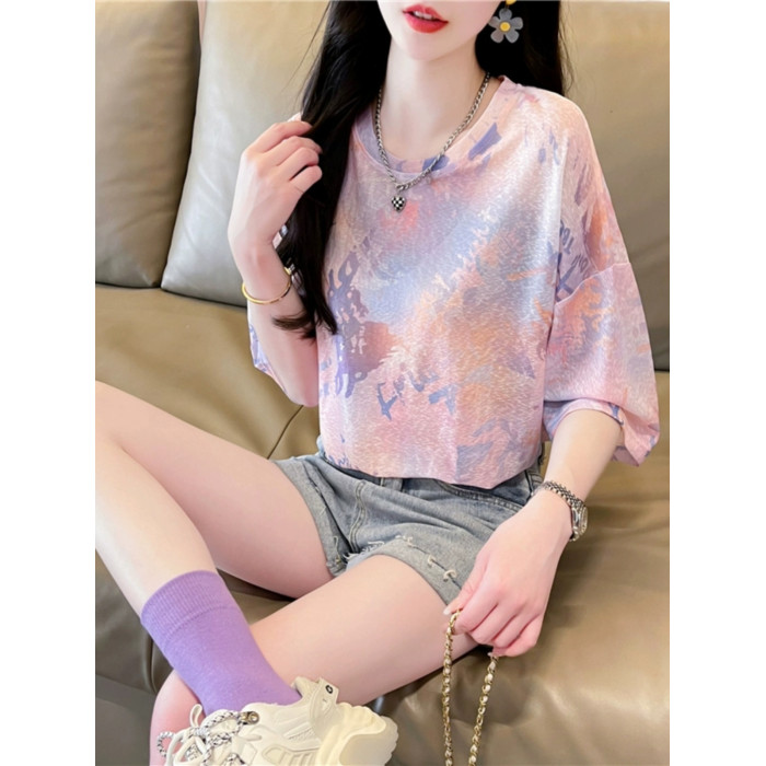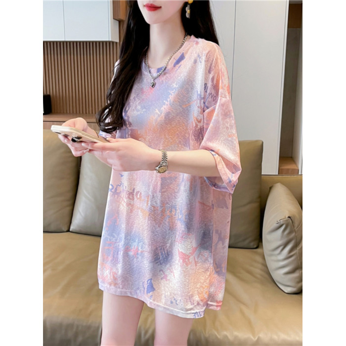 速乾冰絲中長薄款短袖t恤女夏季寬鬆復古紥染設計感減齡洋氣上衣