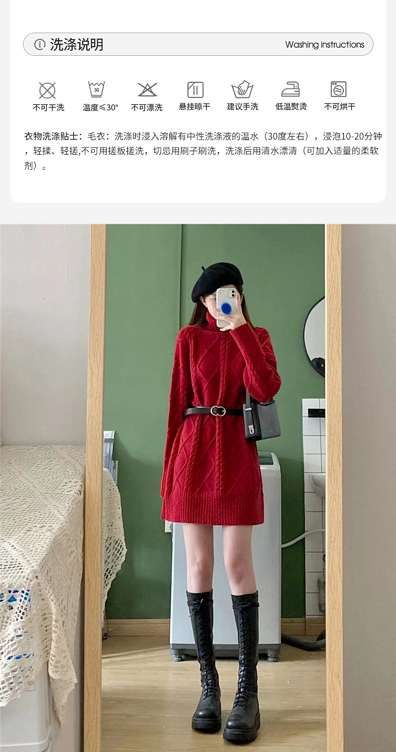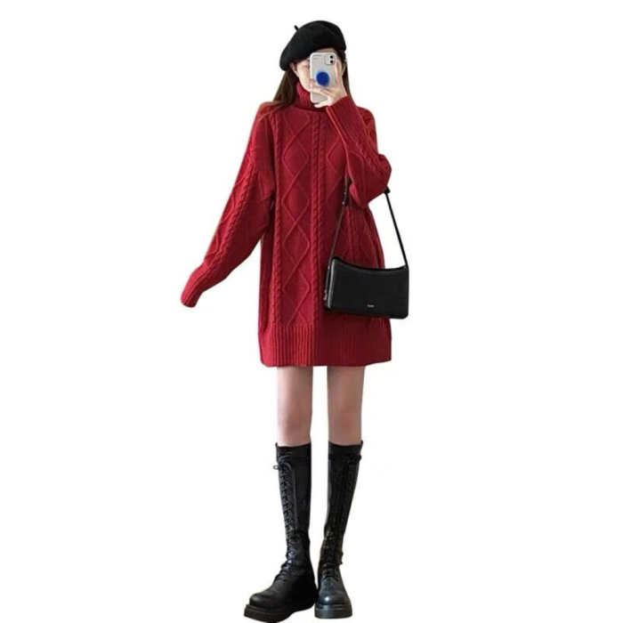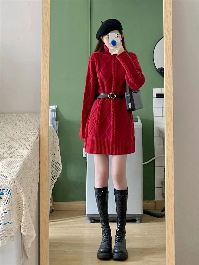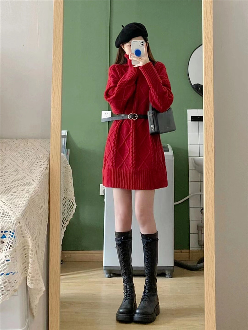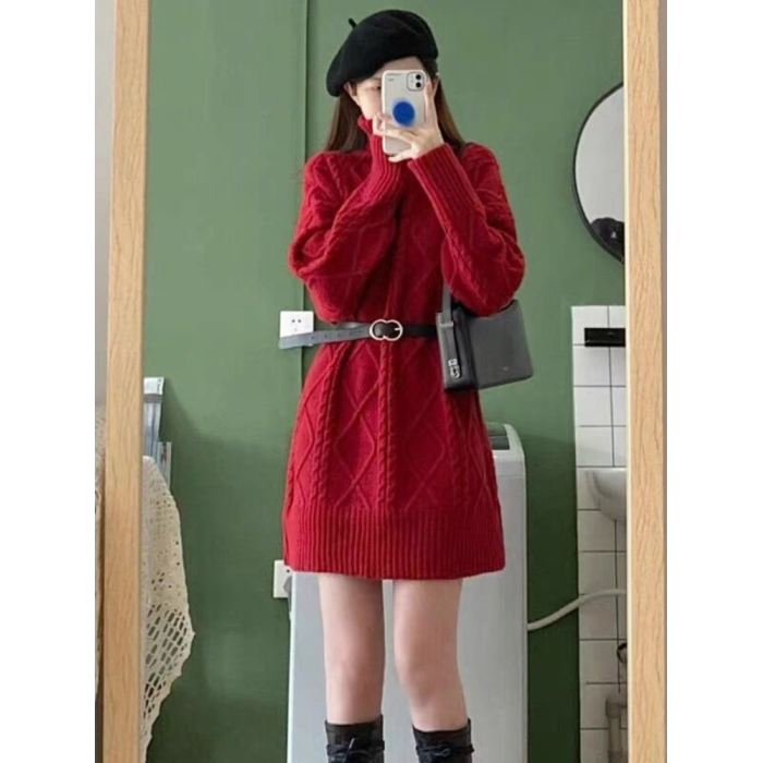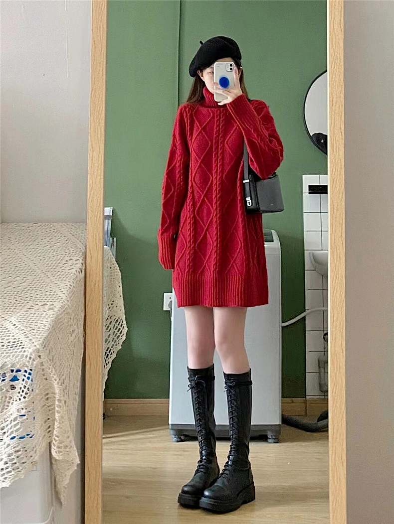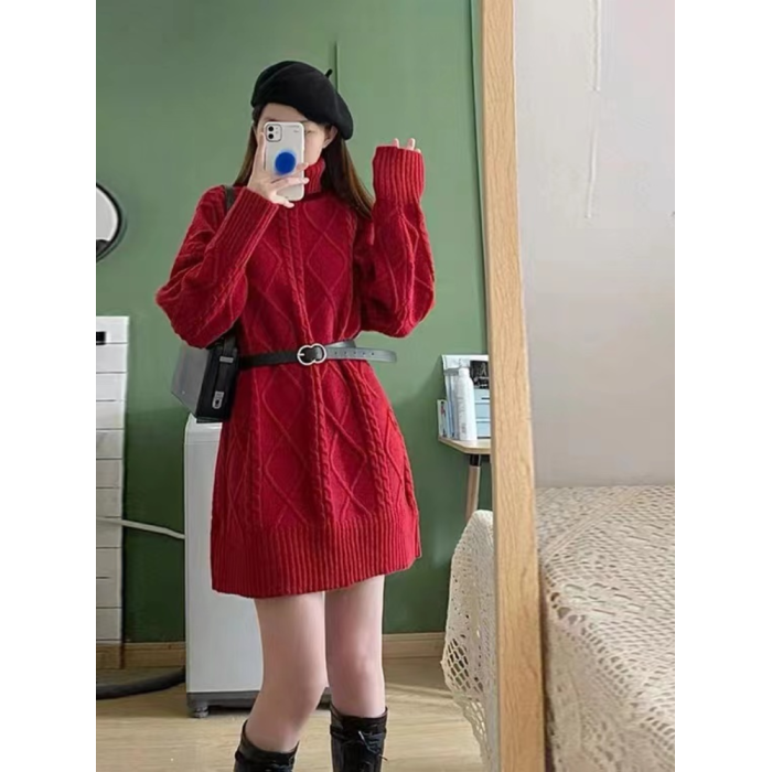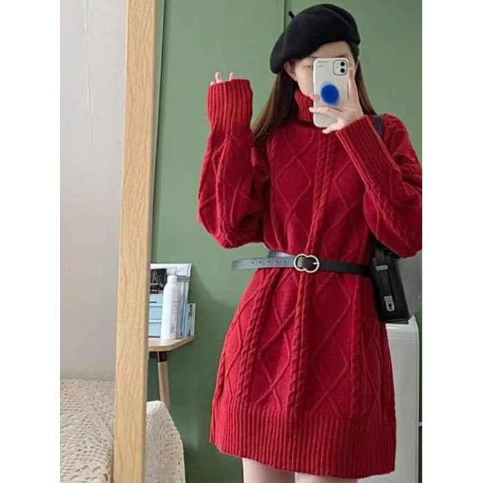2025聖誕本命年紅色針織連衣裙女秋冬寬鬆外穿加厚高領套頭毛衣裙