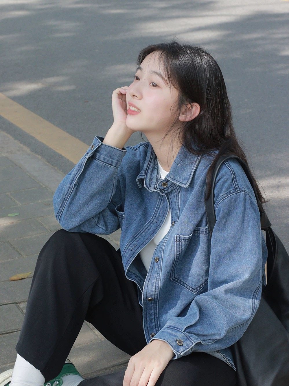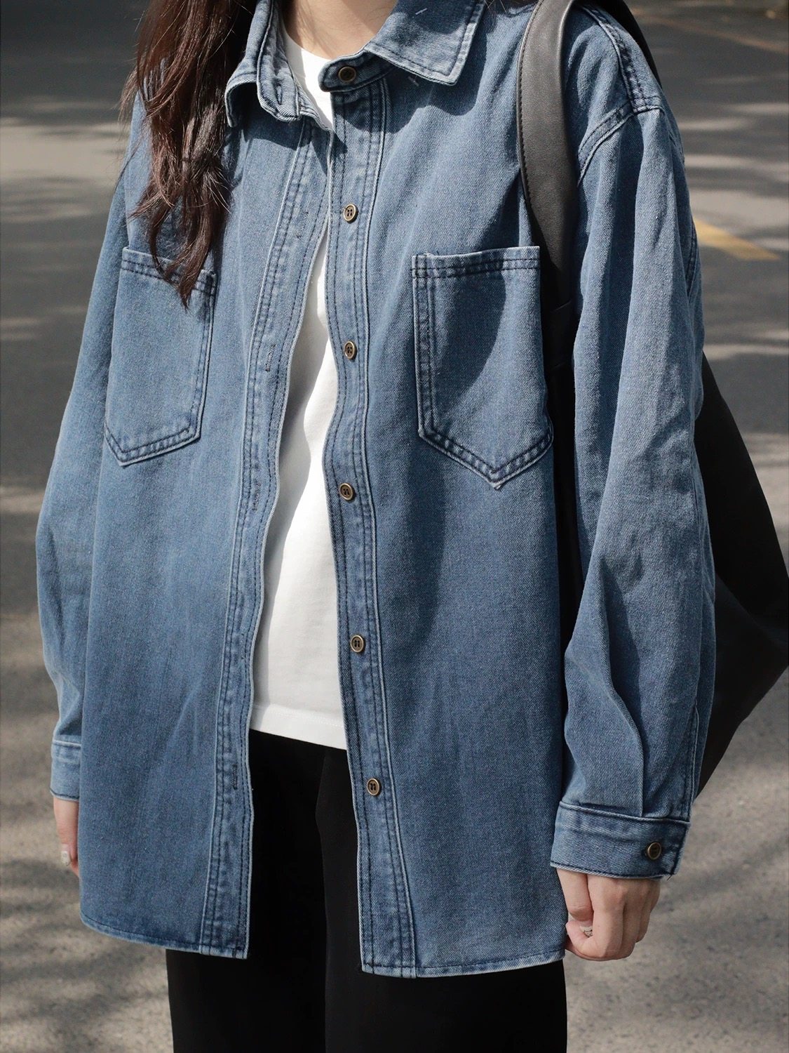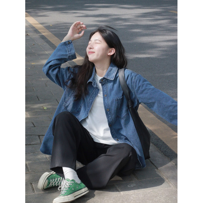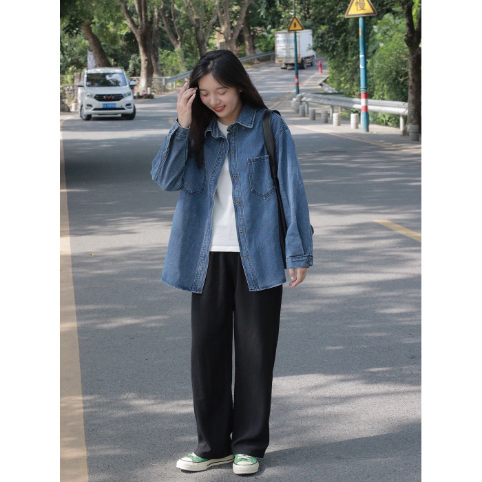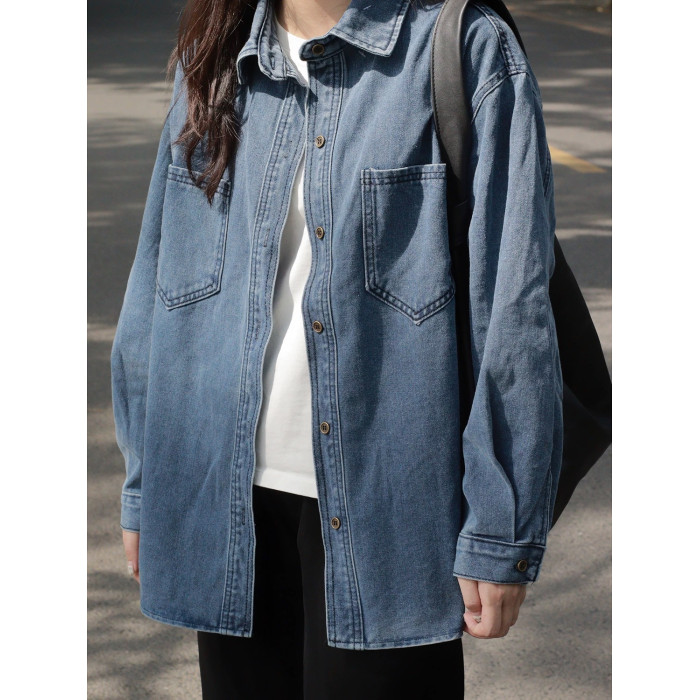 美式復古長袖牛仔襯衫外套女春秋季大碼寬鬆顯瘦中長款設計感上衣