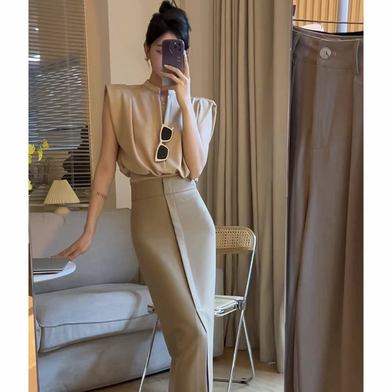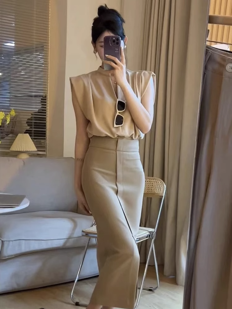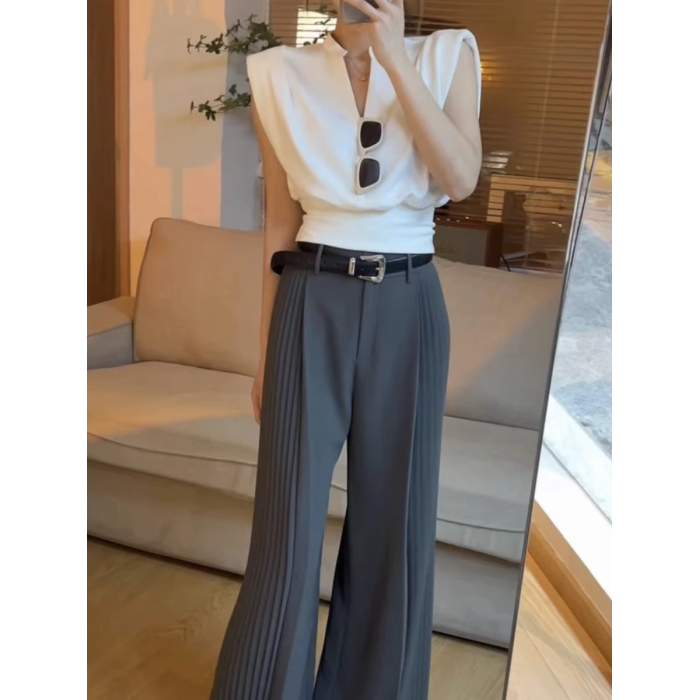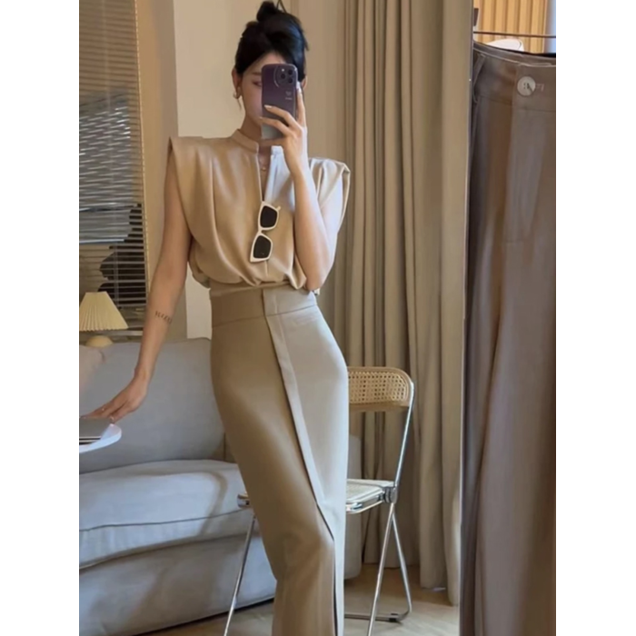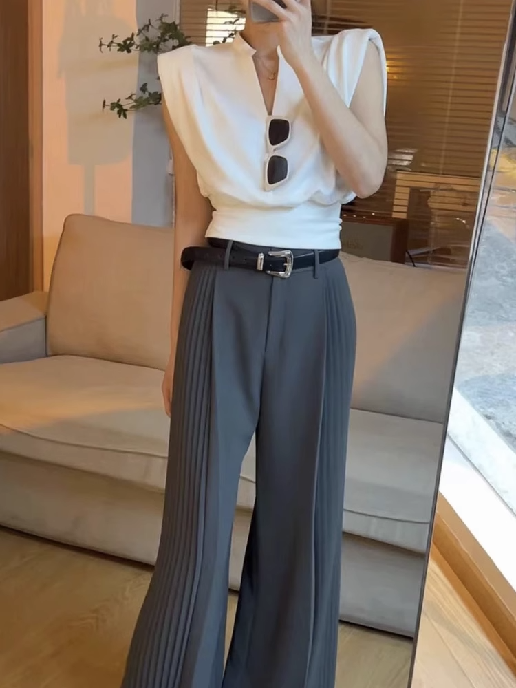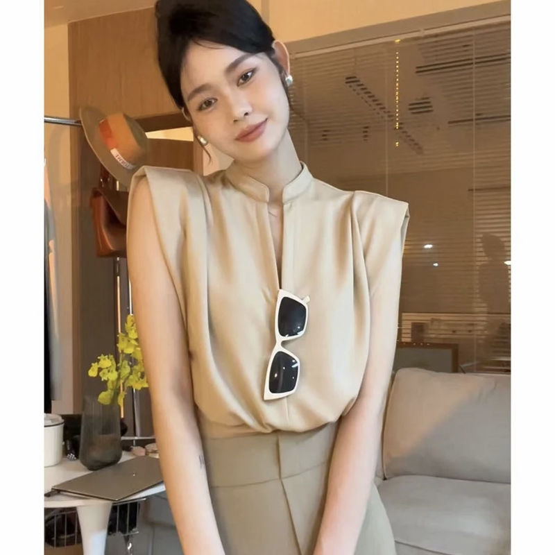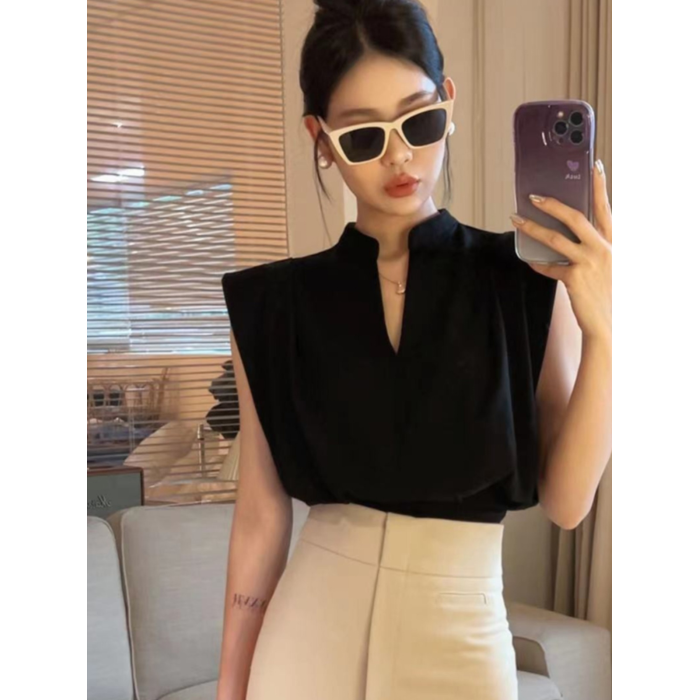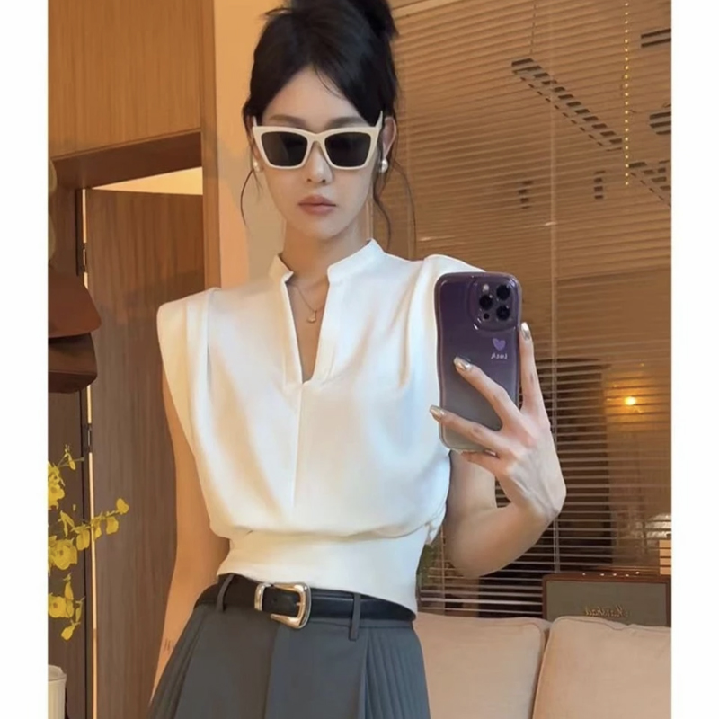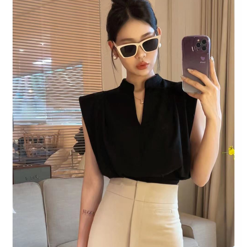 無袖背心墊肩T恤女裝夏季新款套頭正肩小飛袖法式掐腰v領短款上衣