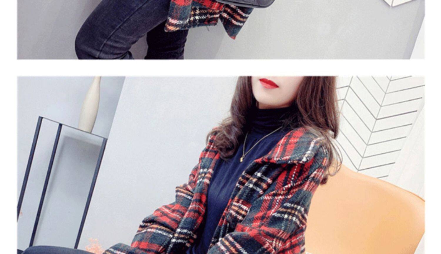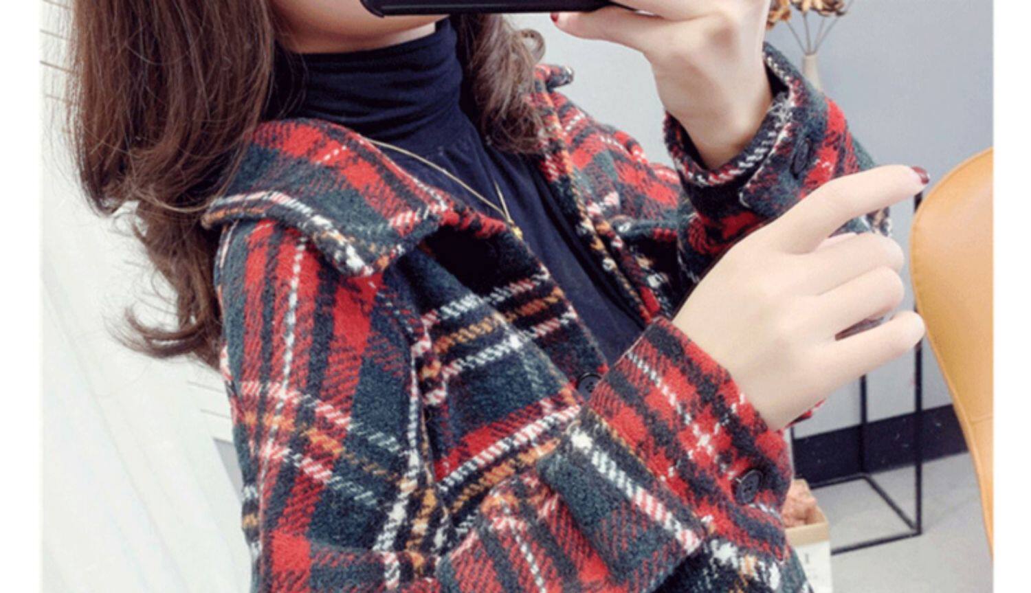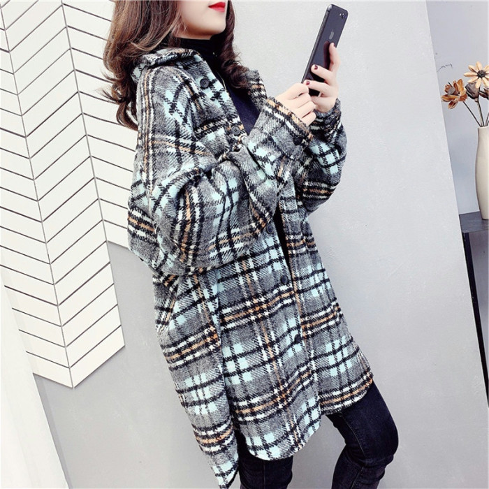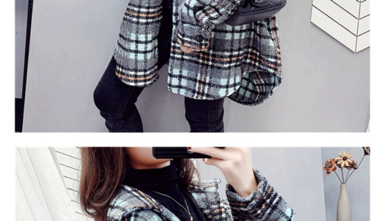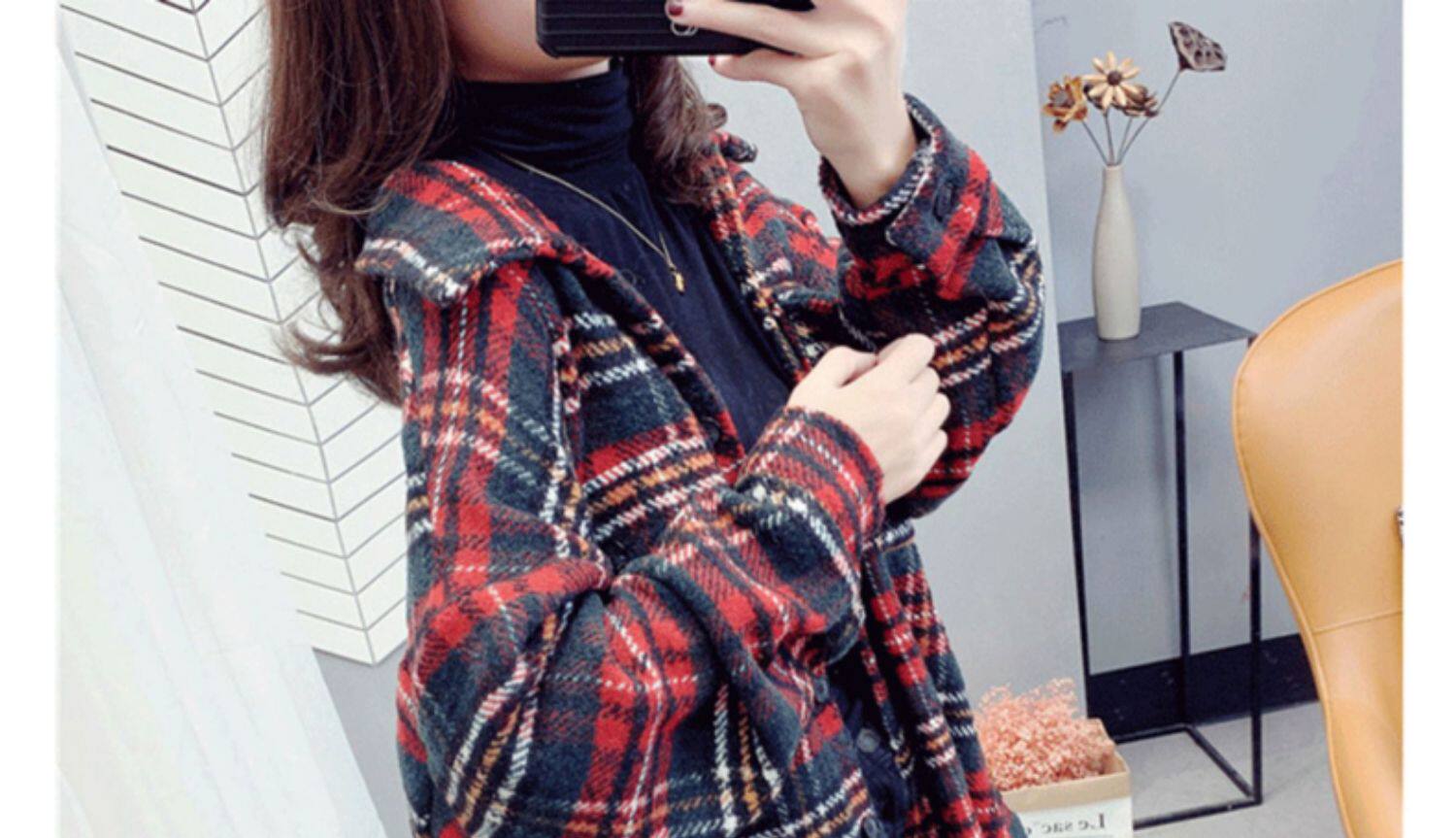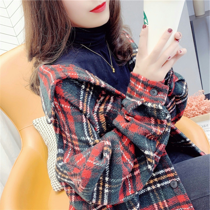 高級感毛呢格子襯衫女秋冬設計感小衆中長款上衣加厚磨毛襯衣外套