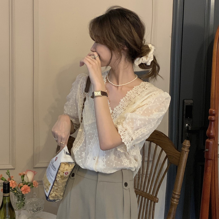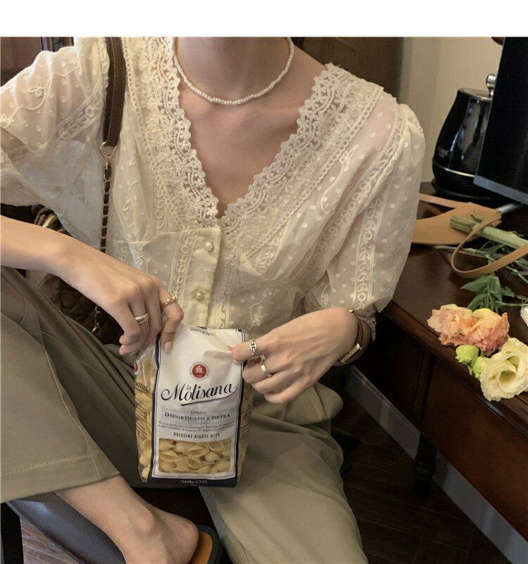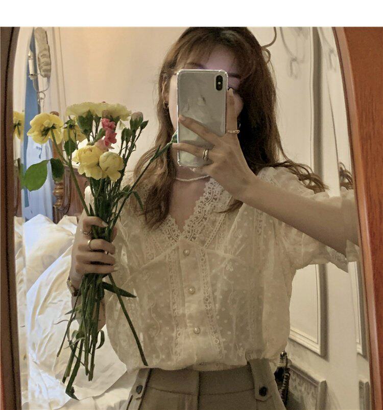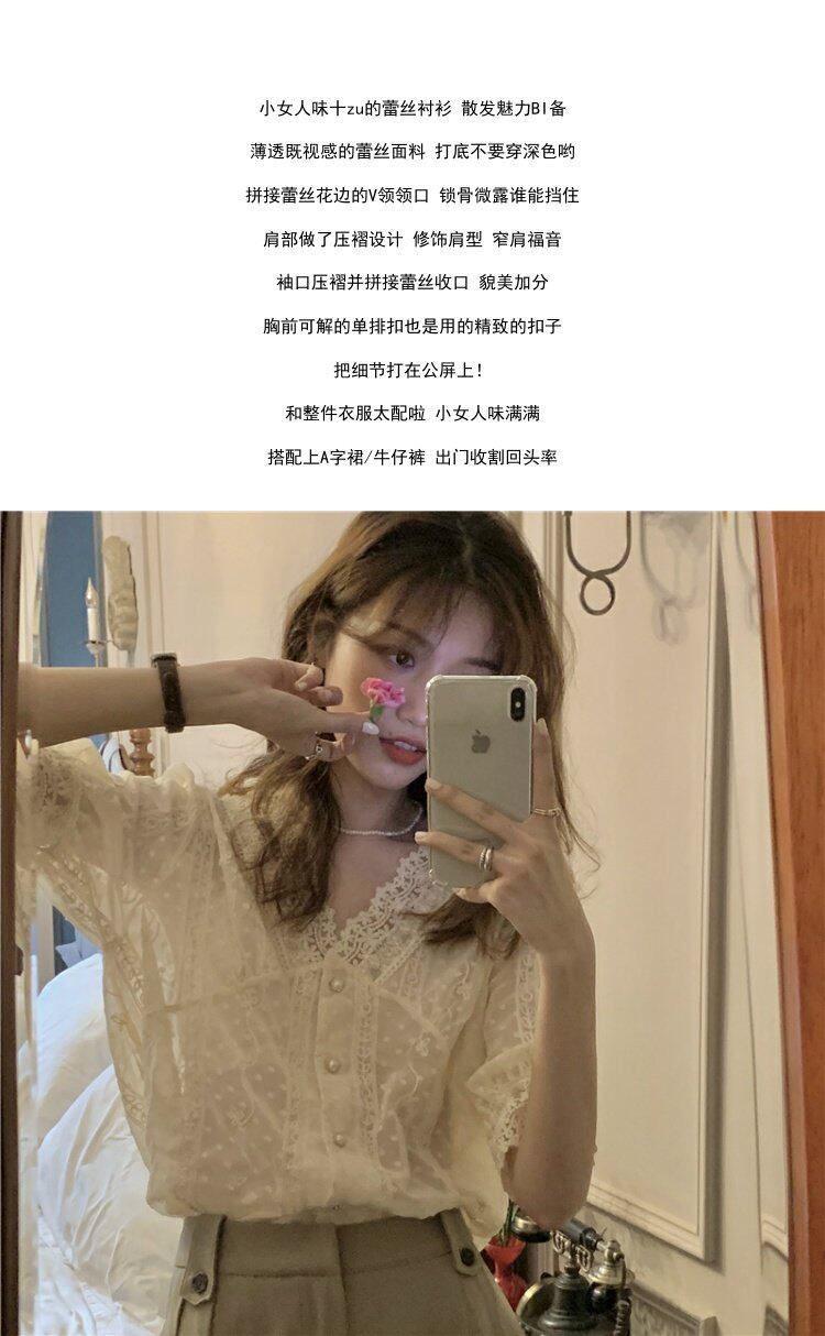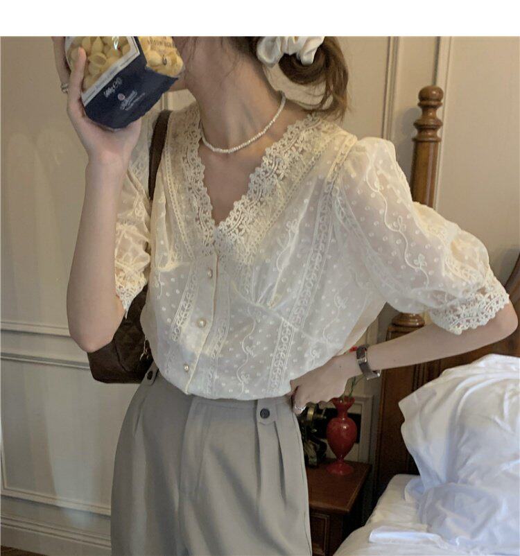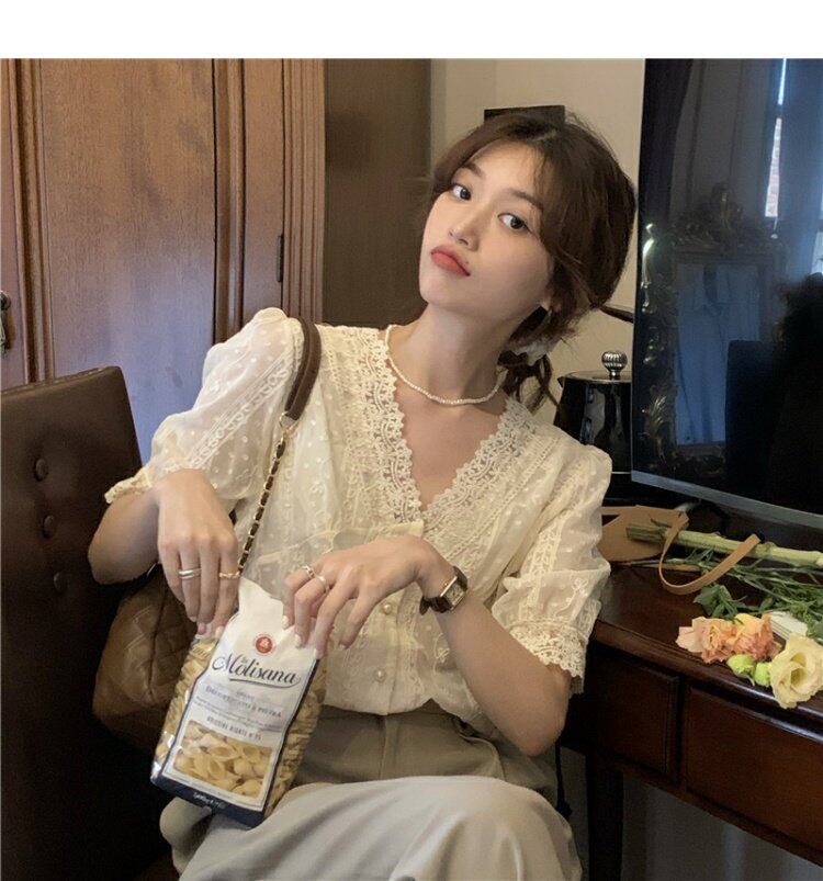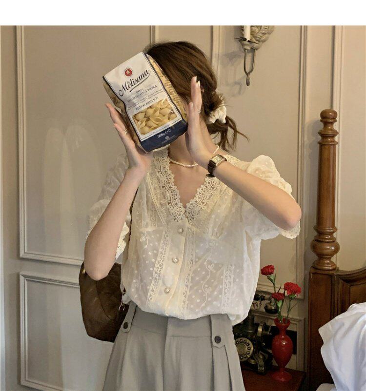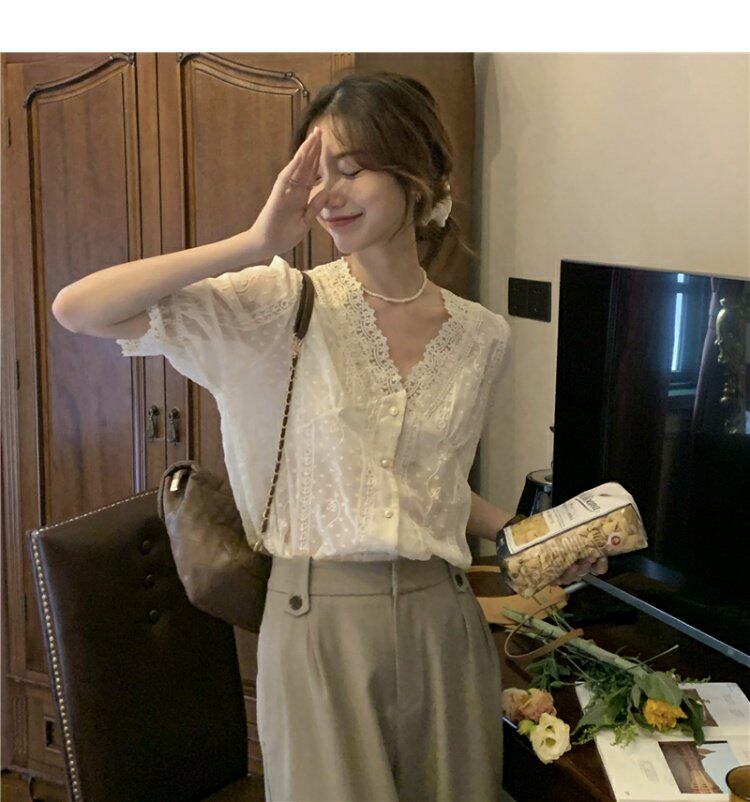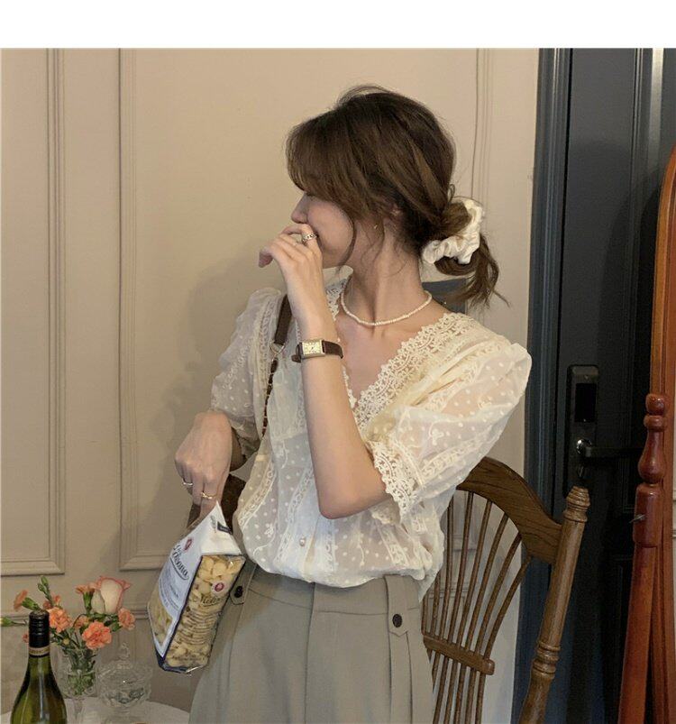 法式復古高級感洋氣氣質寬鬆百搭短袖V領蕾絲花邊雪紡襯衫上衣女