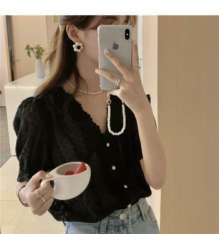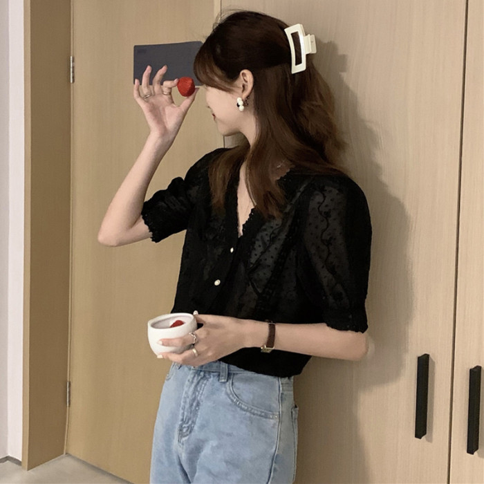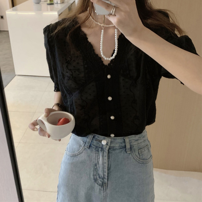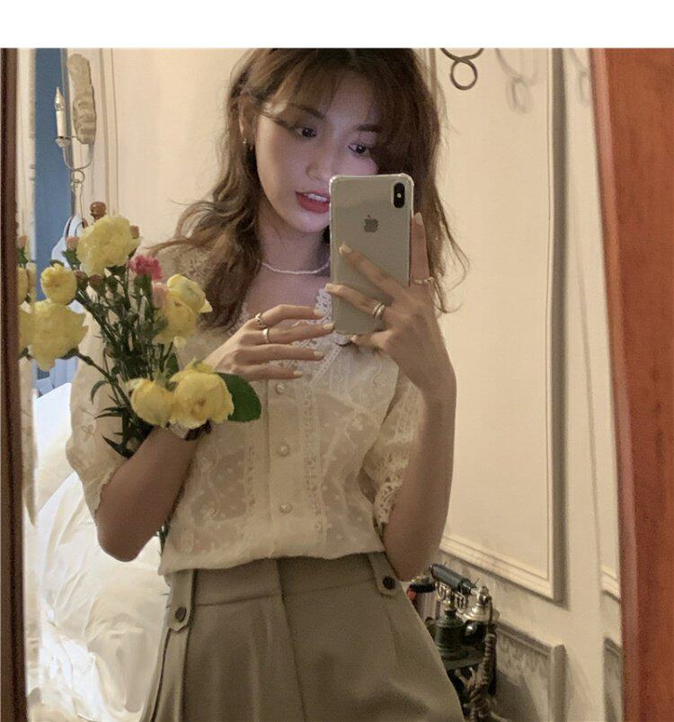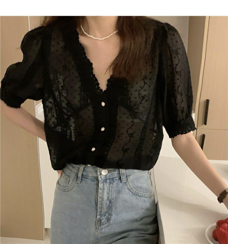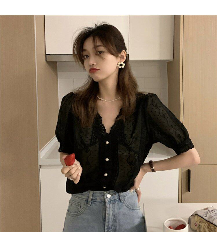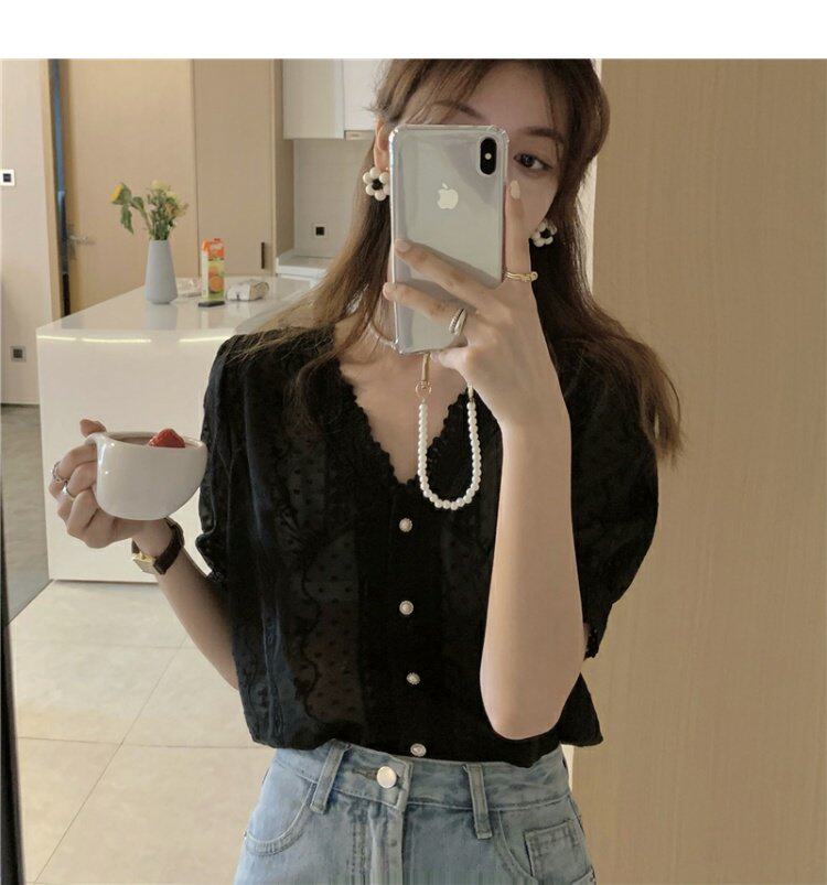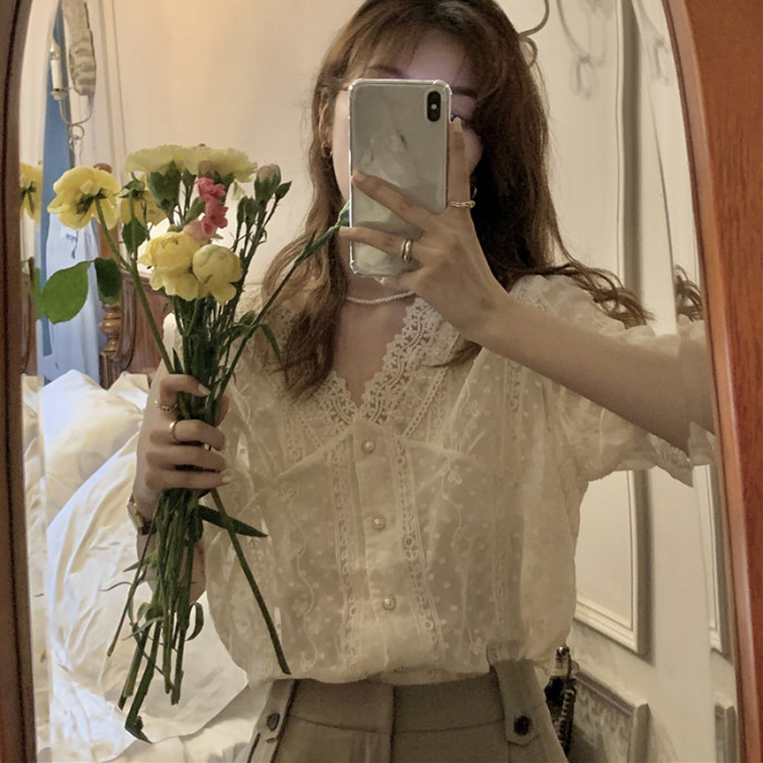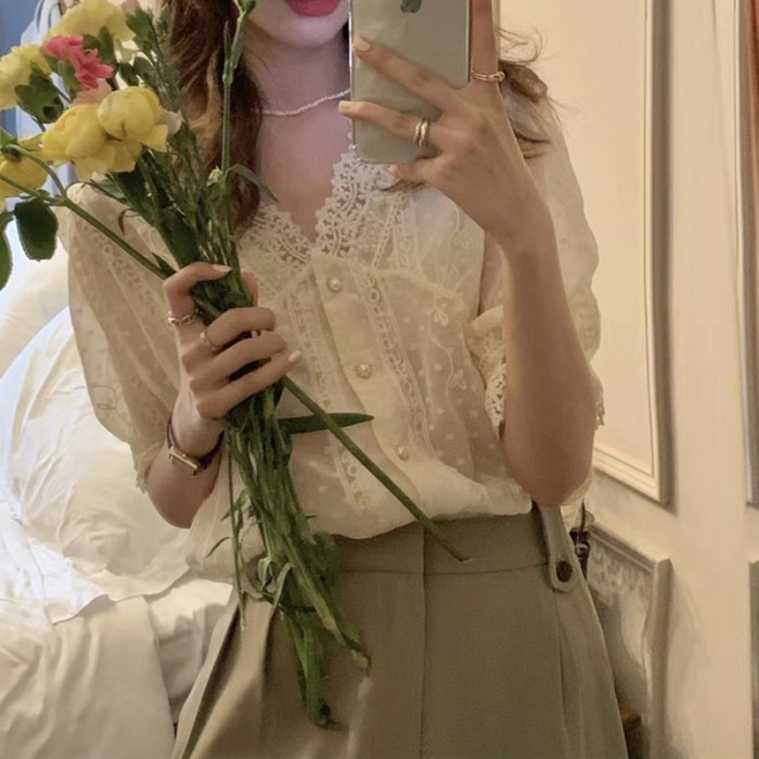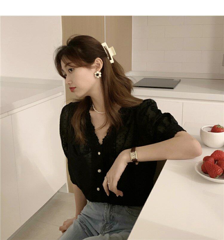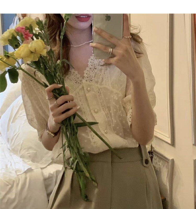 法式復古高級感洋氣氣質寬鬆百搭短袖V領蕾絲花邊雪紡襯衫上衣女