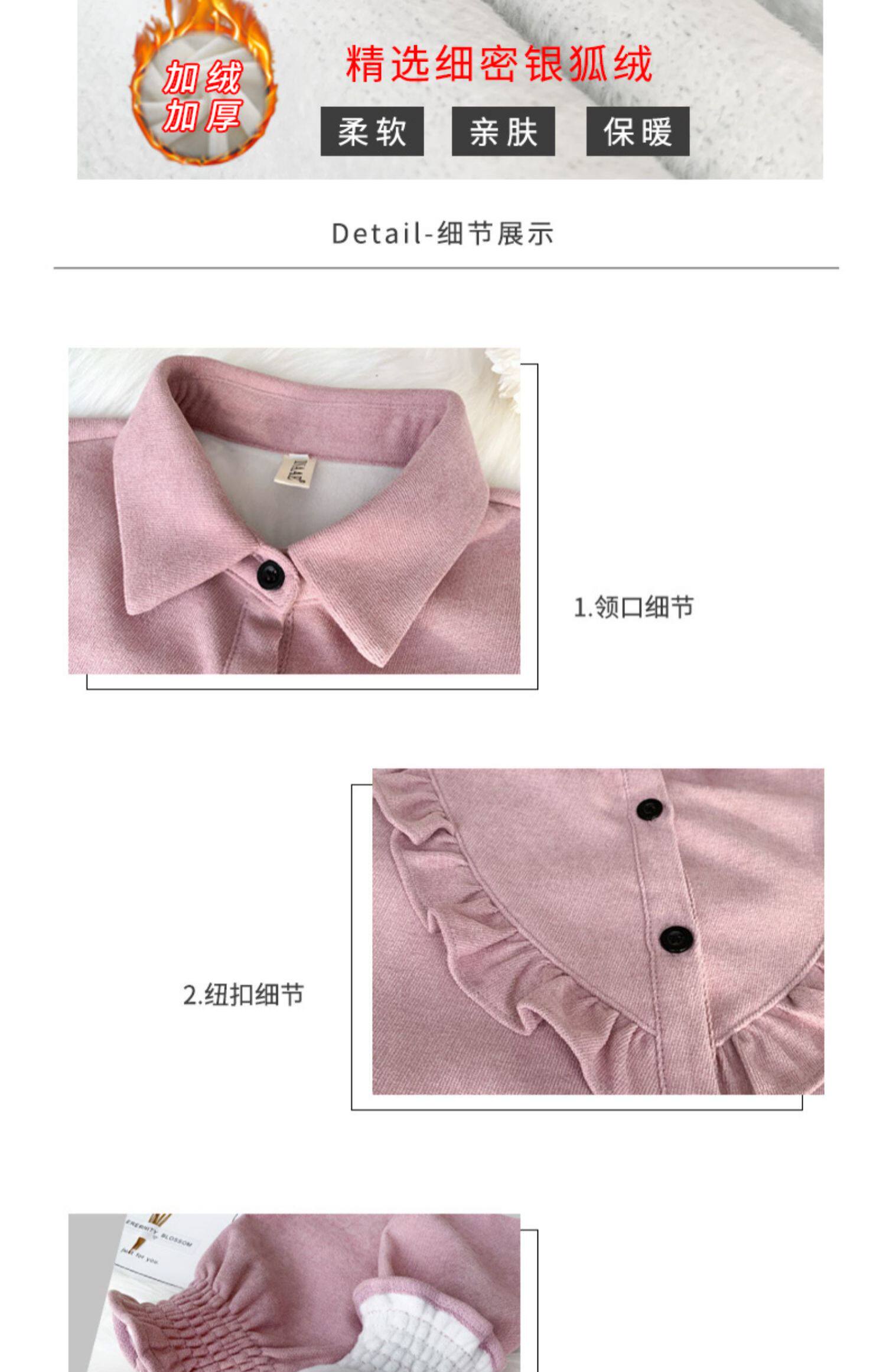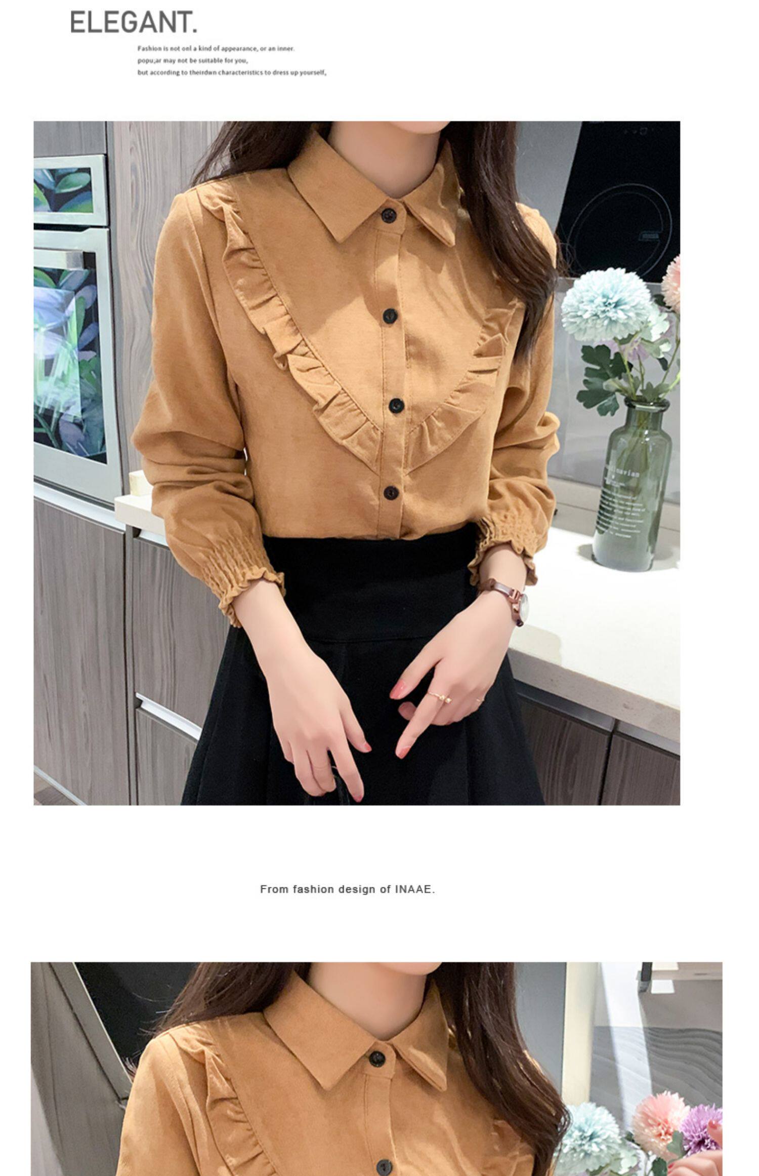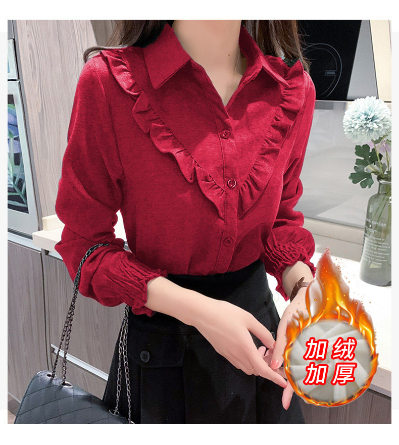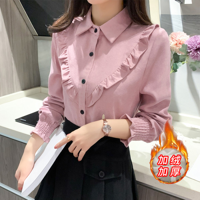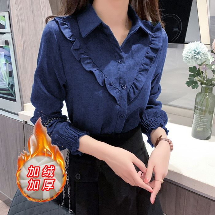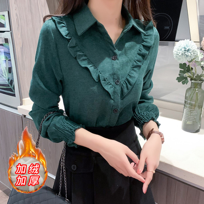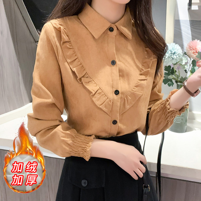 繙領荷葉邊泡泡袖襯衫女秋冬季新款加絨加厚燈芯絨百搭打底衫上衣