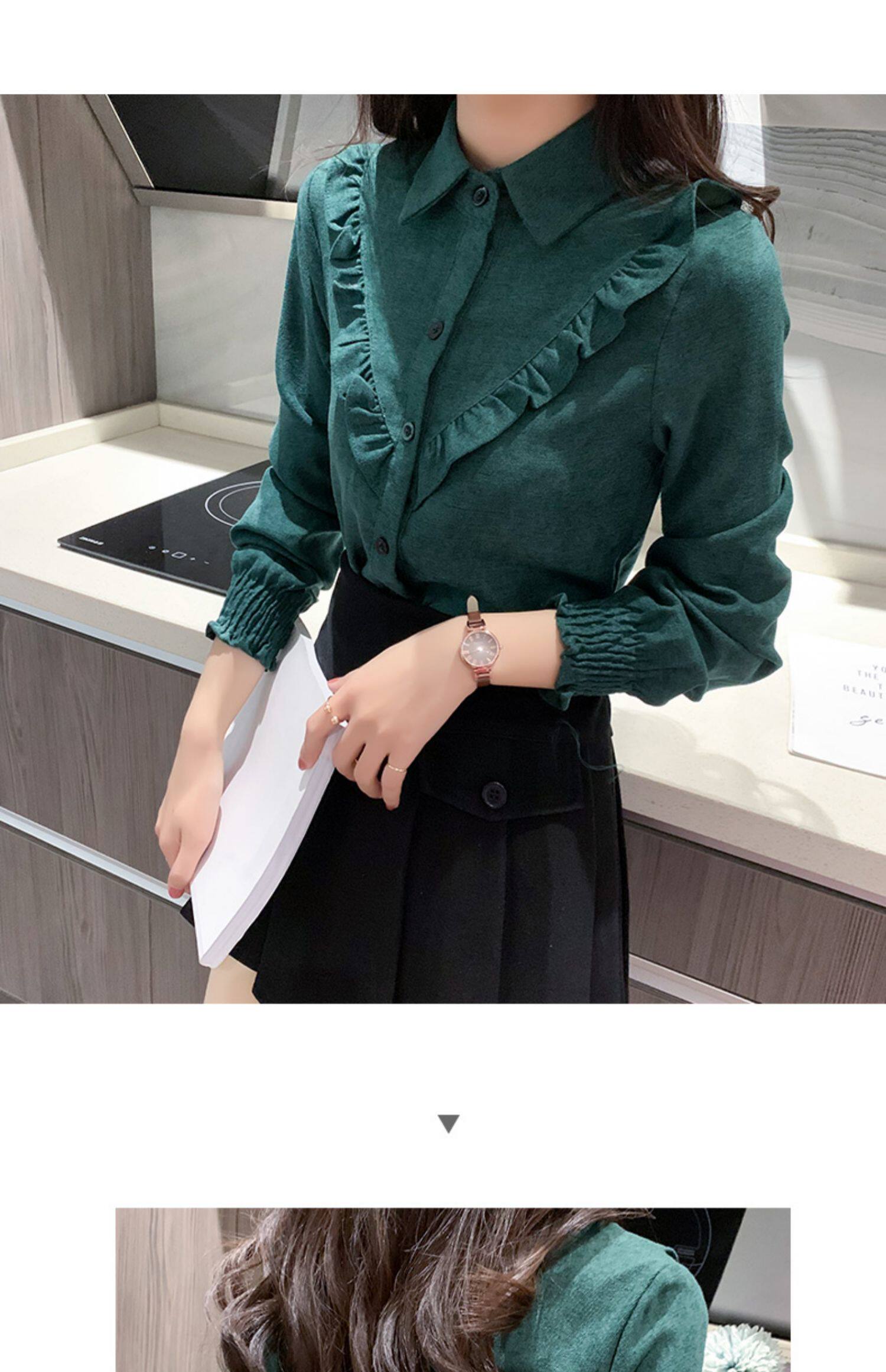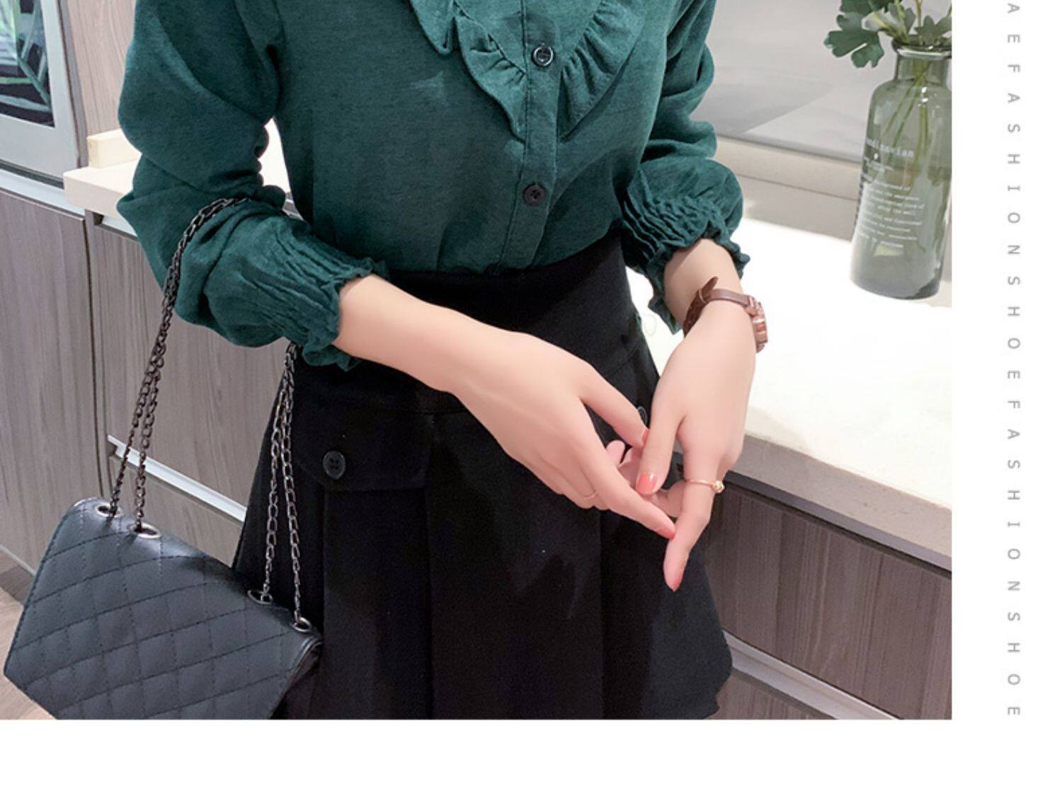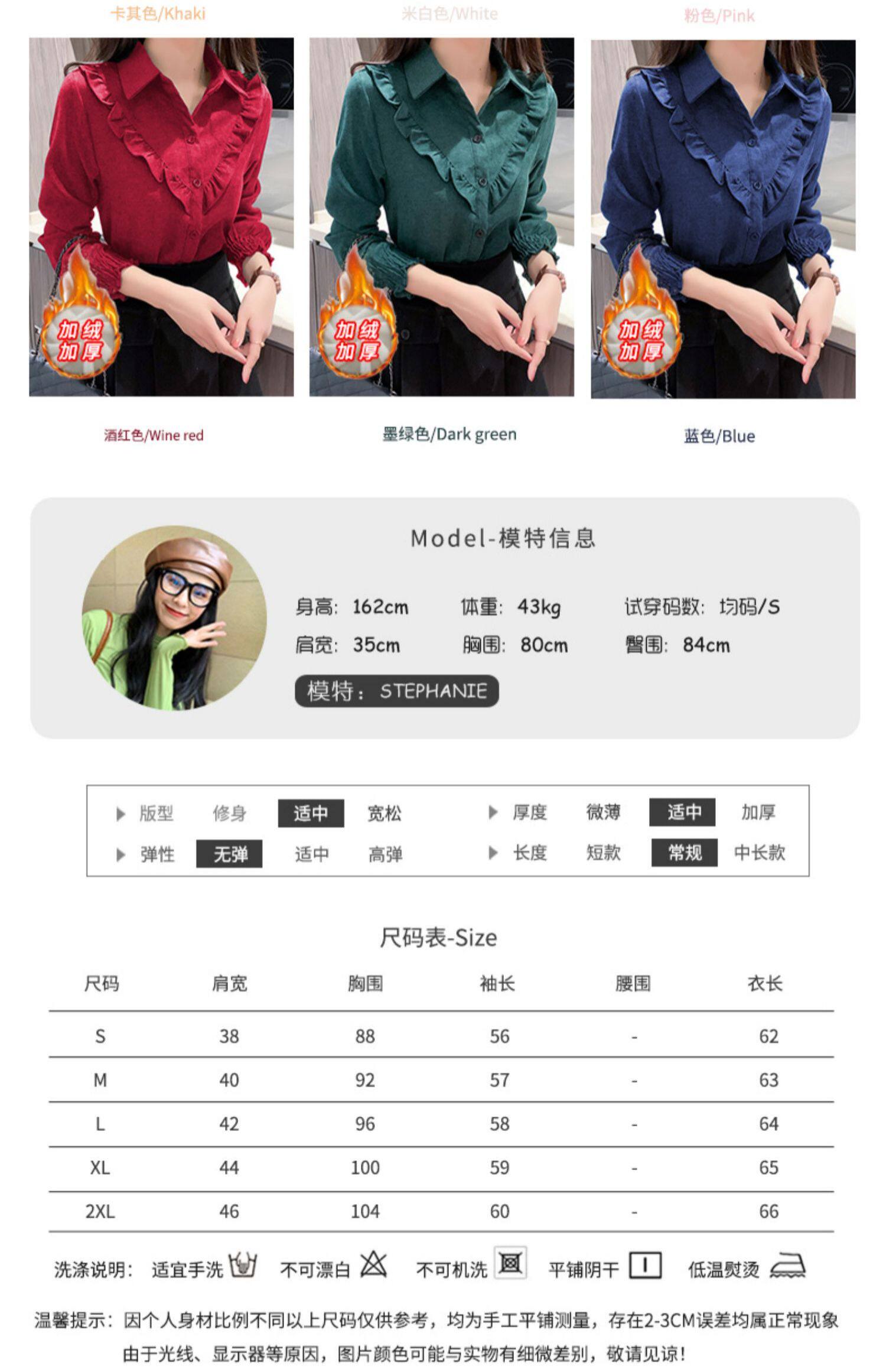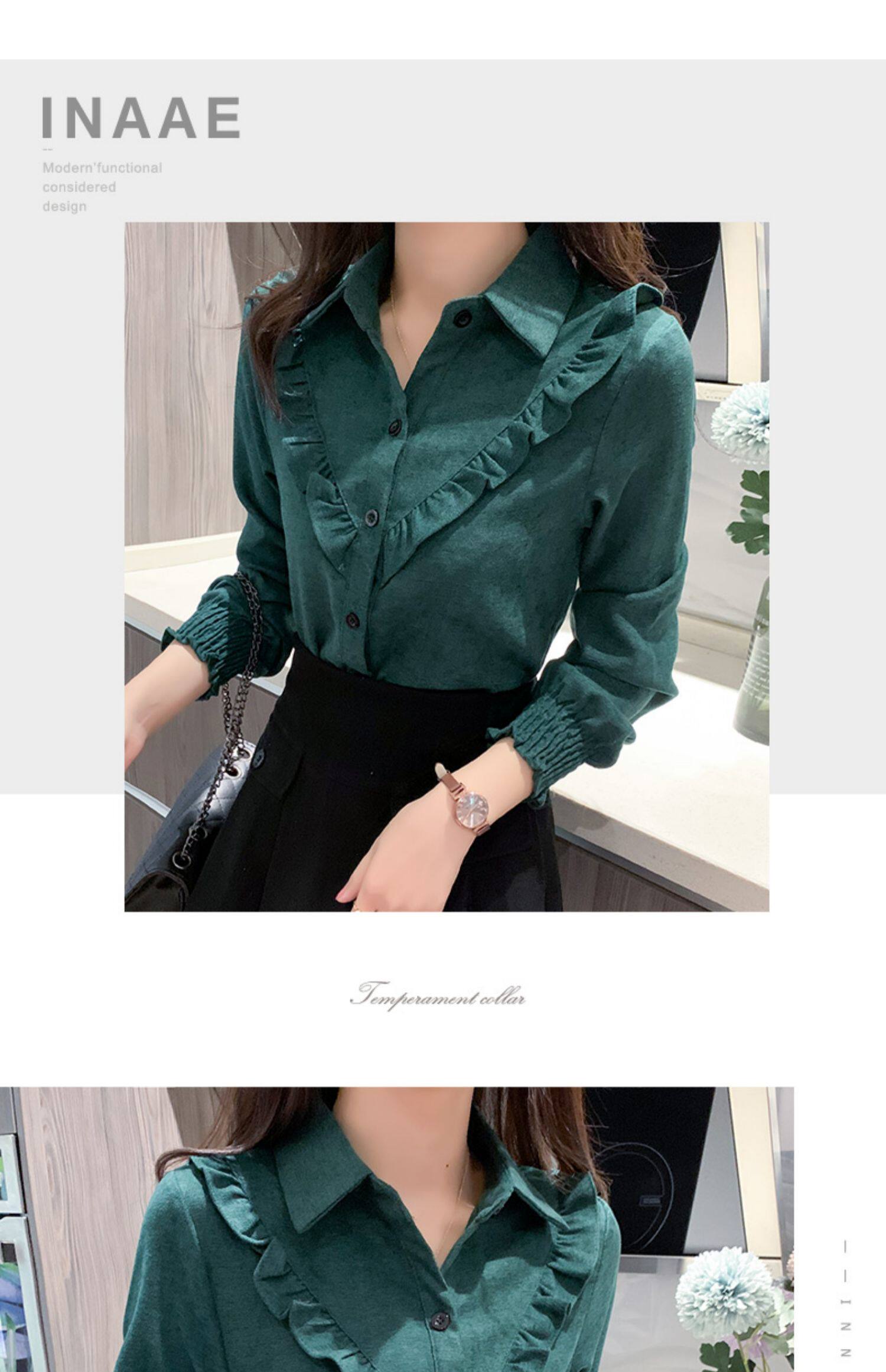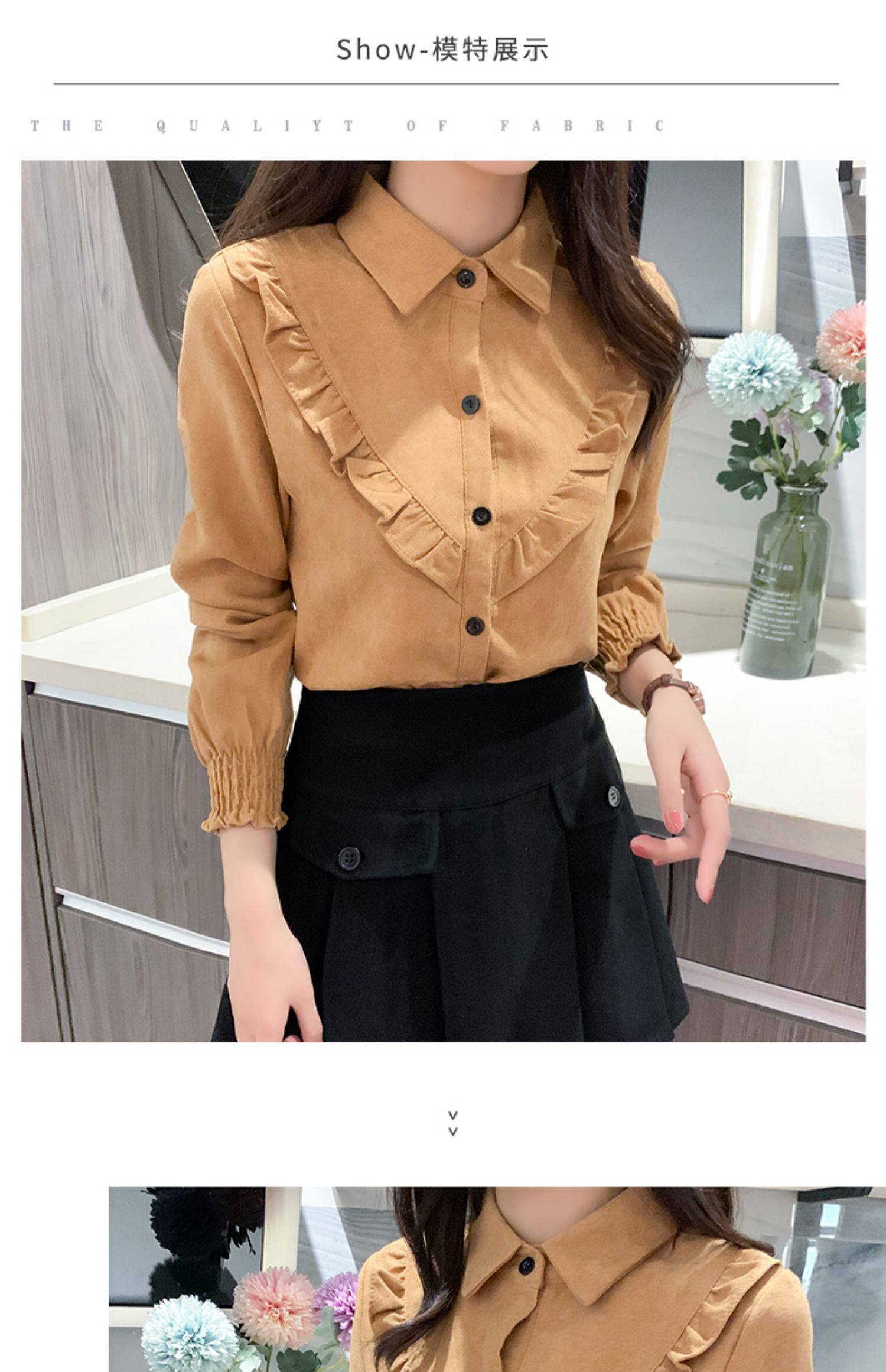 繙領荷葉邊泡泡袖襯衫女秋冬季新款加絨加厚燈芯絨百搭打底衫上衣