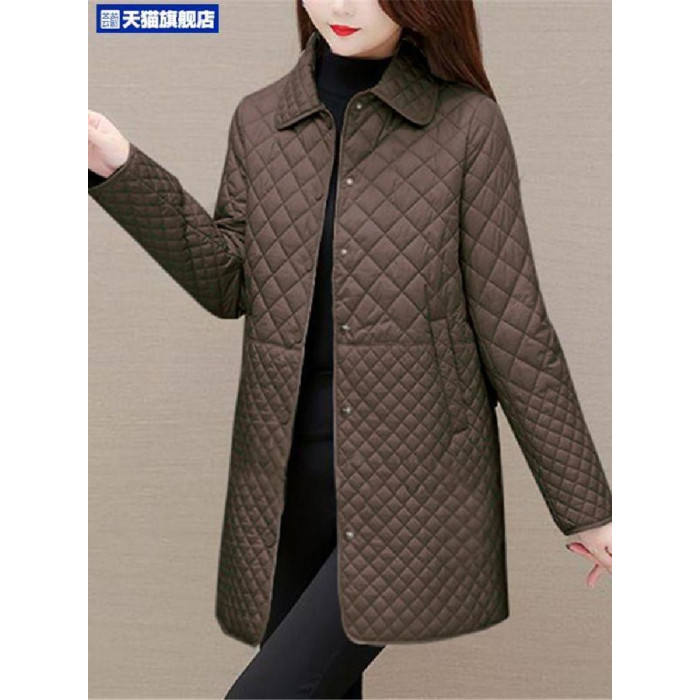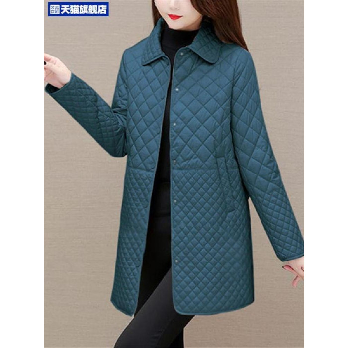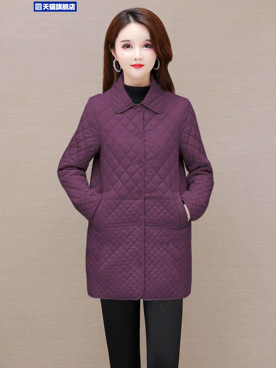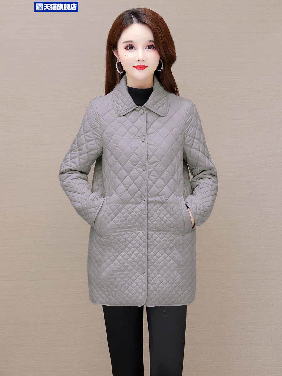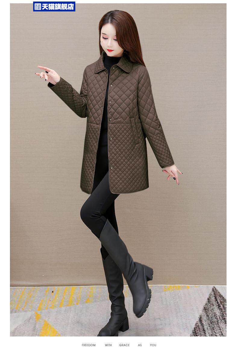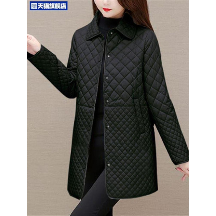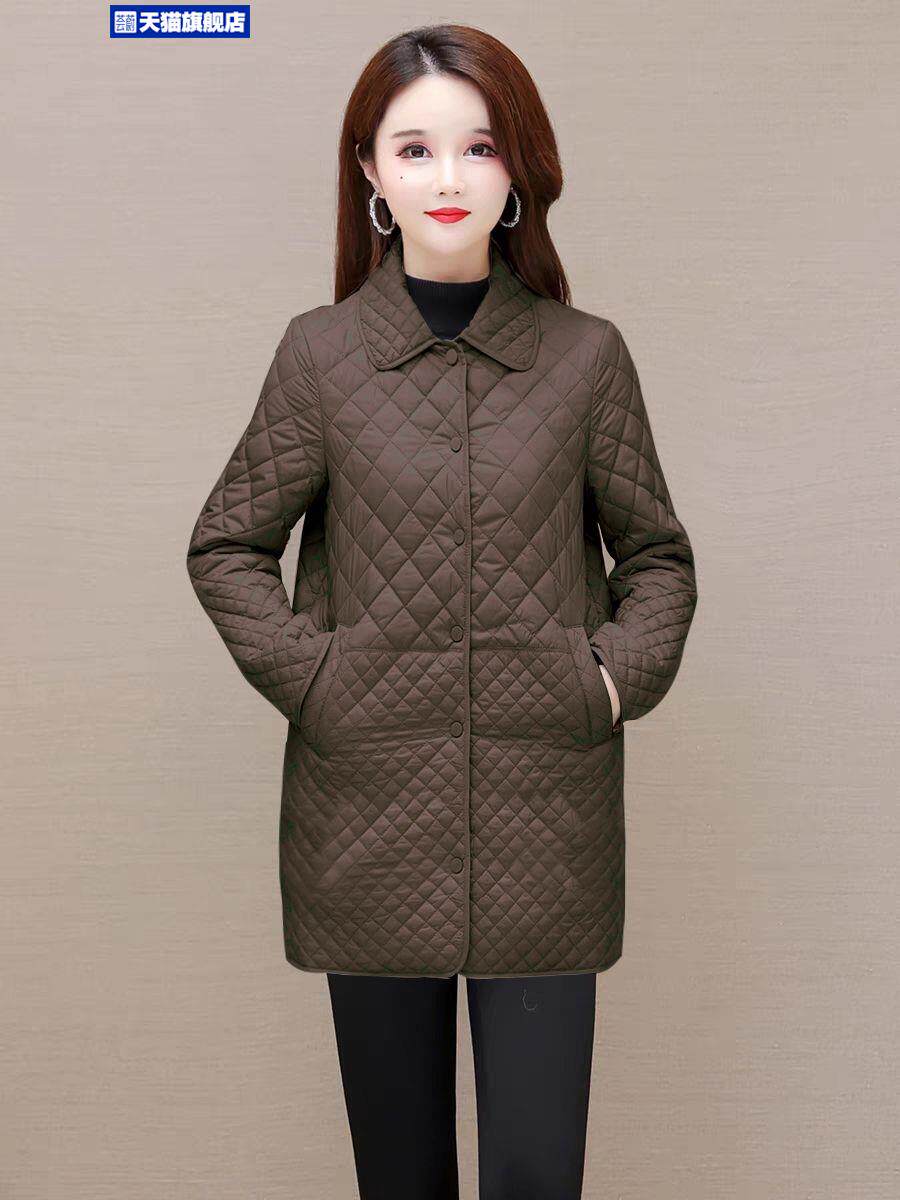 大碼菱形格子夾棉薄外套女春秋新款中年媽媽裝寬鬆中長款棉服棉襖