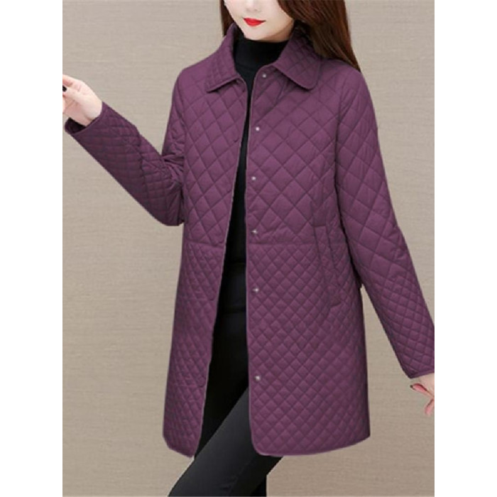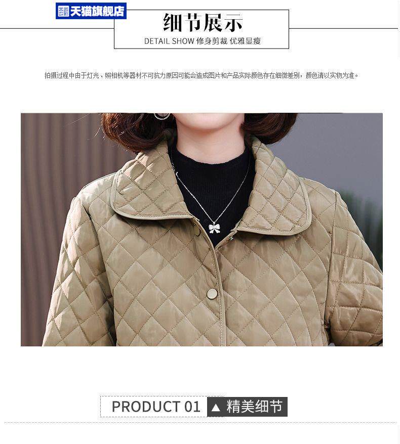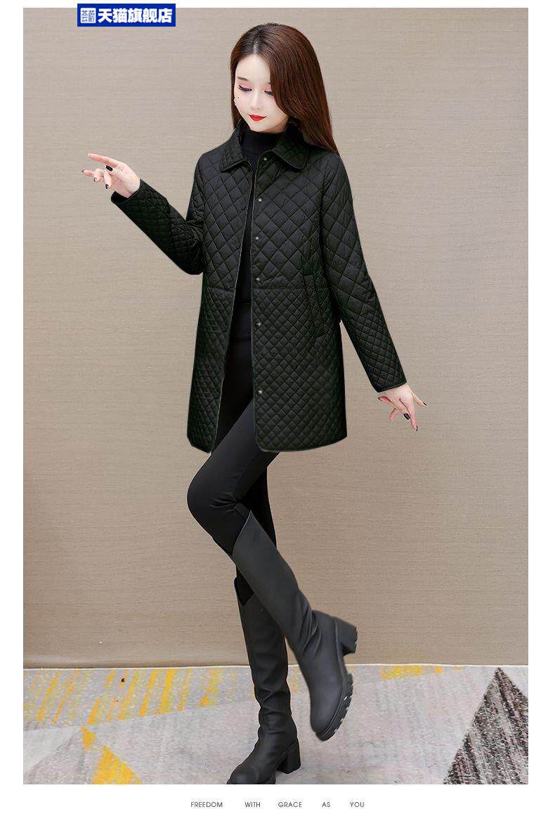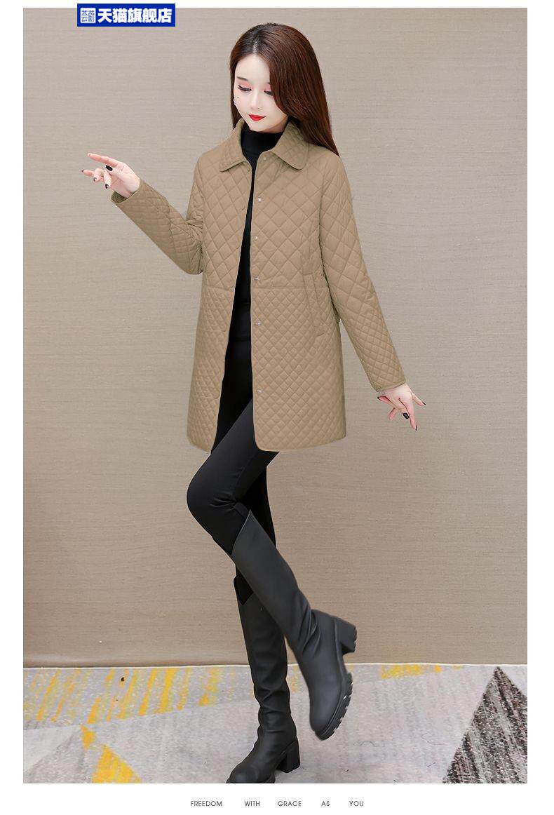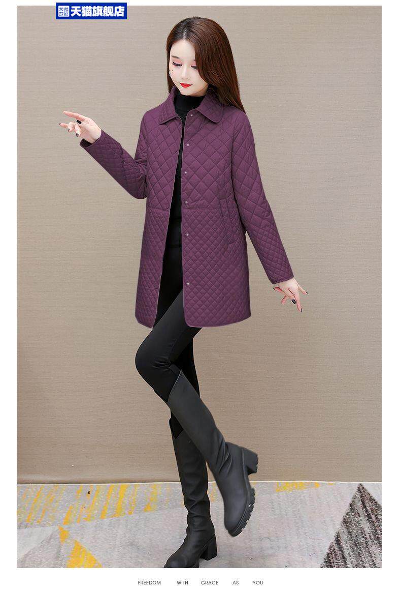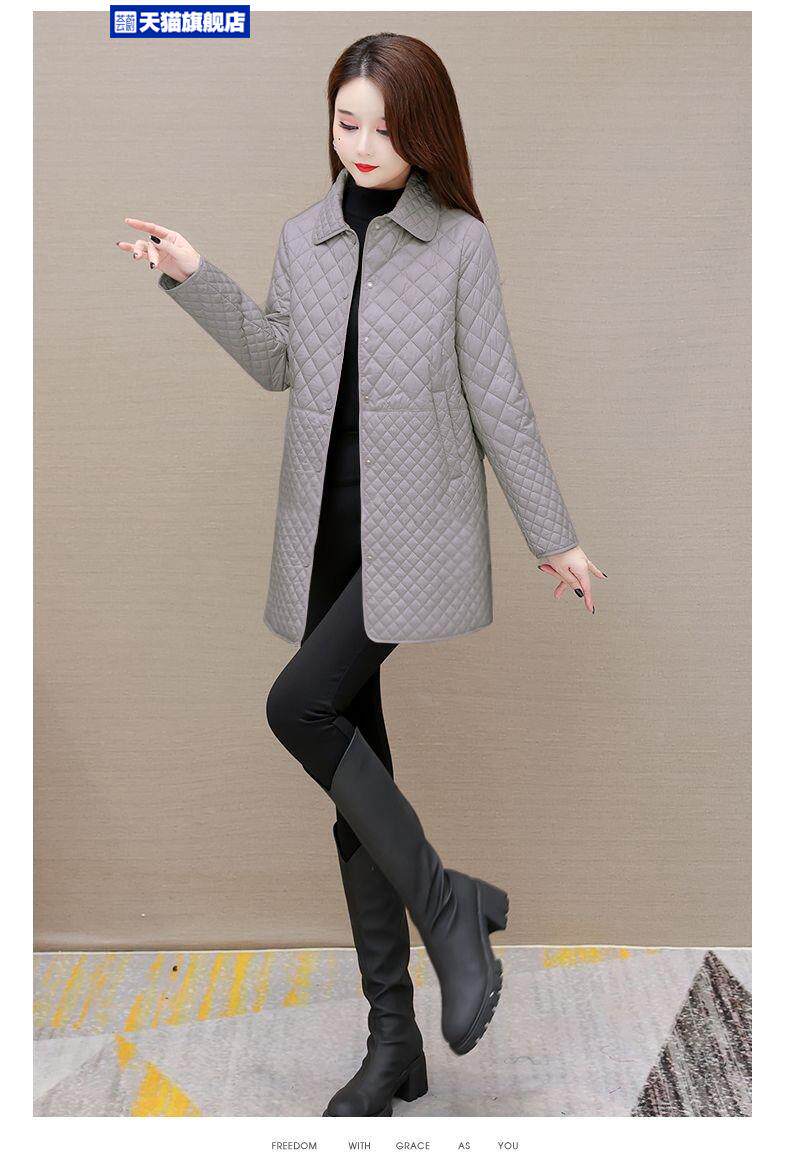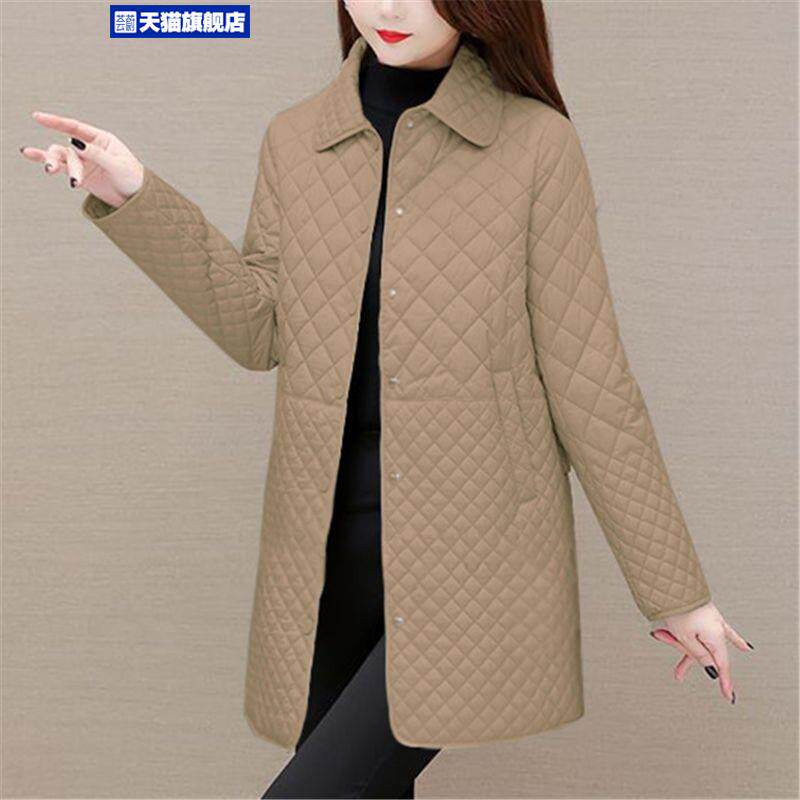 大碼菱形格子夾棉薄外套女春秋新款中年媽媽裝寬鬆中長款棉服棉襖