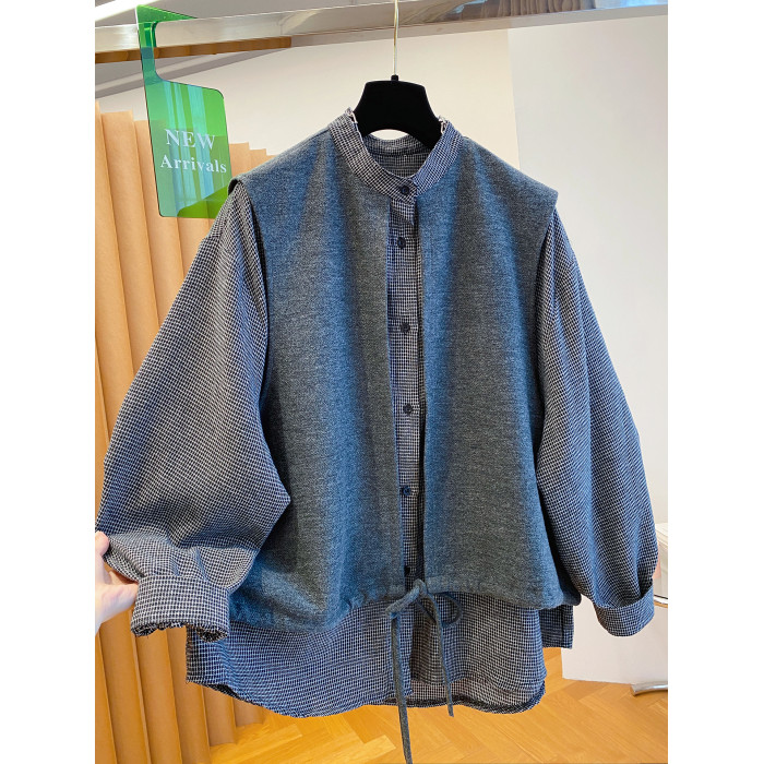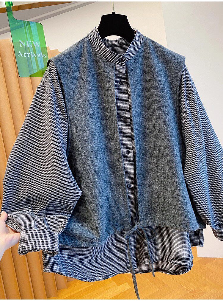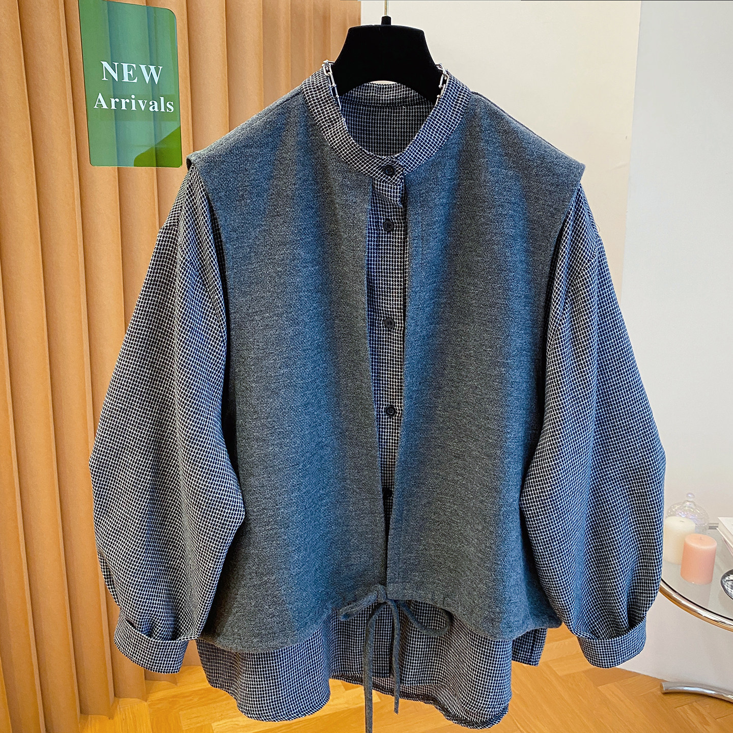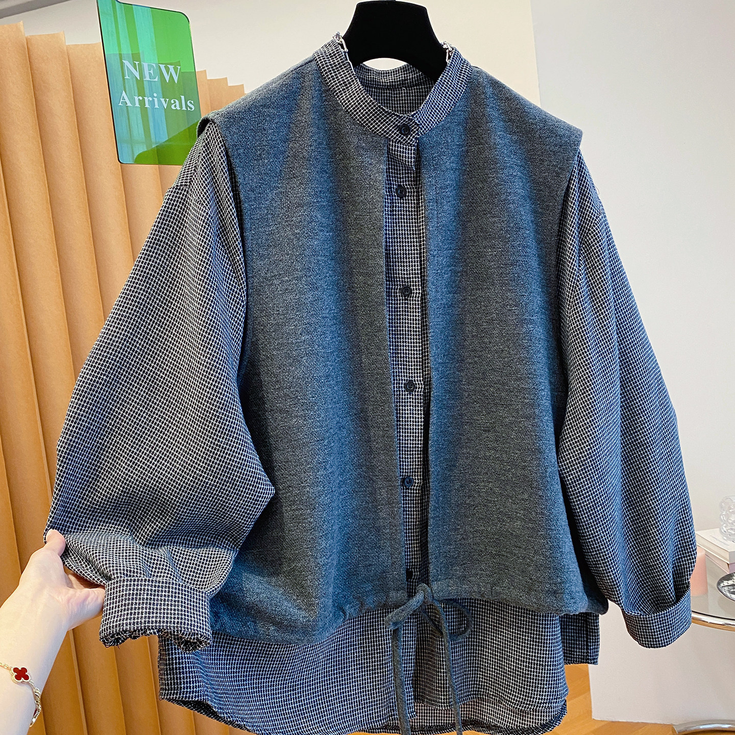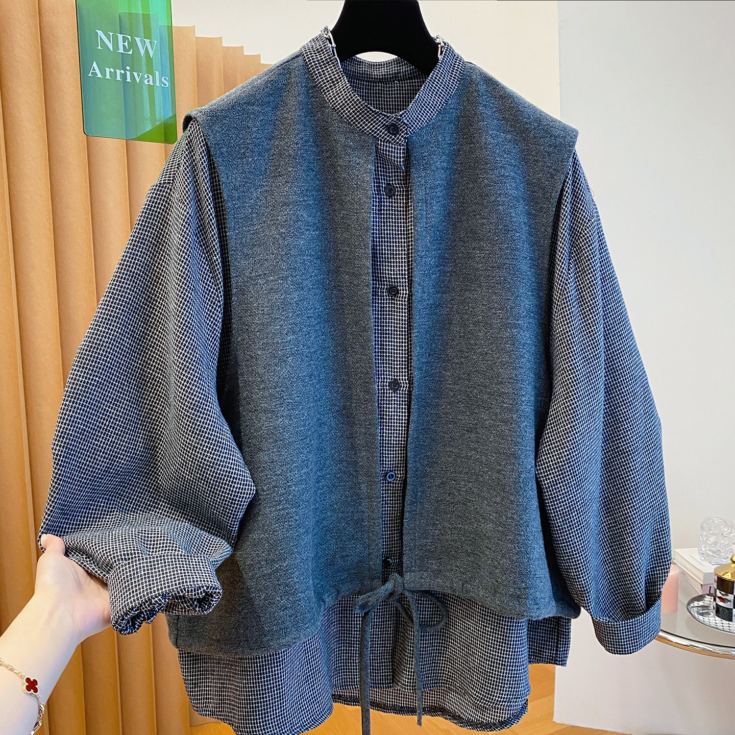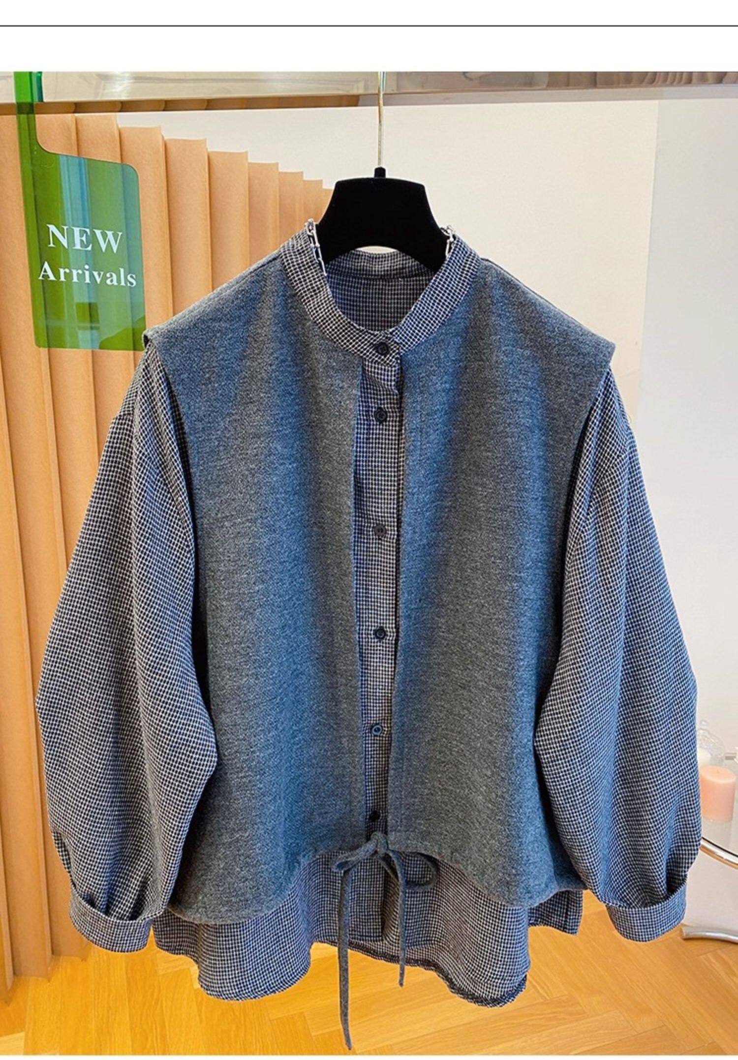 長袖襯衫女2026春秋新款胖妹妹馬甲拼接格子假兩件上衣襯衣高級感