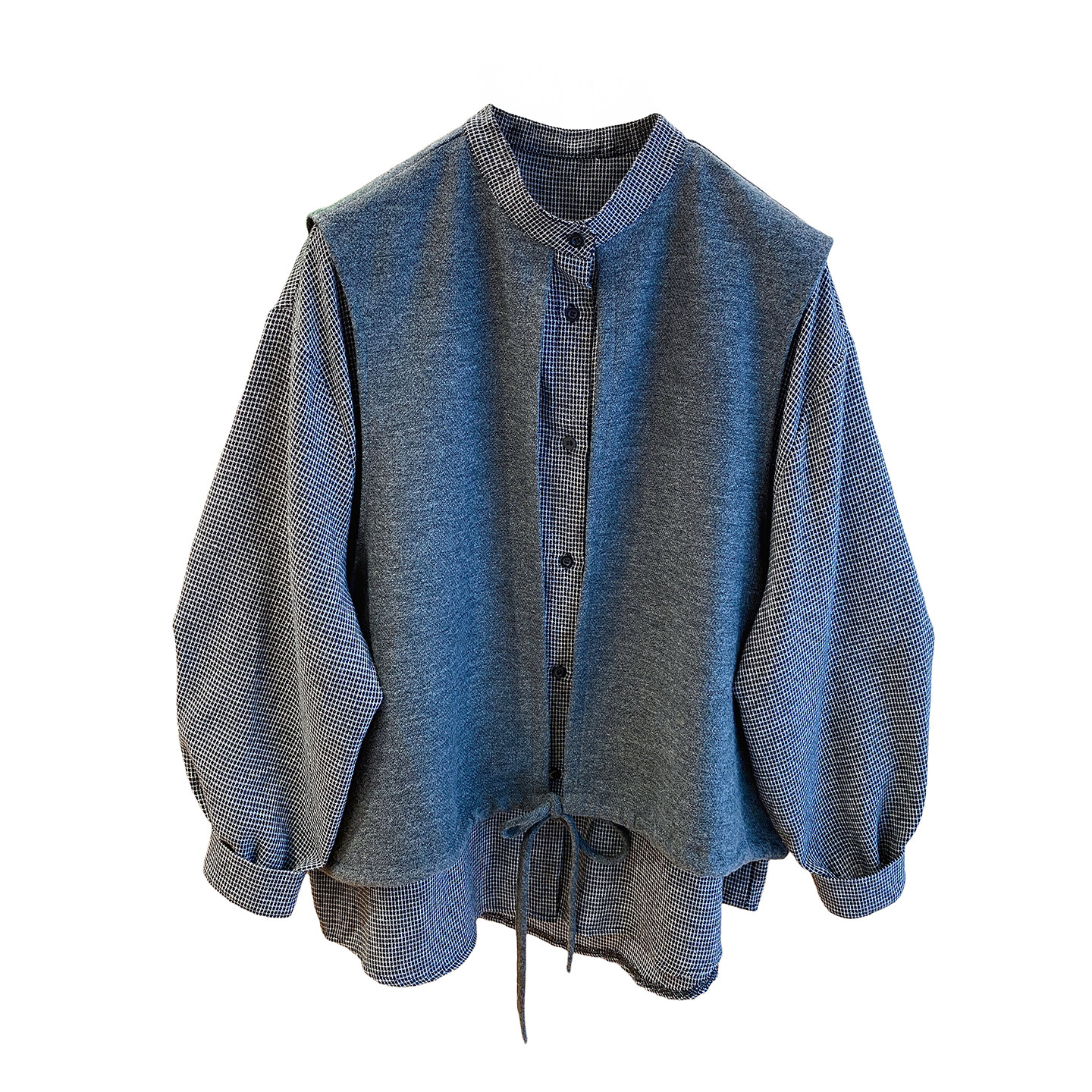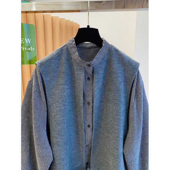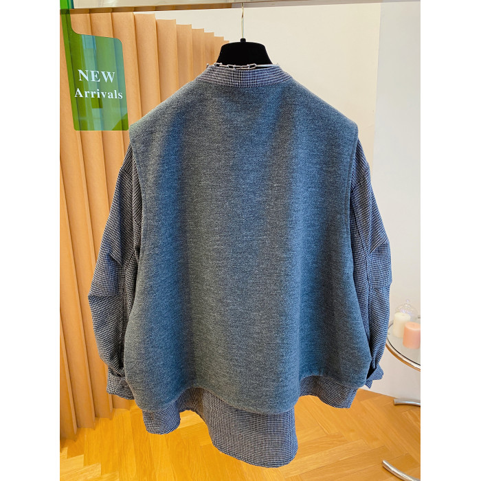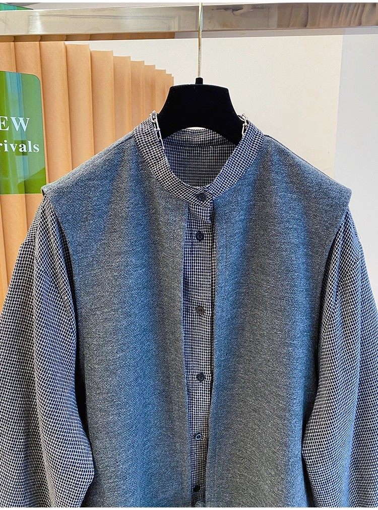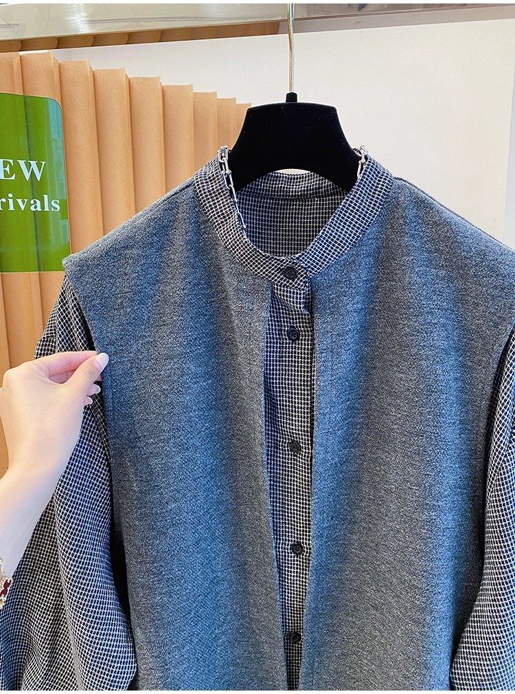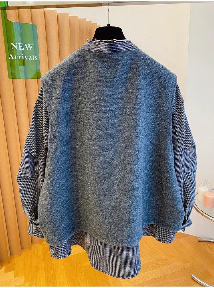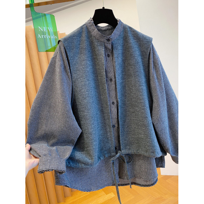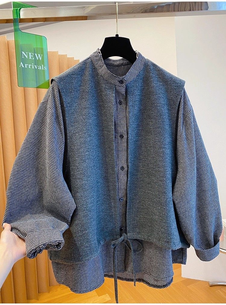長袖襯衫女2026春秋新款胖妹妹馬甲拼接格子假兩件上衣襯衣高級感