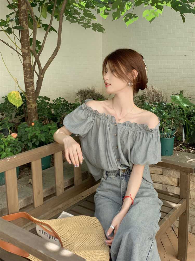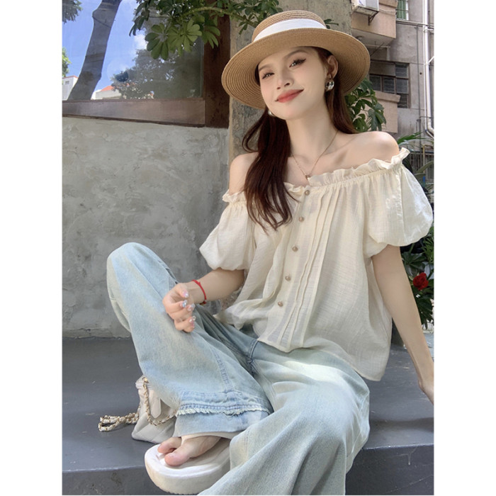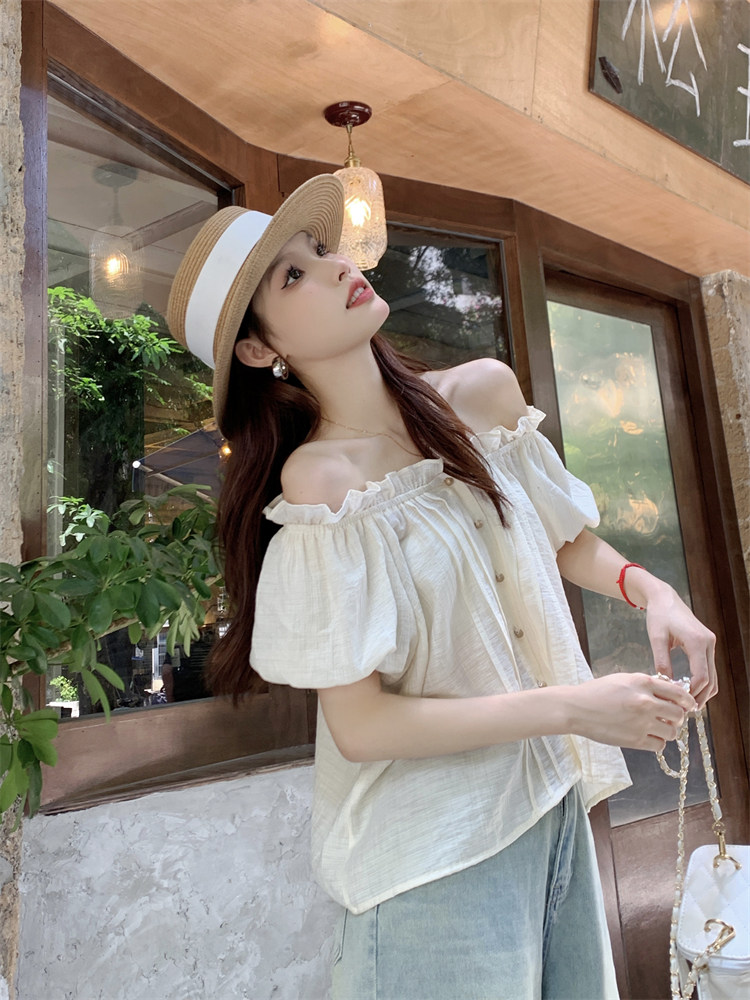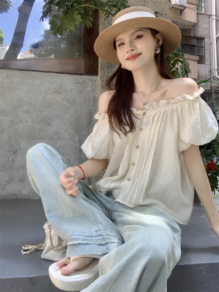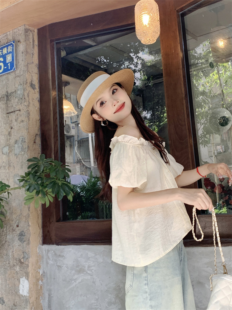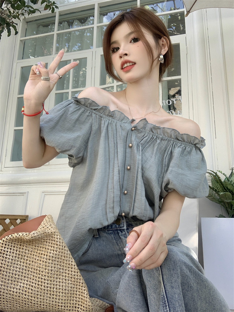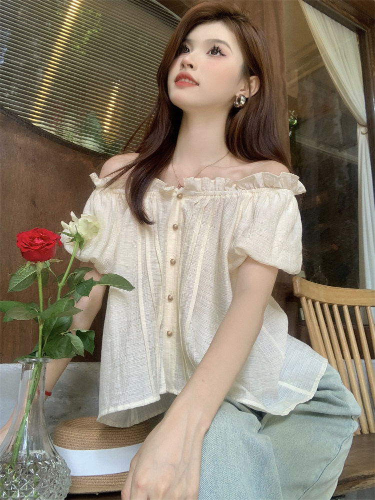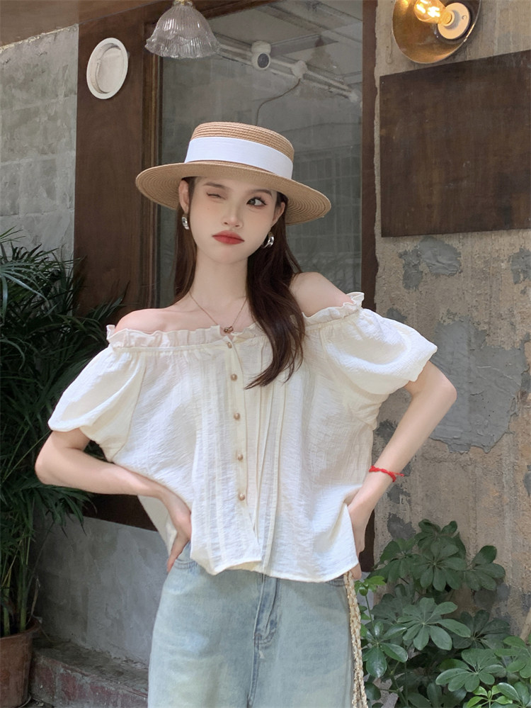 法式復古高級感洋氣氣質甜美短袖一字領露肩泡泡袖短款襯衫上衣女