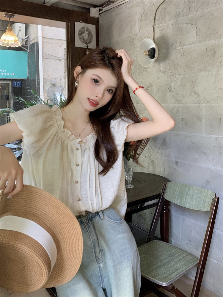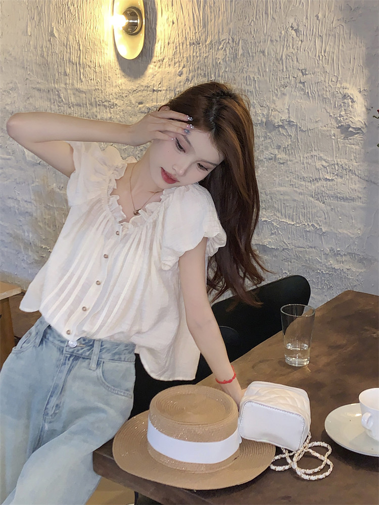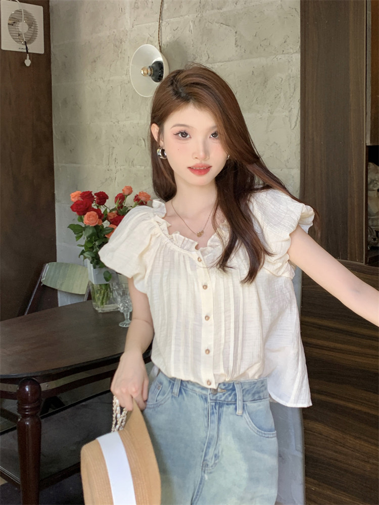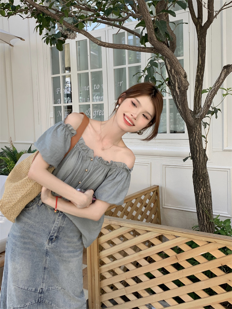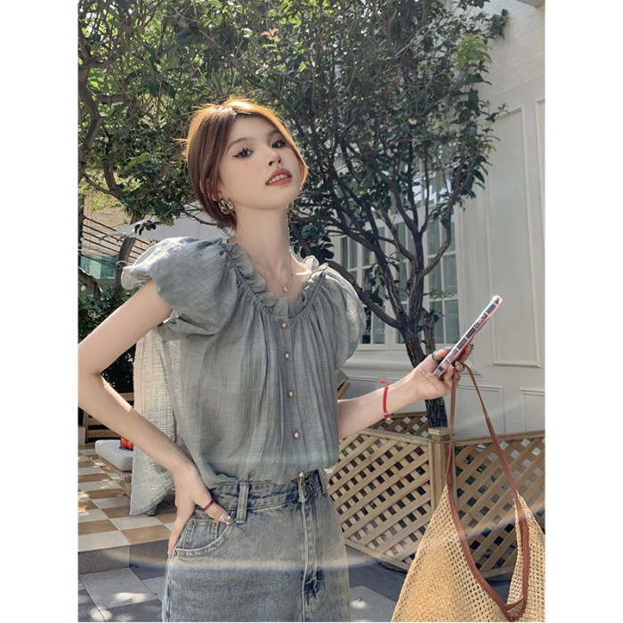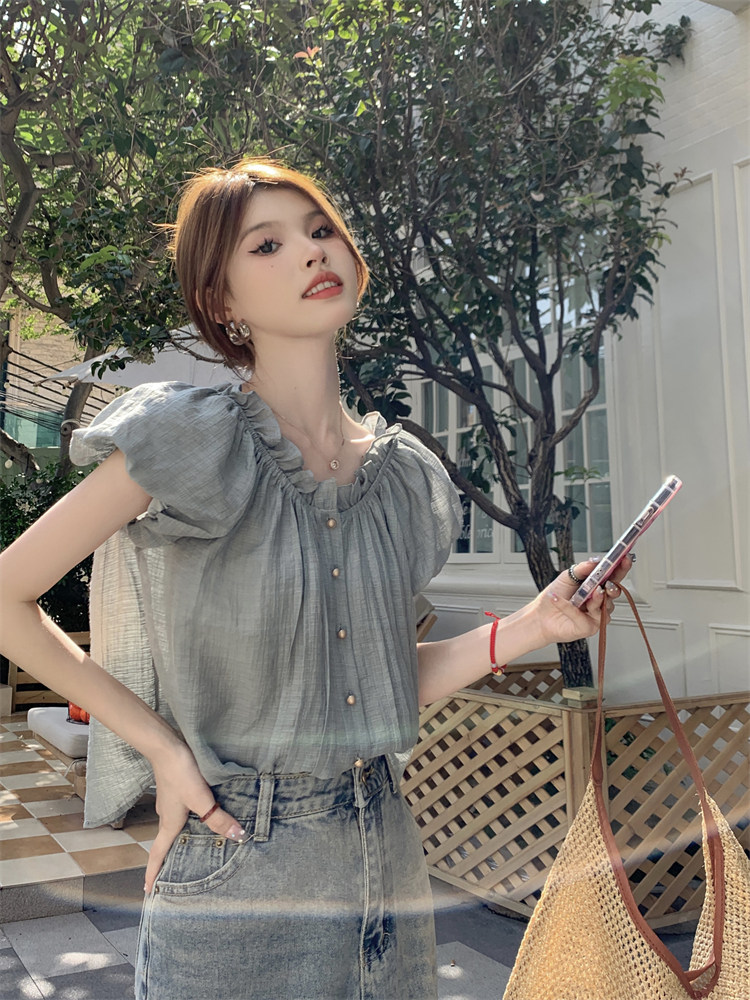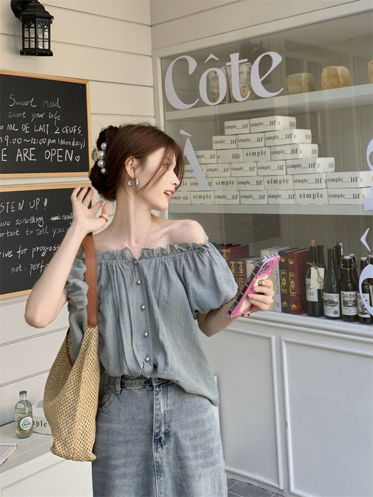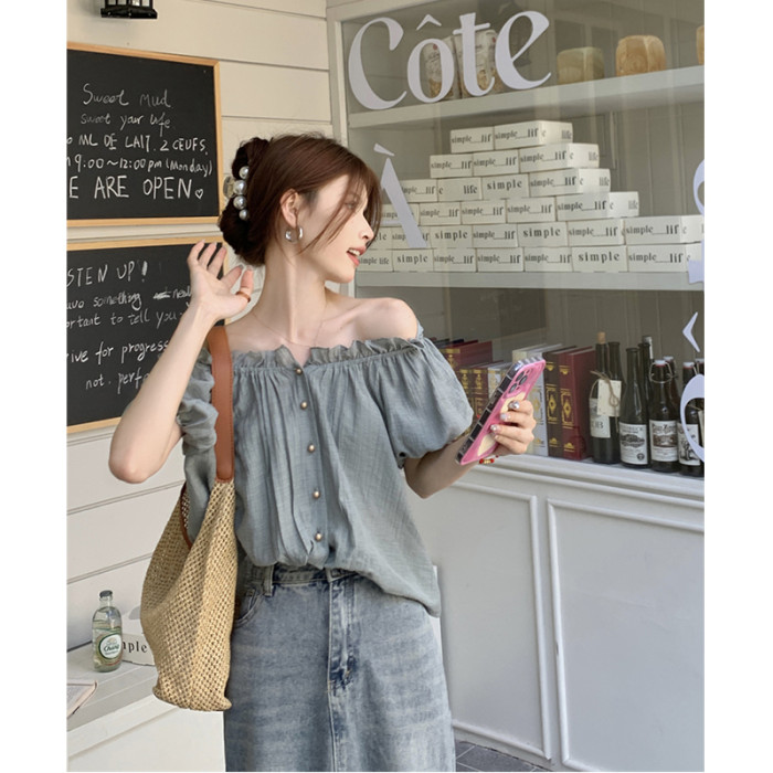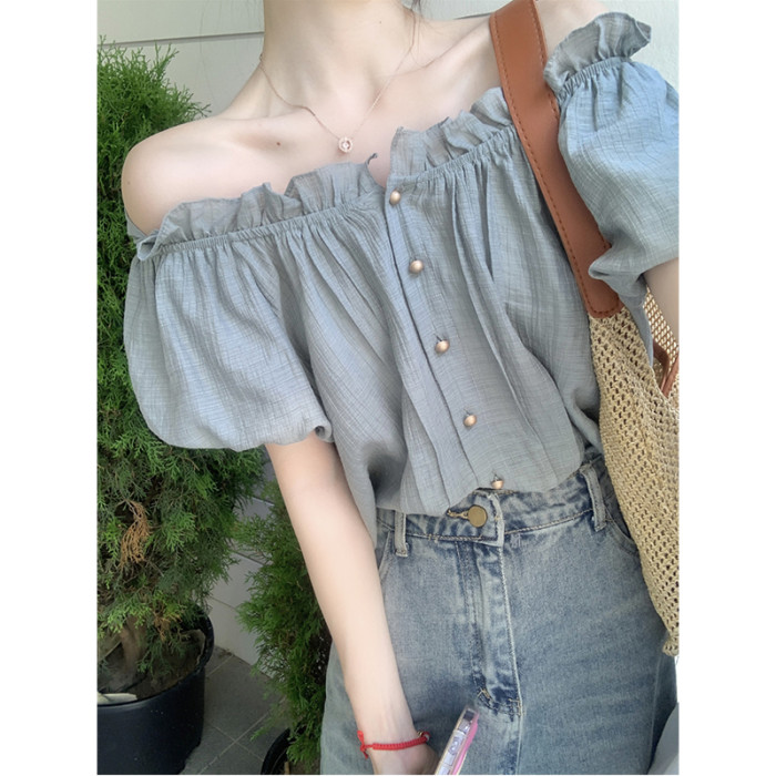 法式復古高級感洋氣氣質甜美短袖一字領露肩泡泡袖短款襯衫上衣女
