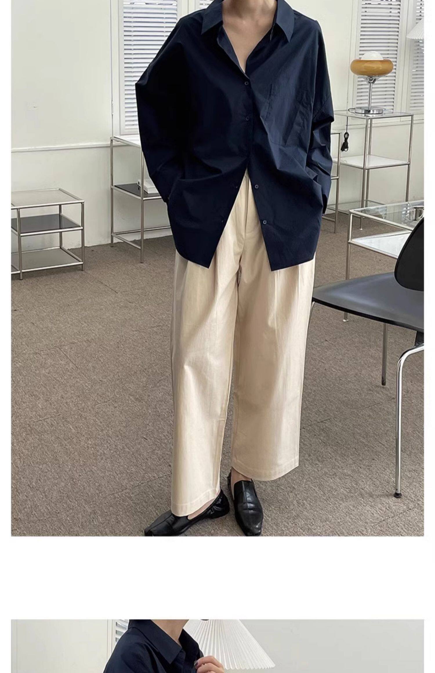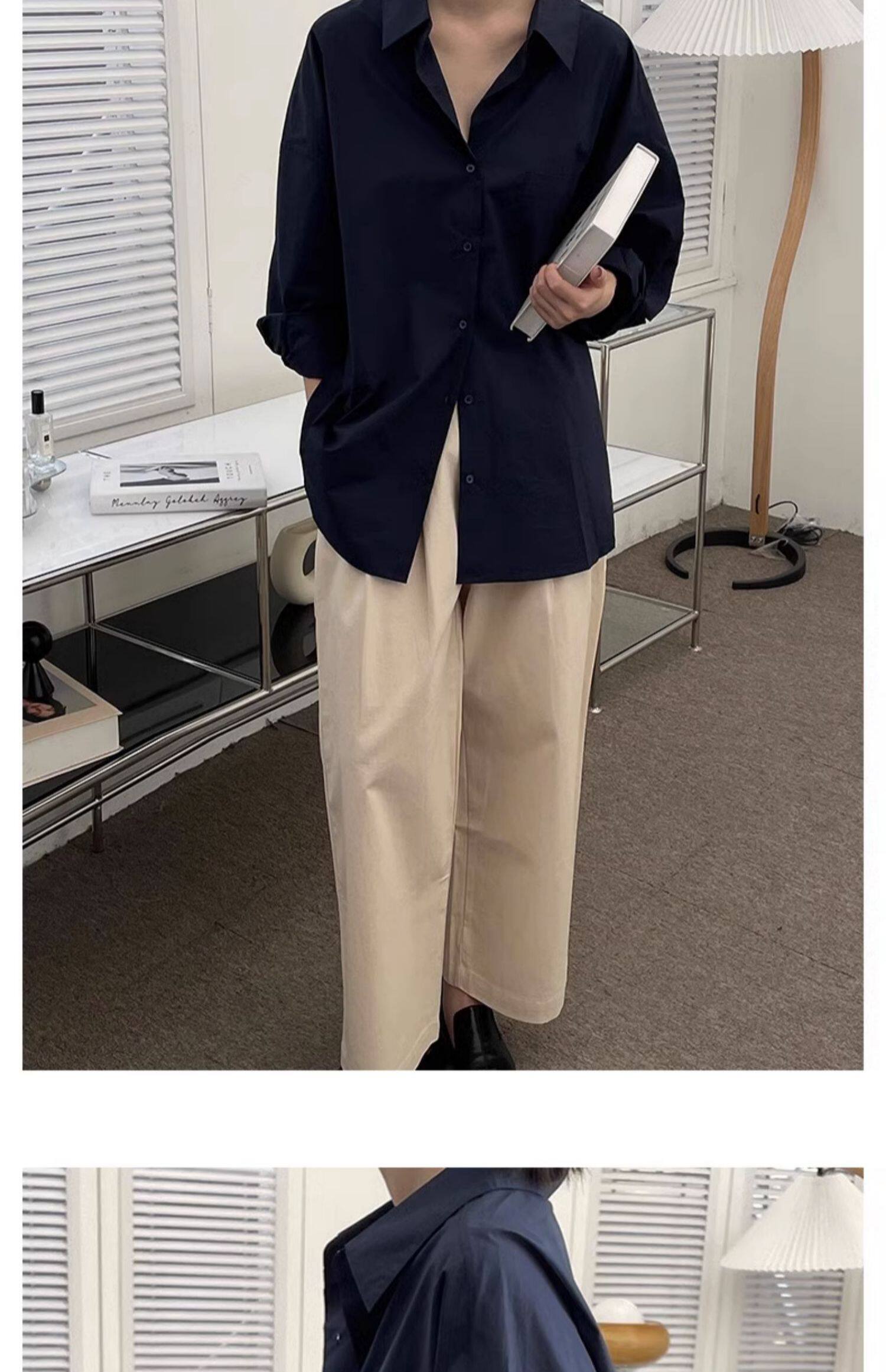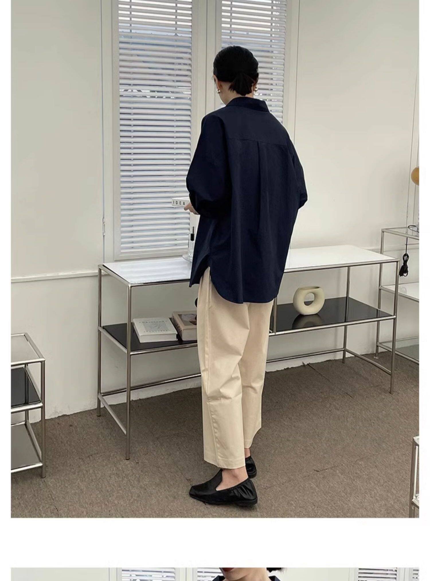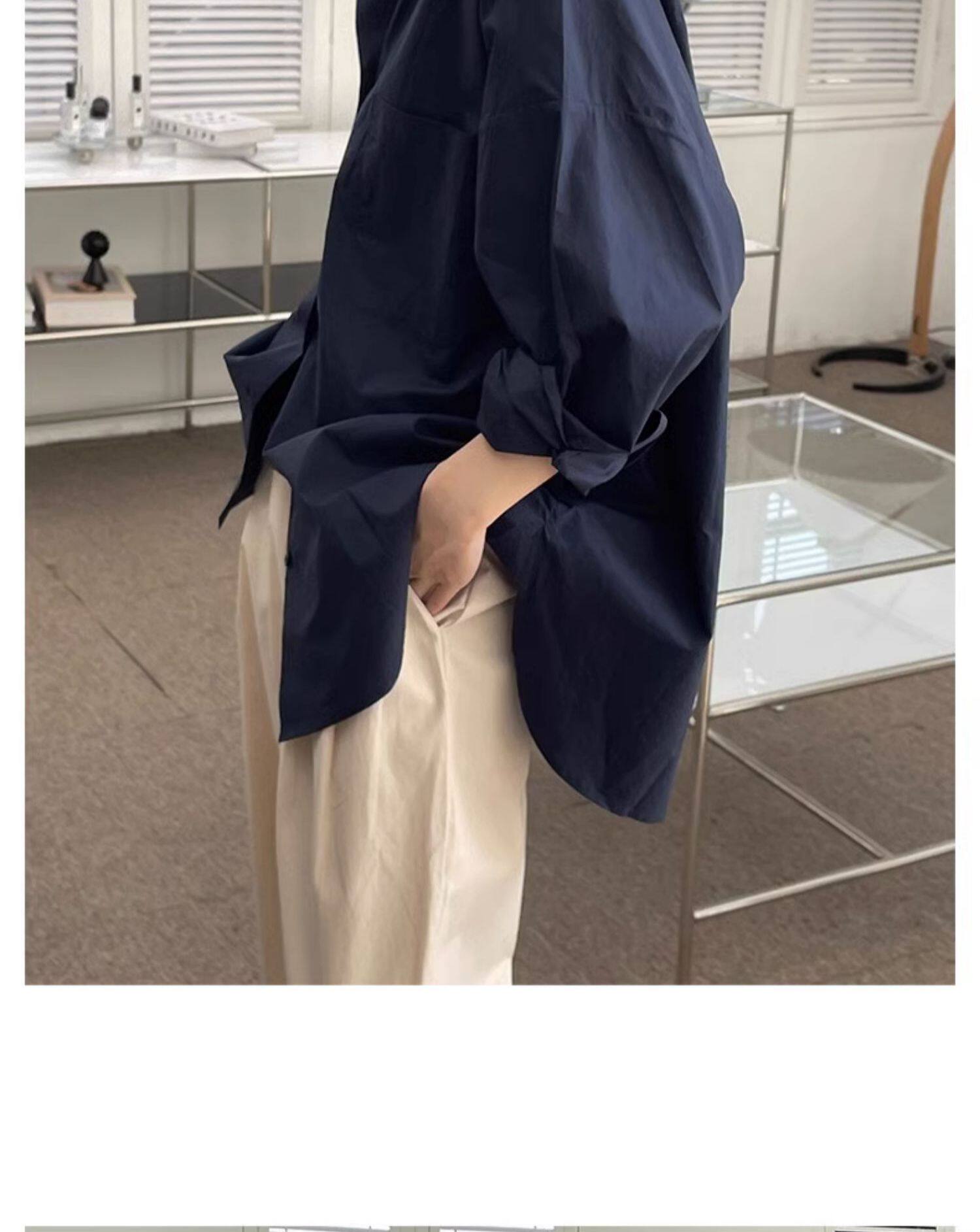 藏藍襯衫外套女慵懶chic韓版春裝寬鬆小衆襯衣廓形設計感休閒上衣