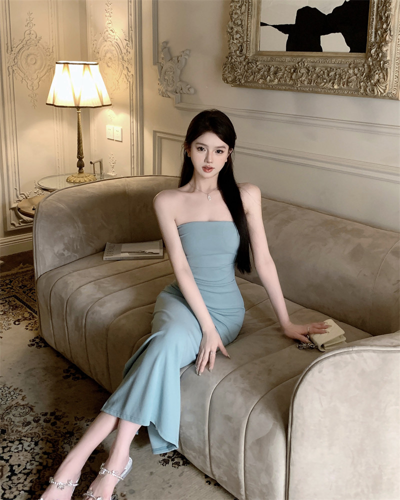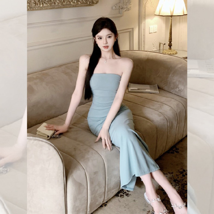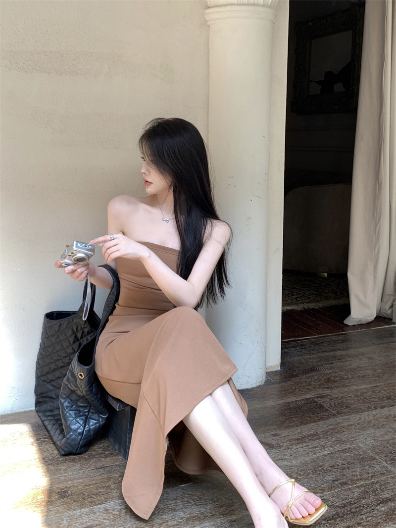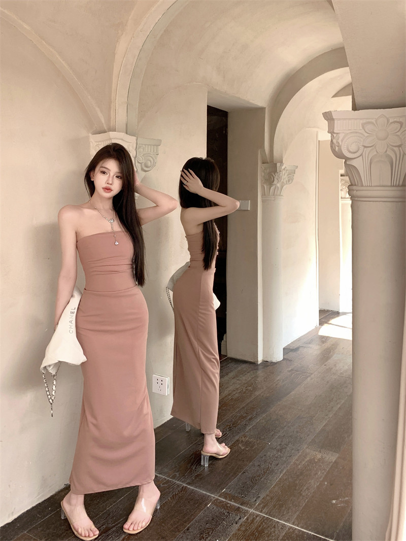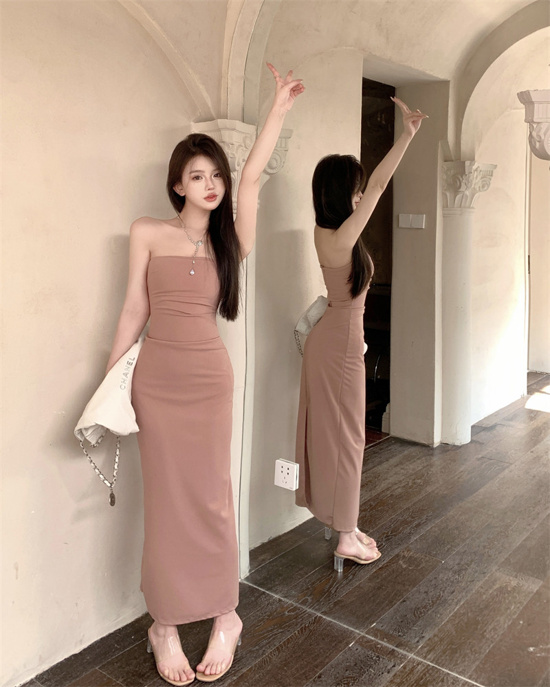 叛逆千金風抽褶彈力抹胸連衣裙2025新款法式開叉包臀長裙子女夏季