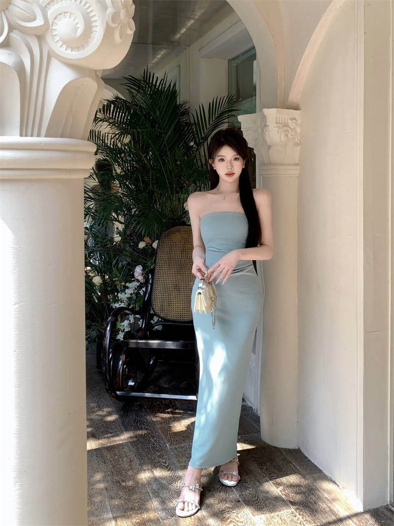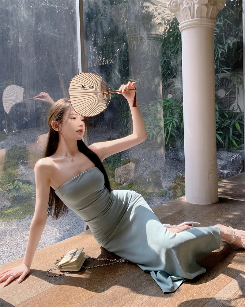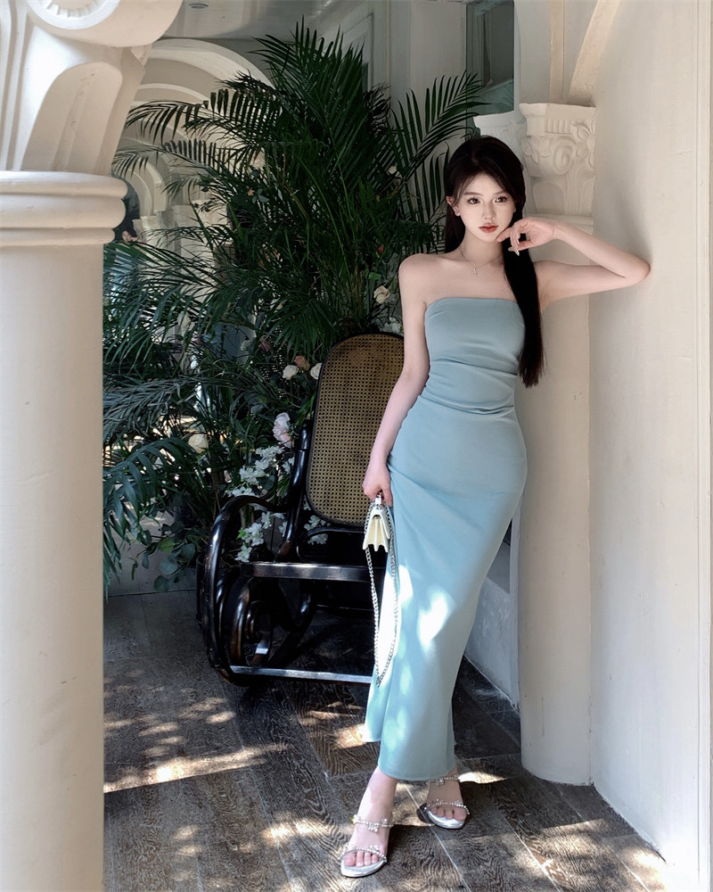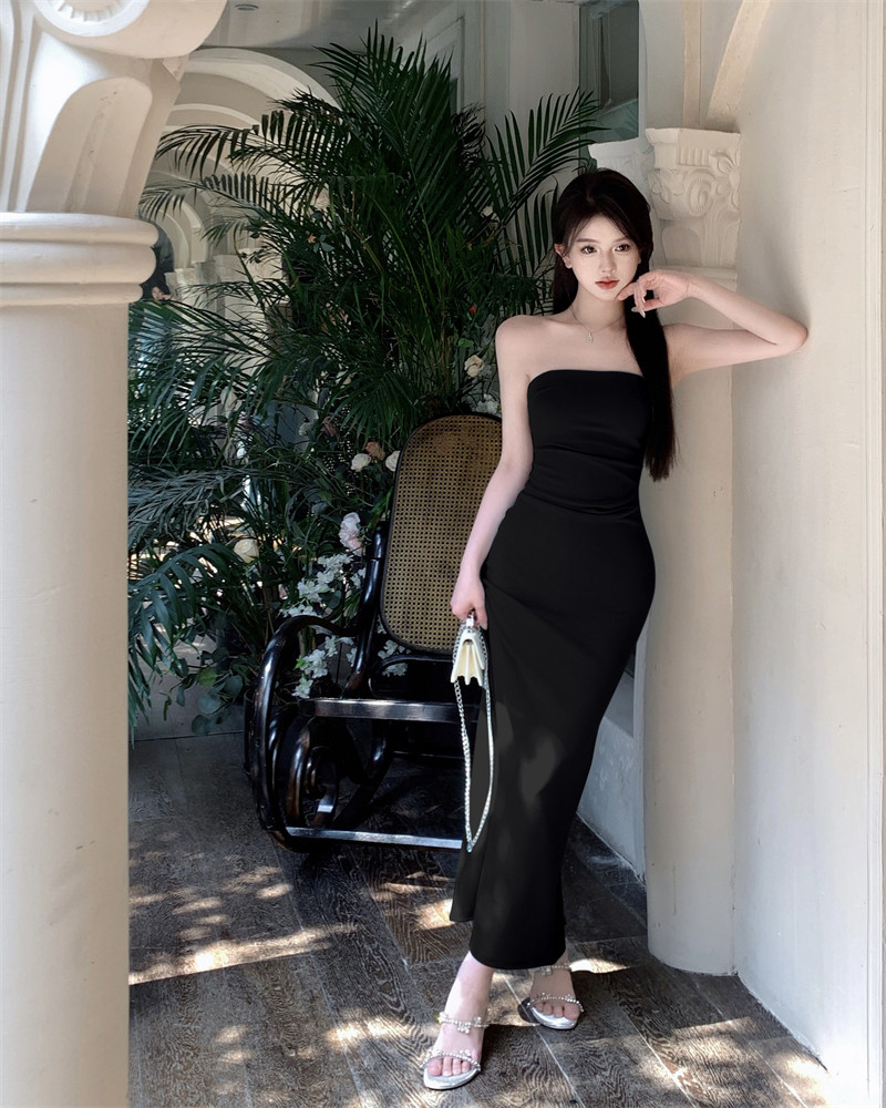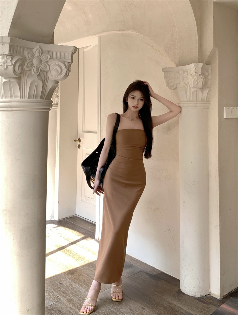 叛逆千金風抽褶彈力抹胸連衣裙2025新款法式開叉包臀長裙子女夏季