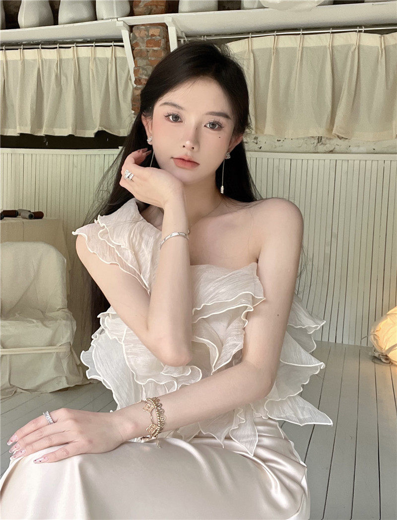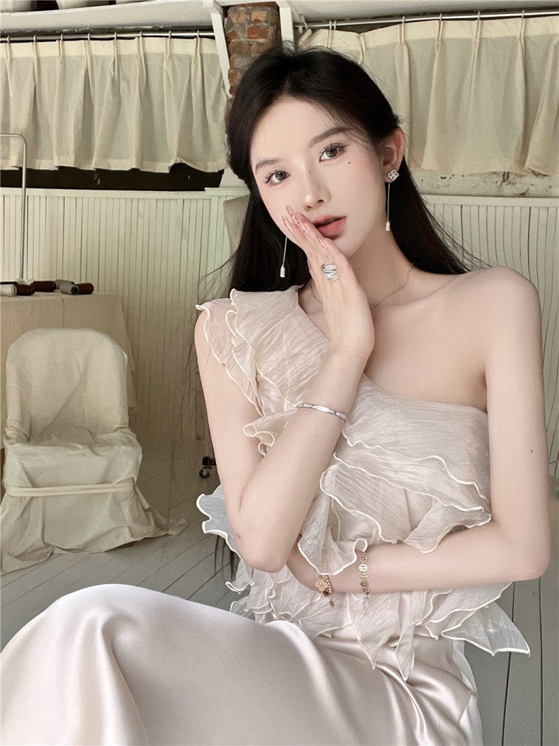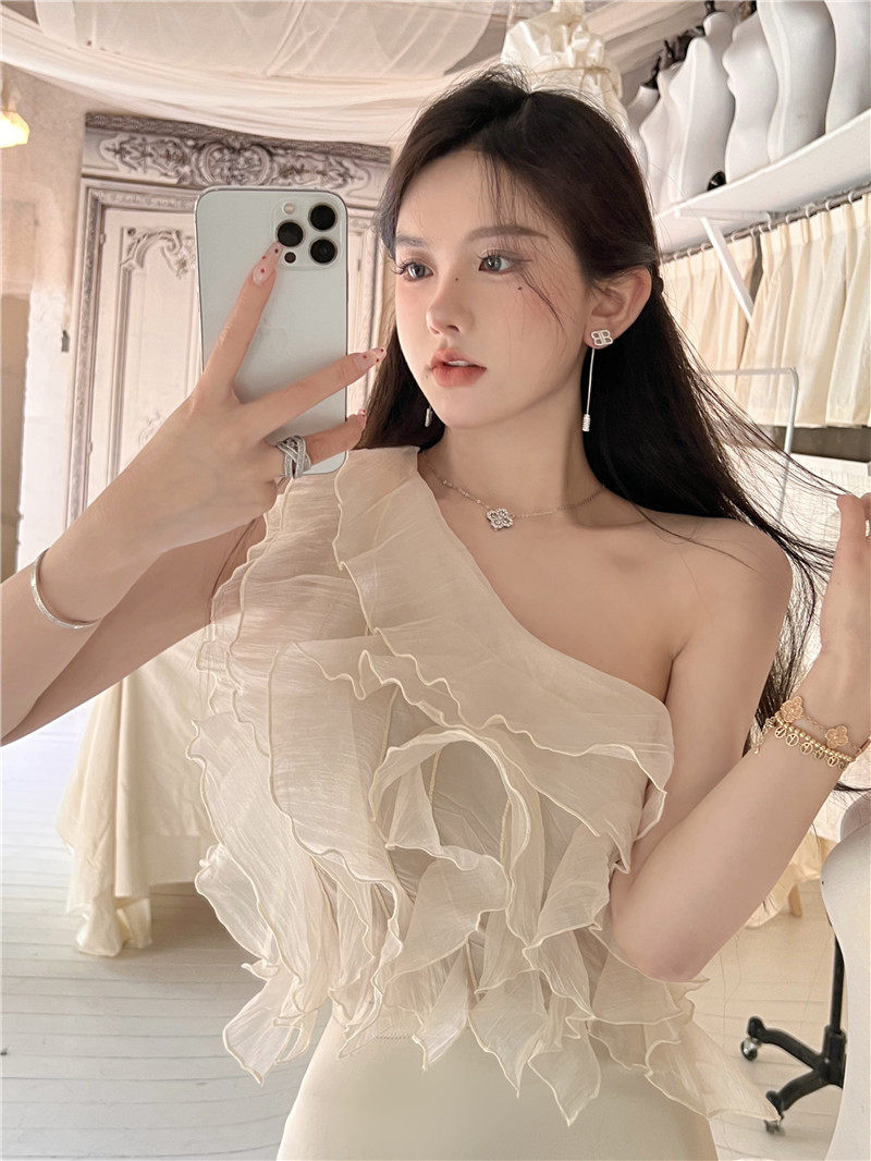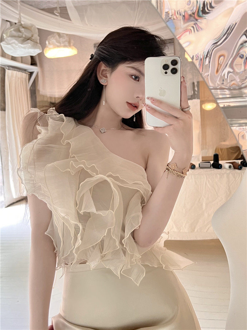 yaoxiaojie/姚小姐荷葉邊雪紡衫女夏季設計感小衆無袖斜肩上衣