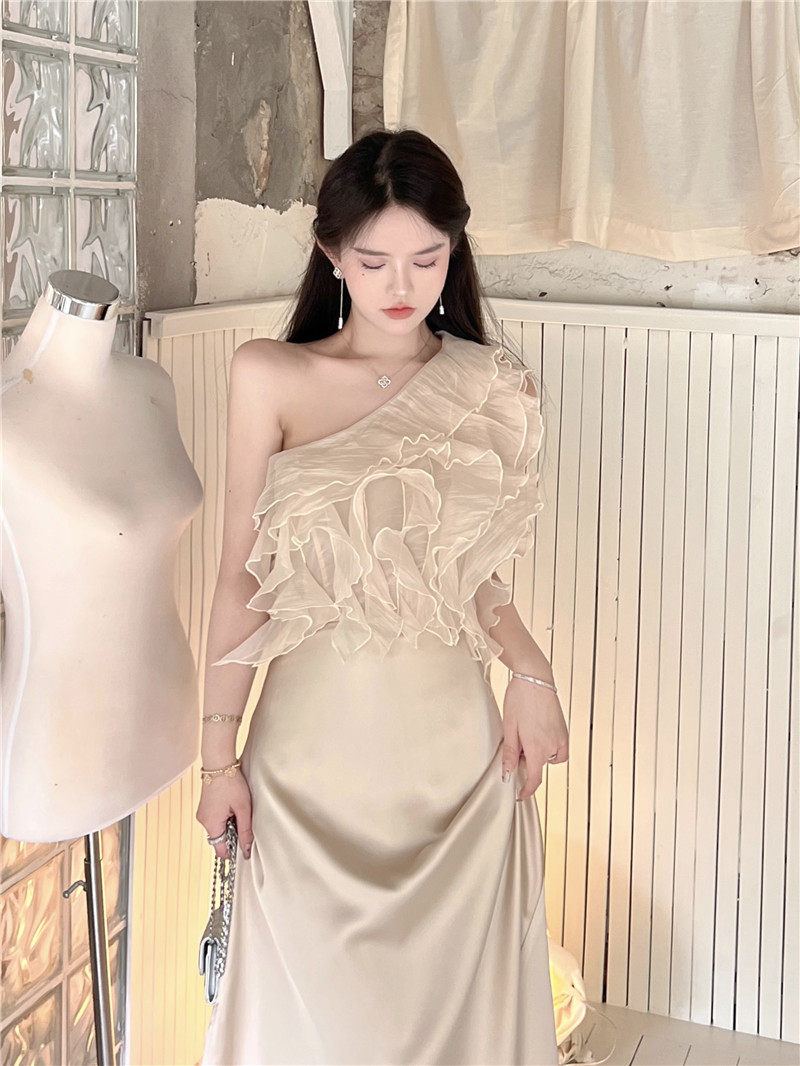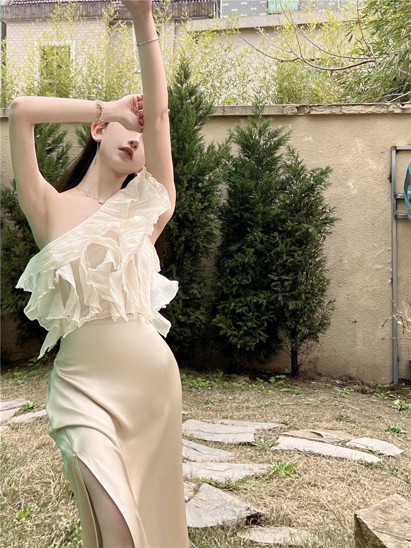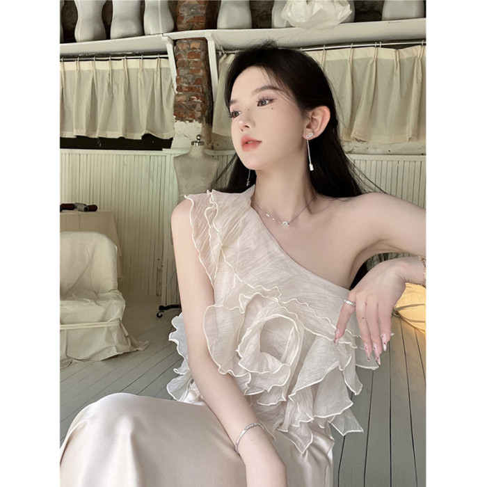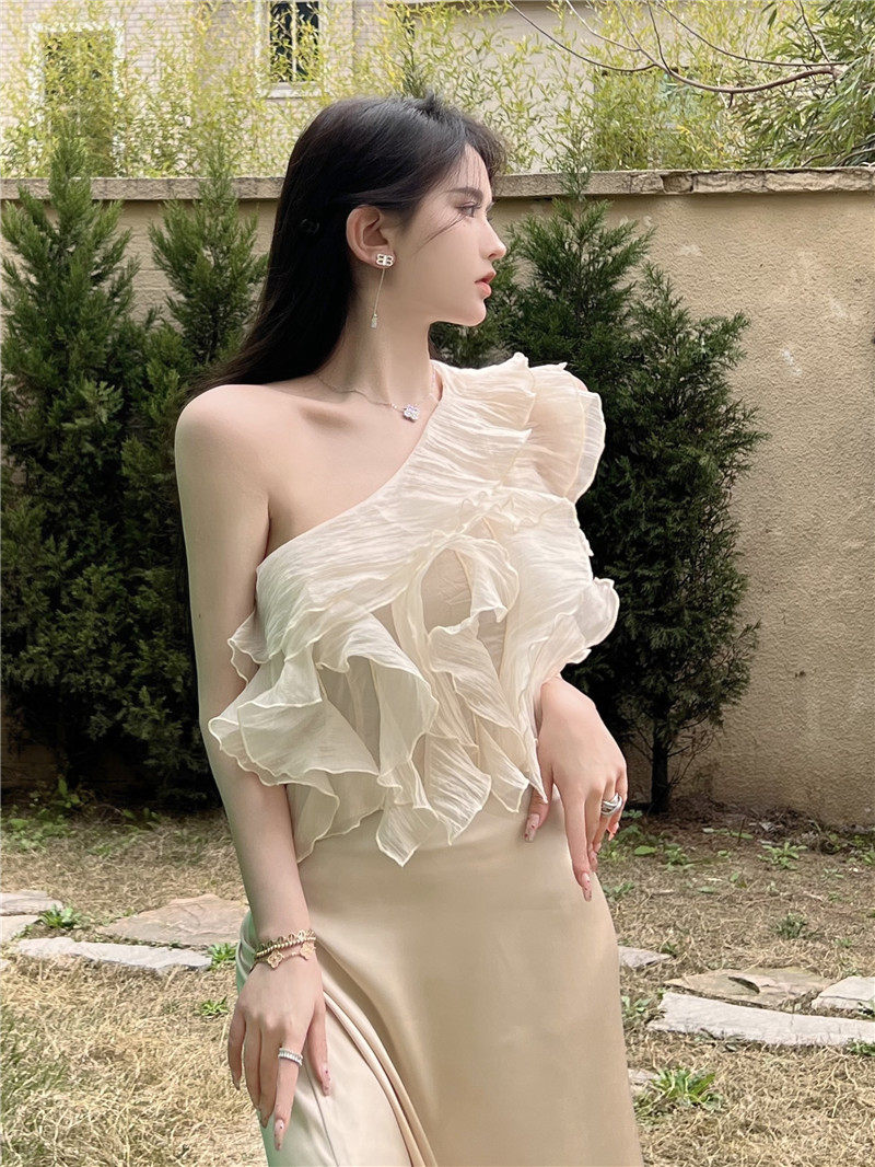 yaoxiaojie/姚小姐荷葉邊雪紡衫女夏季設計感小衆無袖斜肩上衣