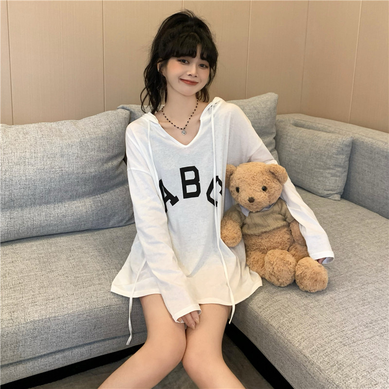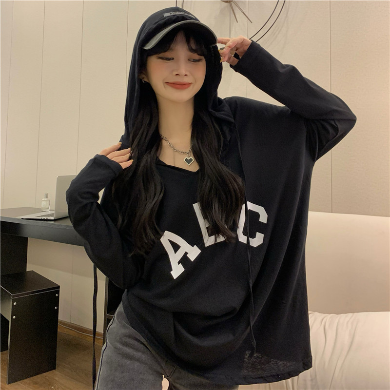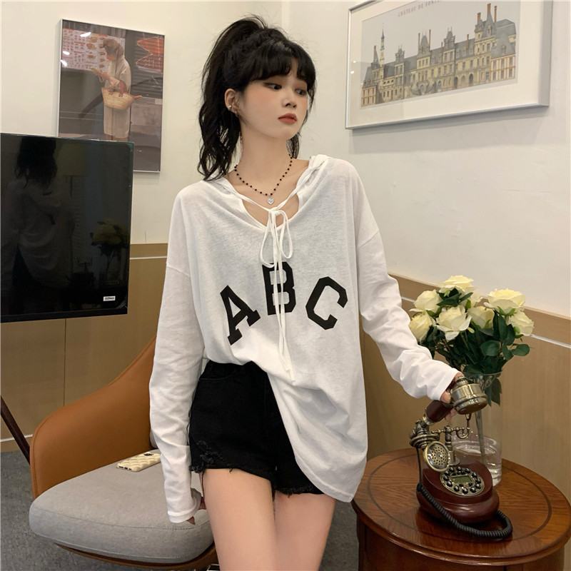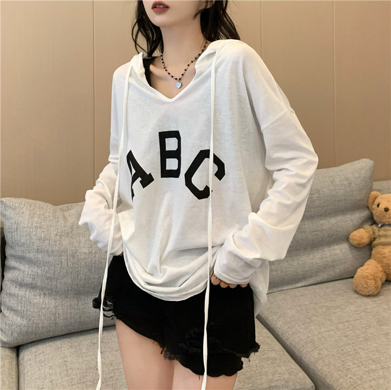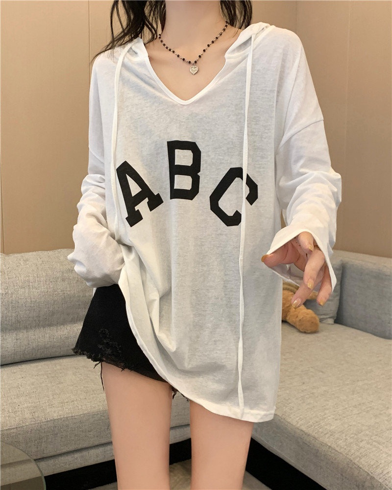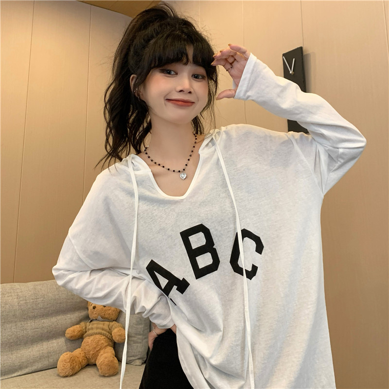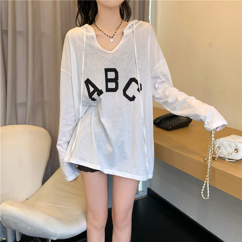 ABC字母印花連帽防曬T恤女夏季2022年新款白色寬鬆長袖薄款上衣