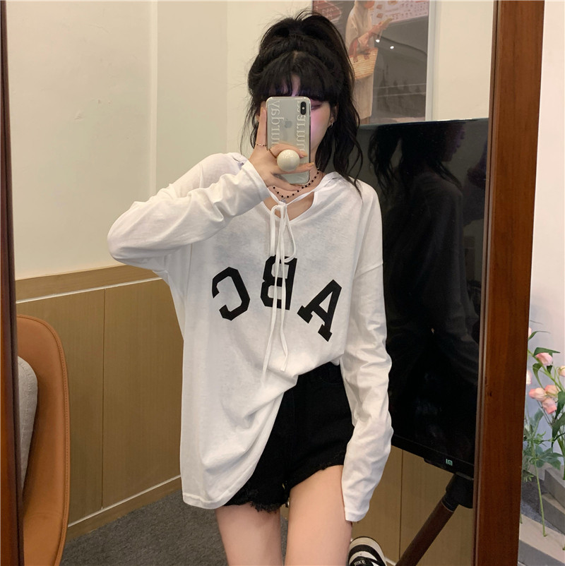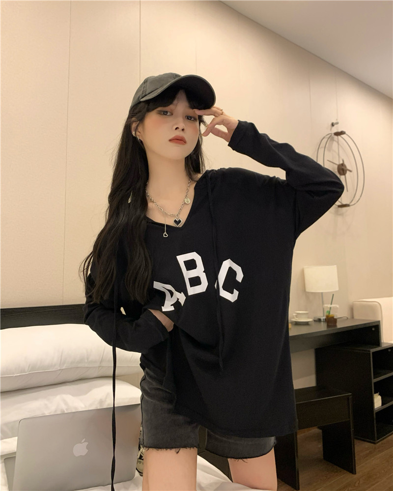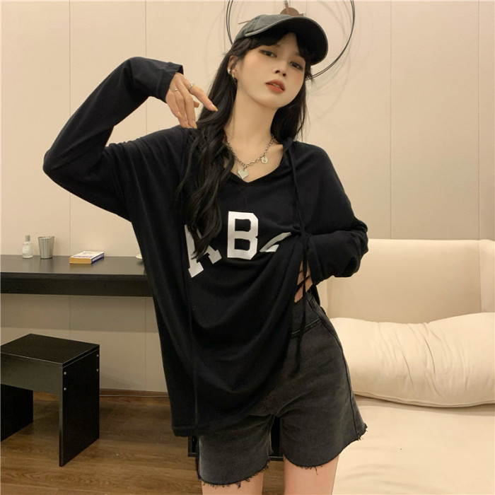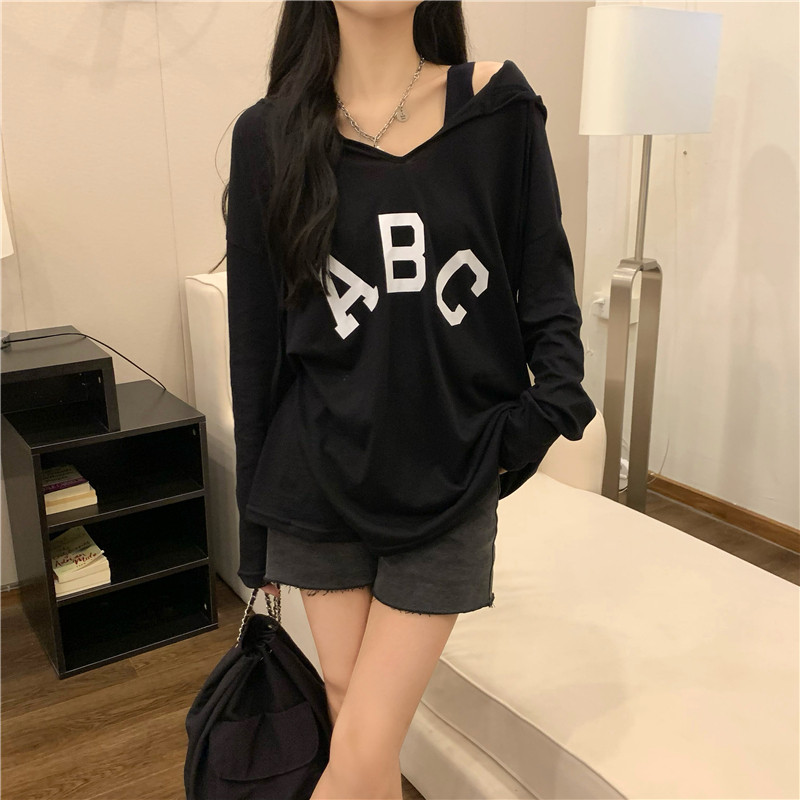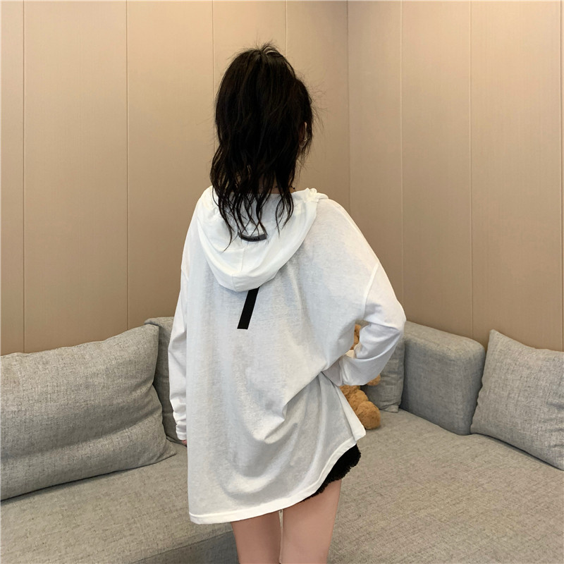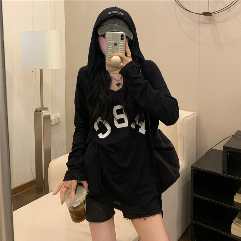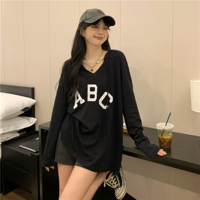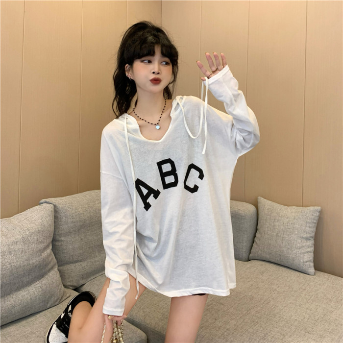 ABC字母印花連帽防曬T恤女夏季2022年新款白色寬鬆長袖薄款上衣