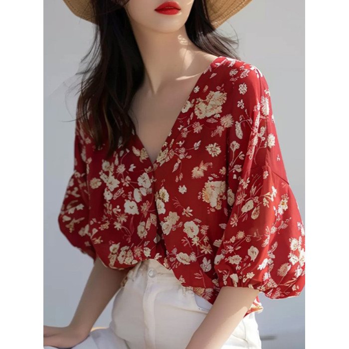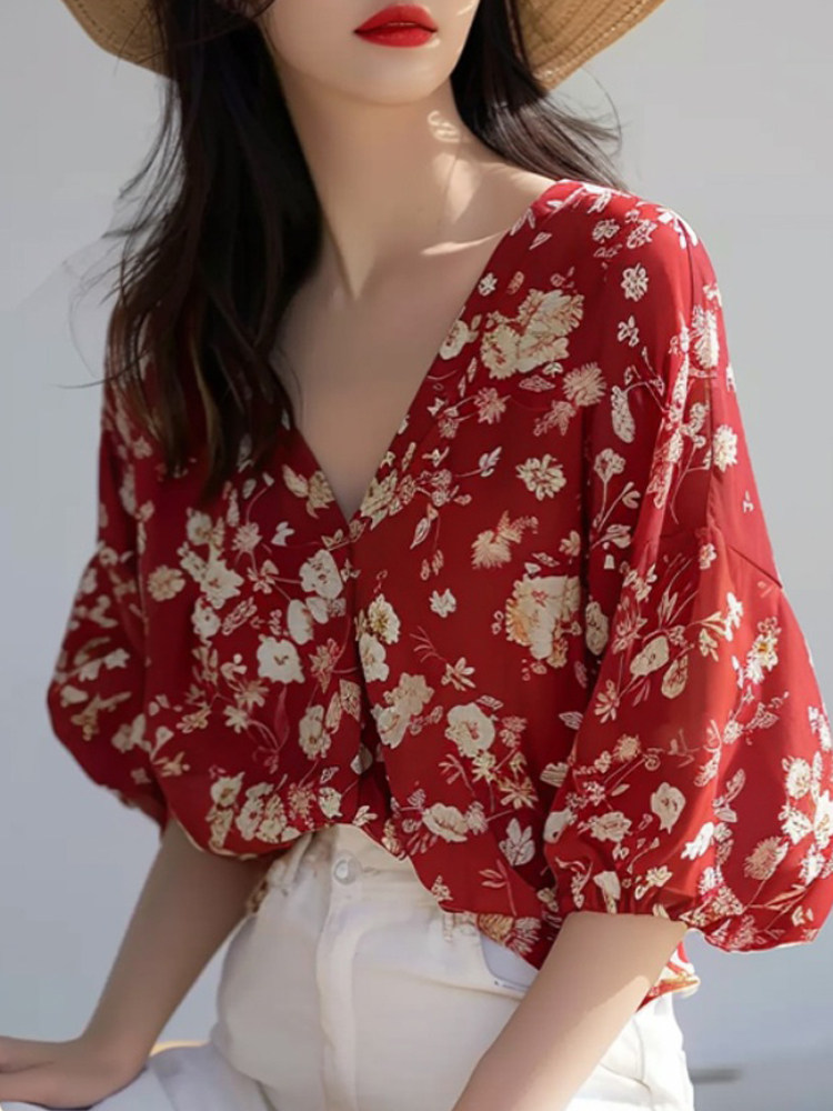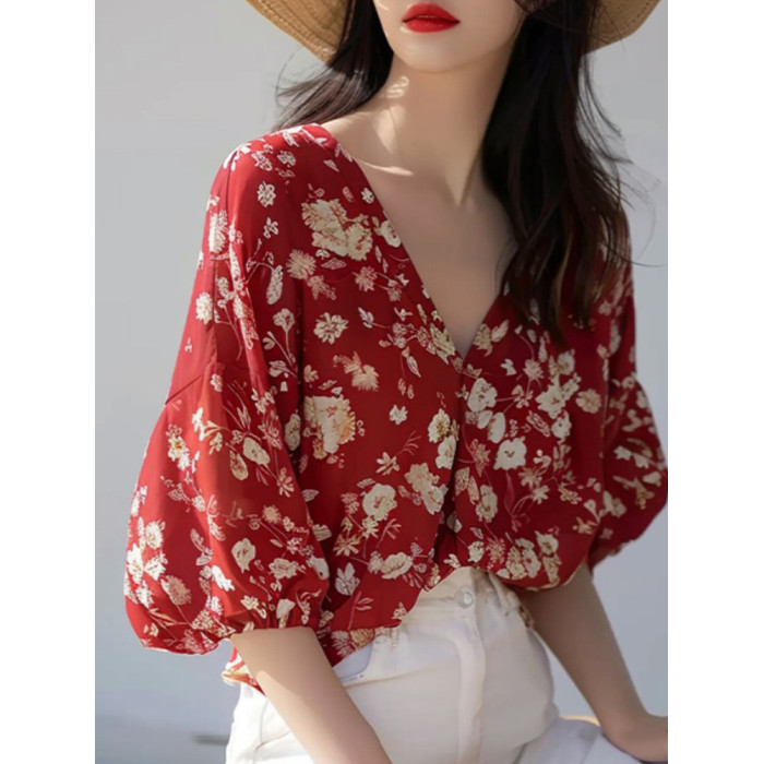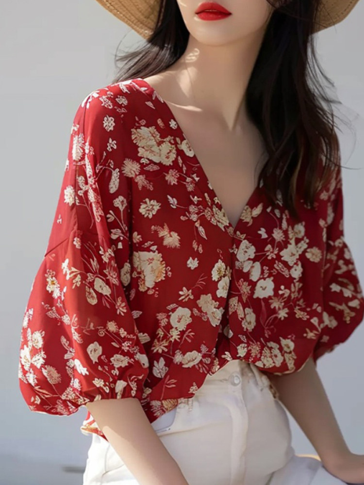 法式優雅絕美超好看碎花V領襯衫女夏季新款時尚別致減齡小衆襯衣