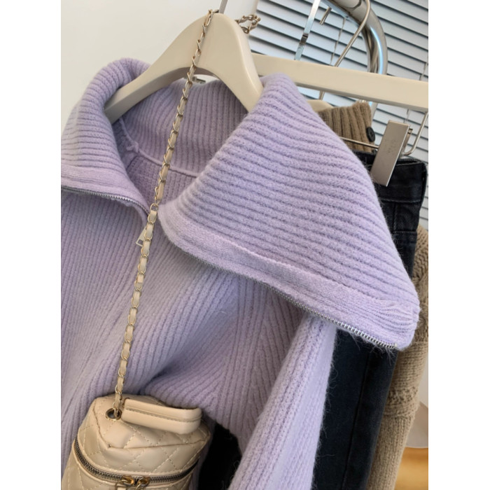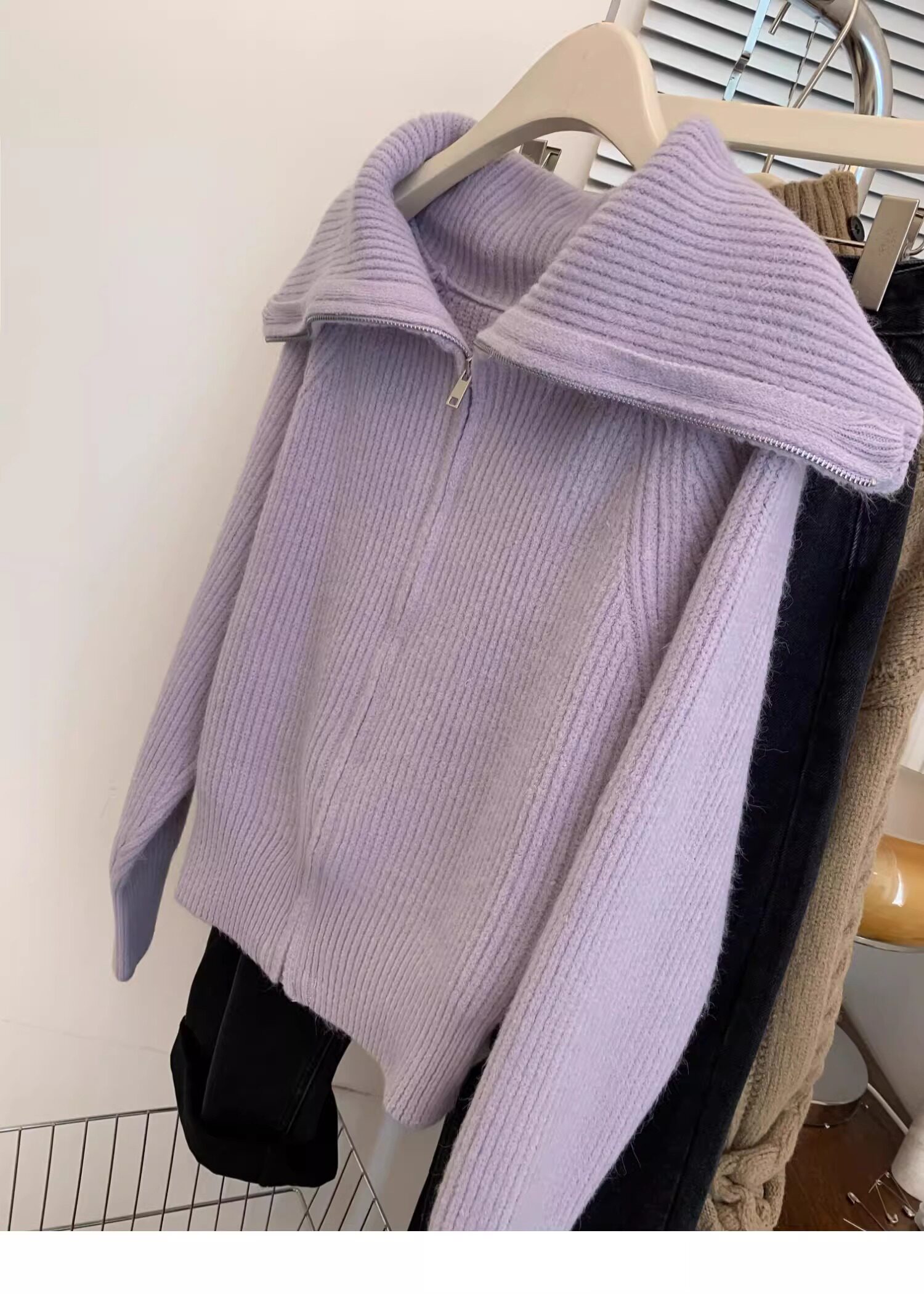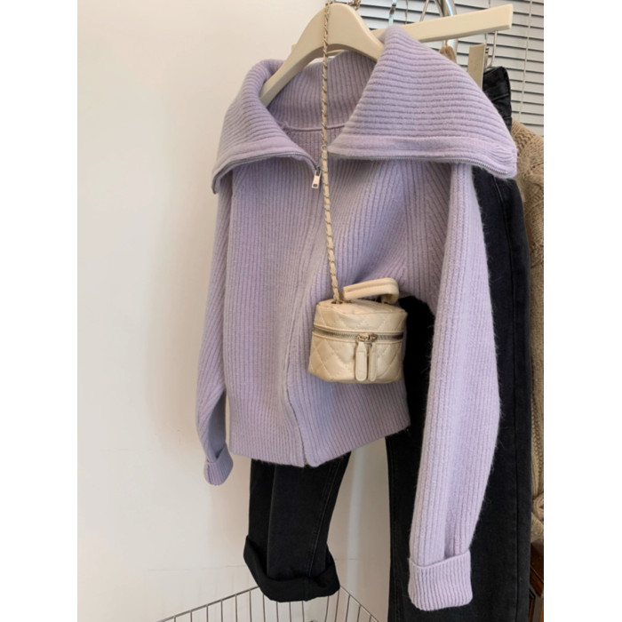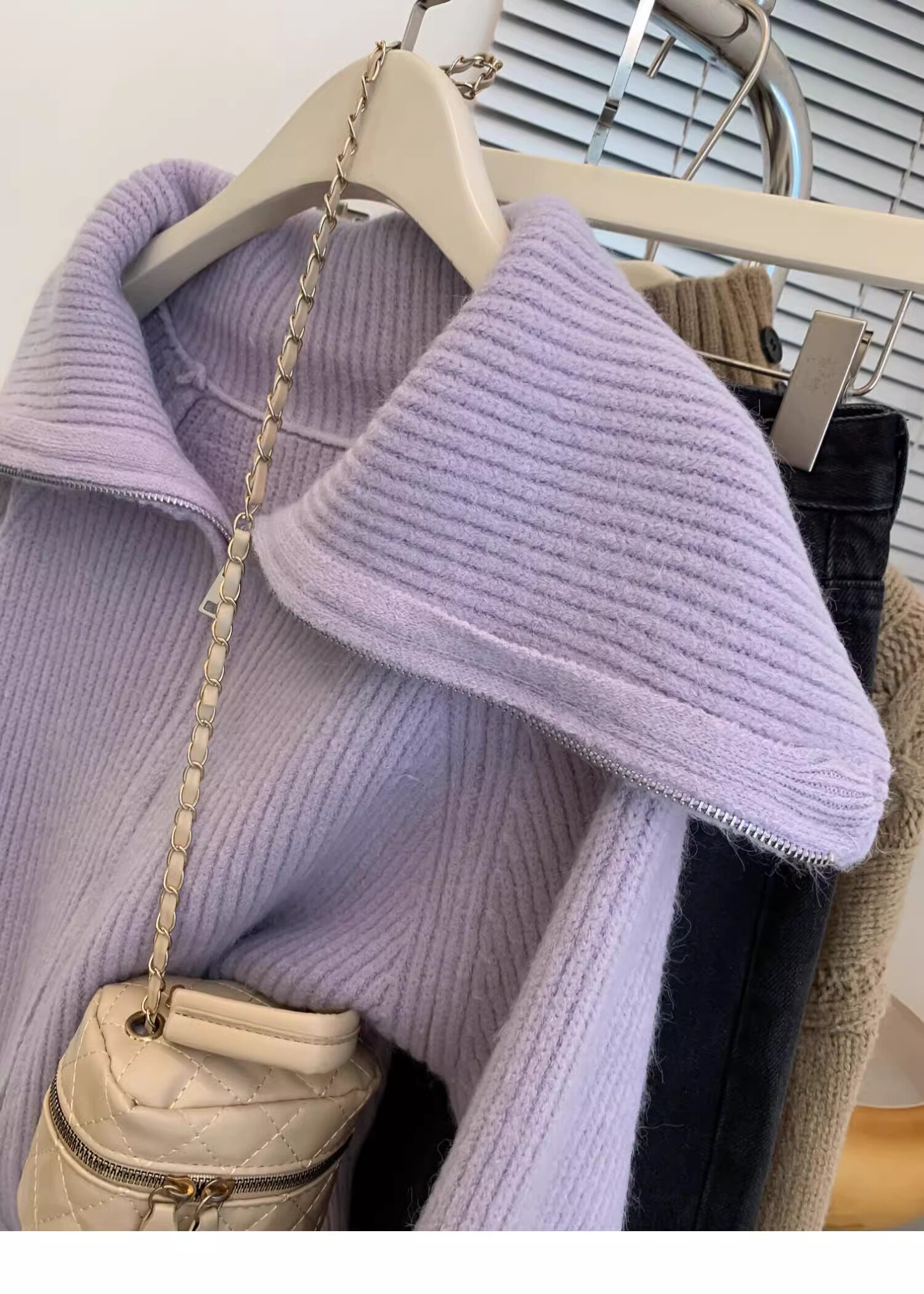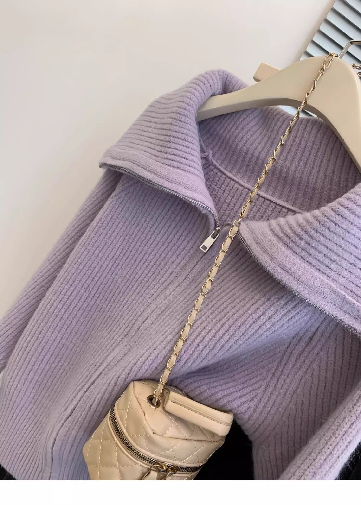 廣州十三行高貨紫色海軍領拉鍊毛衣外套女秋冬氣質慵懶風針織開衫