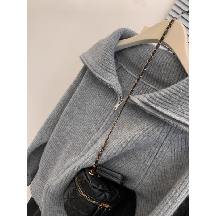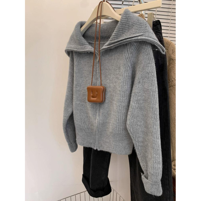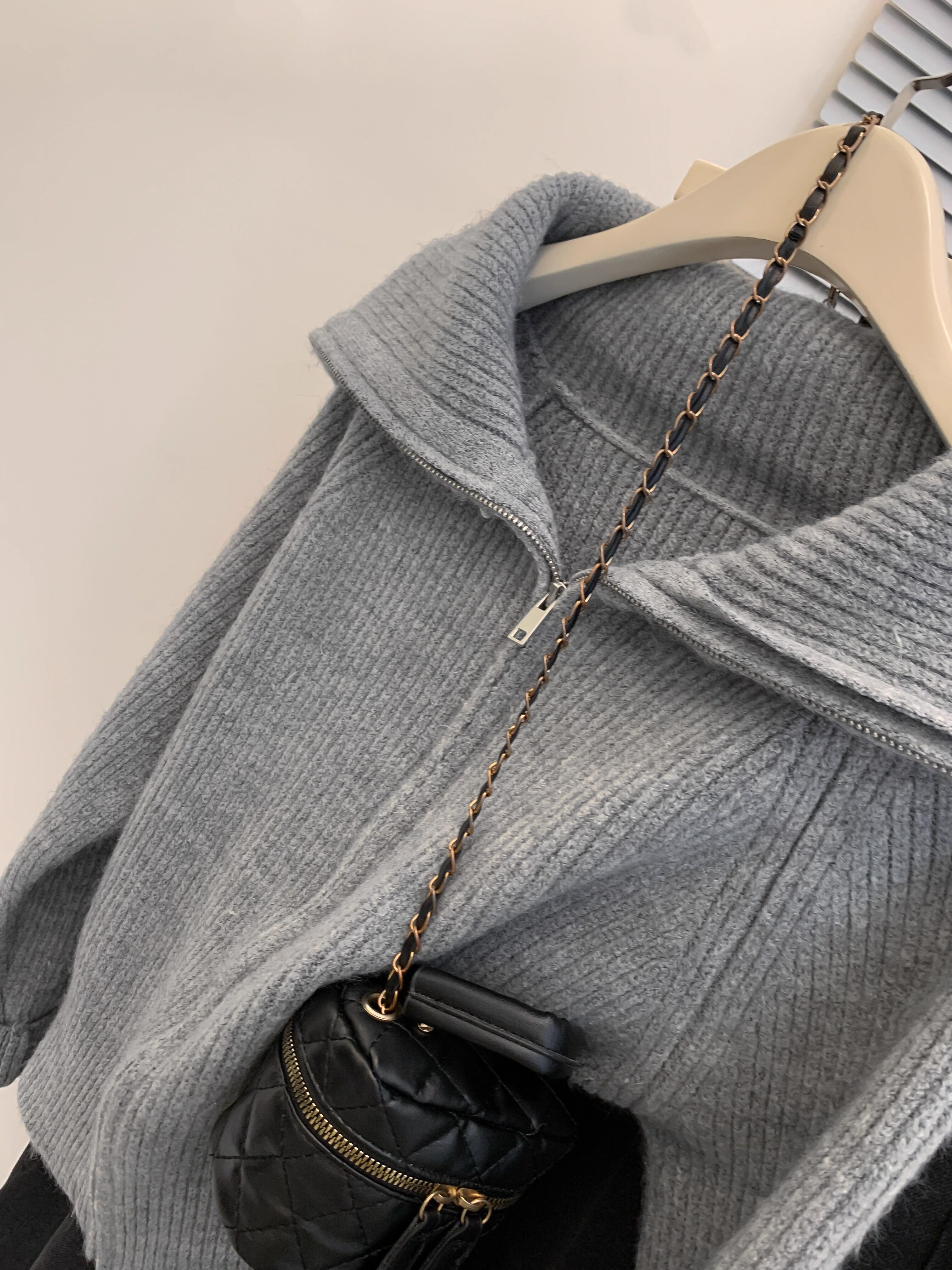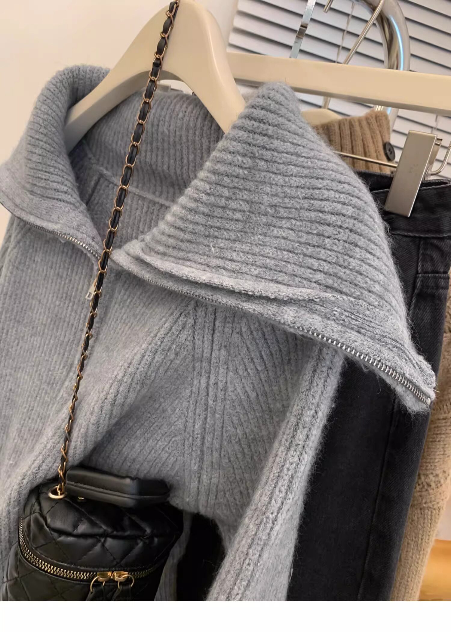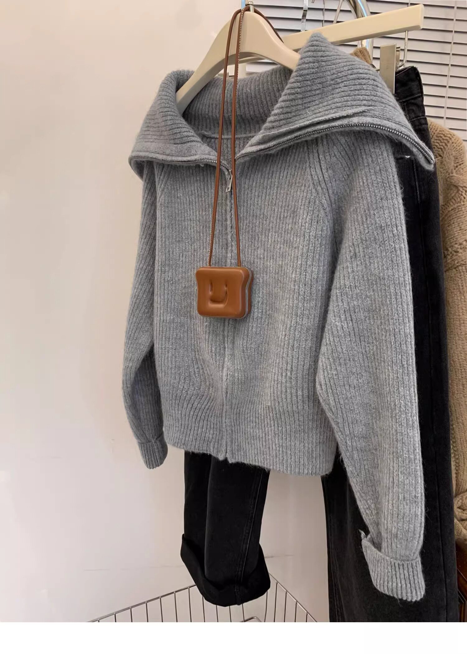 廣州十三行高貨紫色海軍領拉鍊毛衣外套女秋冬氣質慵懶風針織開衫