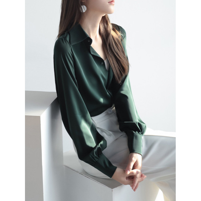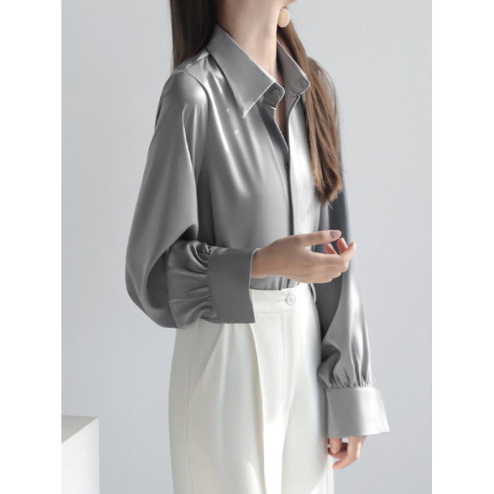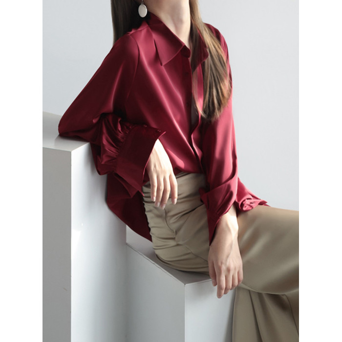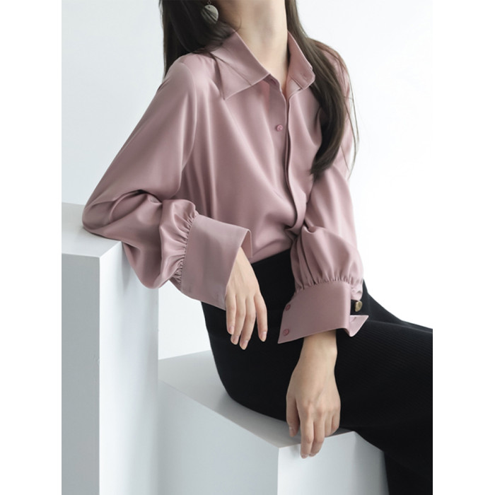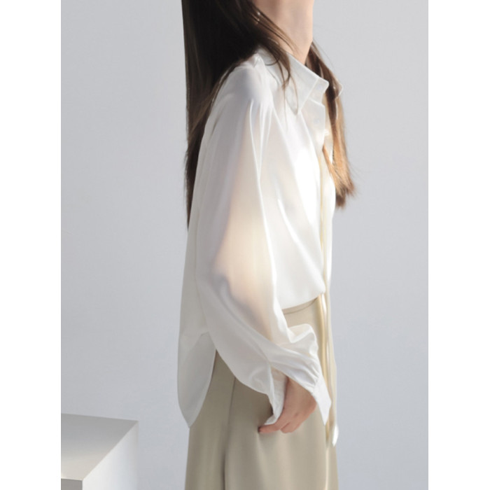 法式別致緞面襯衫上衣女春秋新款高級設計感小衆簡約氣質純色襯衣