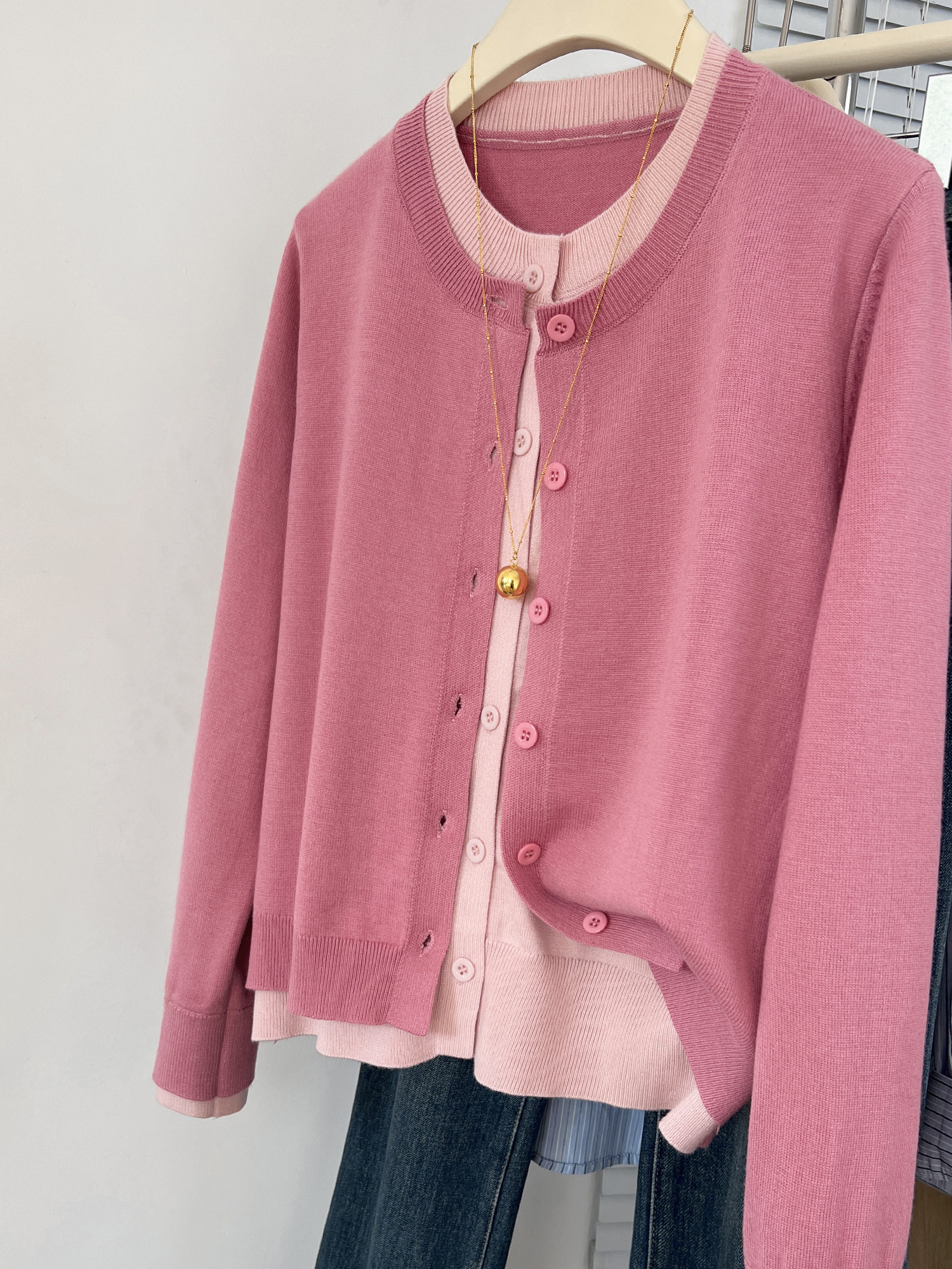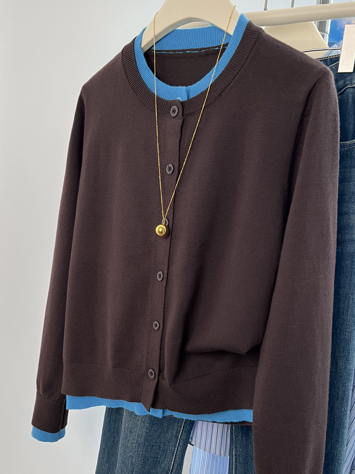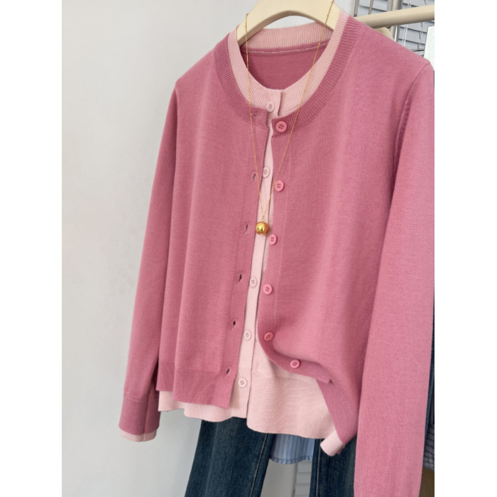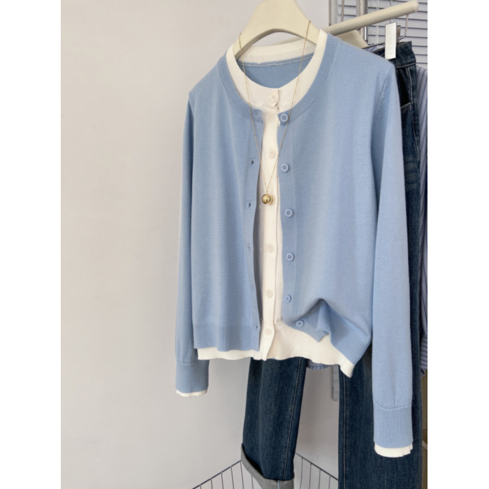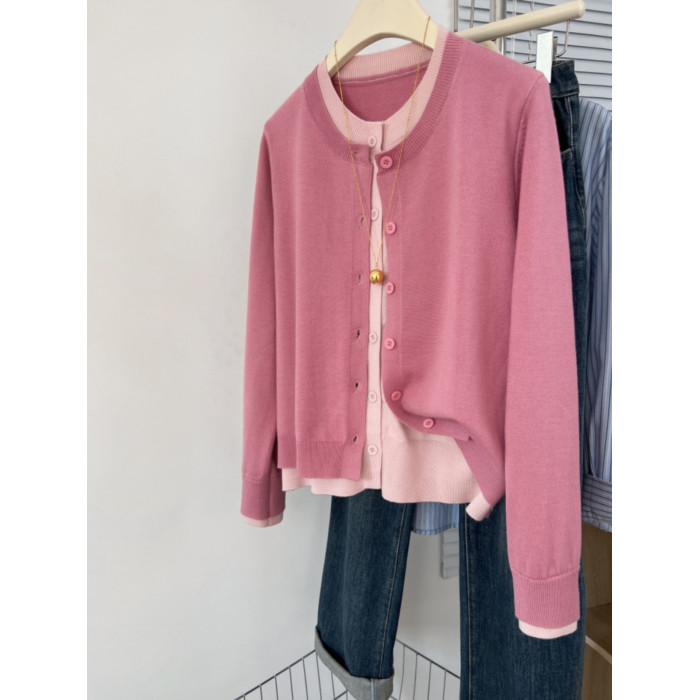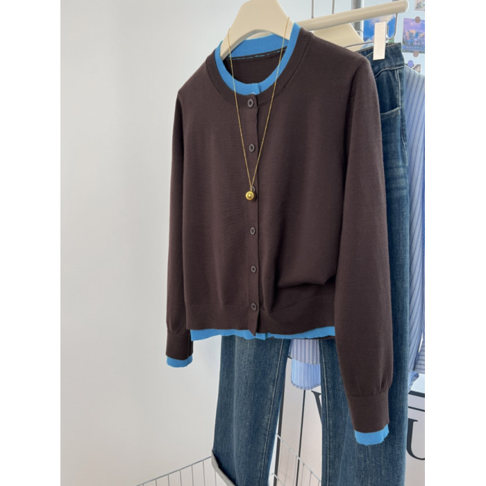 剪標大牌尾貨撞色假兩件圓領針織開衫女秋冬寬鬆休閒毛衣外套