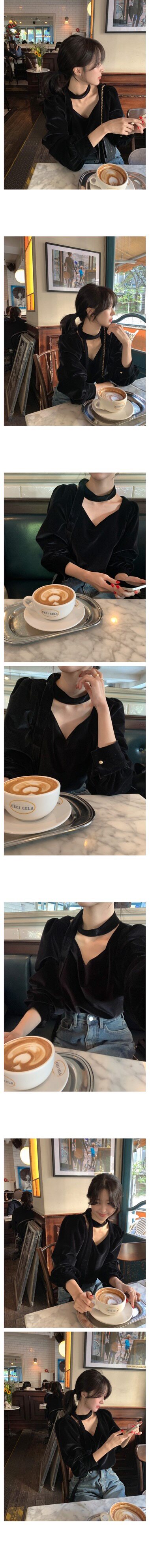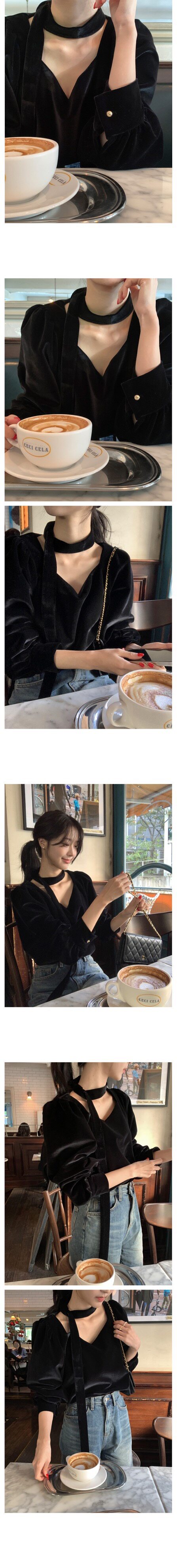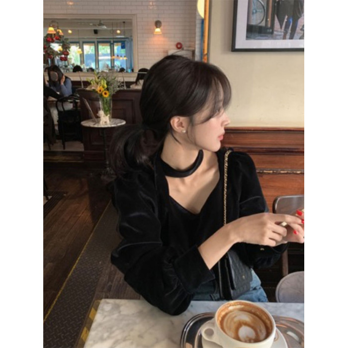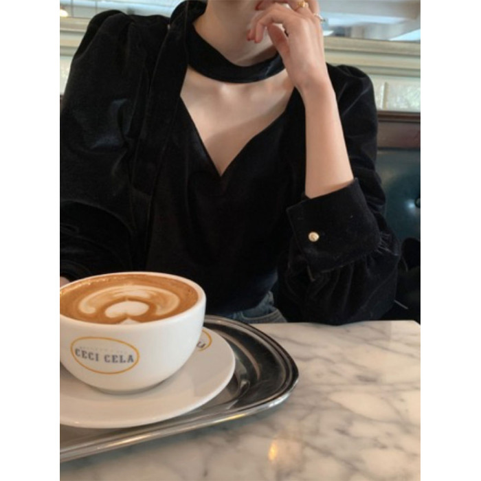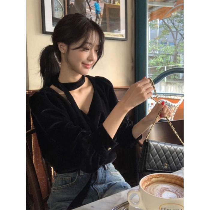 法式高級感洋氣氣質百搭長袖掛脖V領別致獨特黑色絲絨襯衫上衣女